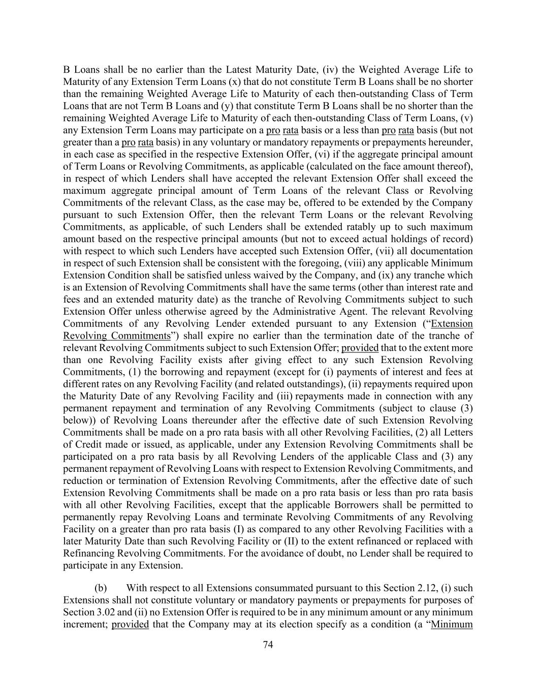 74 B Loans shall be no earlier than the Latest Maturity Date, (iv) the Weighted Average Life to Maturity of any Extension Term Loans (x) that do not constitute Term B Loans shall be no shorter than the remaining Weighted Average Life to Maturity of each then-outstanding Class of Term Loans that are not Term B Loans and (y) that constitute Term B Loans shall be no shorter than the remaining Weighted Average Life to Maturity of each then-outstanding Class of Term Loans, (v) any Extension Term Loans may participate on a pro rata basis or a less than pro rata basis (but not greater than a pro rata basis) in any voluntary or mandatory repayments or prepayments hereunder, in each case as specified in the respective Extension Offer, (vi) if the aggregate principal amount of Term Loans or Revolving Commitments, as applicable (calculated on the face amount thereof), in respect of which Lenders shall have accepted the relevant Extension Offer shall exceed the maximum aggregate principal amount of Term Loans of the relevant Class or Revolving Commitments of the relevant Class, as the case may be, offered to be extended by the Company pursuant to such Extension Offer, then the relevant Term Loans or the relevant Revolving Commitments, as applicable, of such Lenders shall be extended ratably up to such maximum amount based on the respective principal amounts (but not to exceed actual holdings of record) with respect to which such Lenders have accepted such Extension Offer, (vii) all documentation in respect of such Extension shall be consistent with the foregoing, (viii) any applicable Minimum Extension Condition shall be satisfied unless waived by the Company, and (ix) any tranche which is an Extension of Revolving Commitments shall have the same terms (other than interest rate and fees and an extended maturity date) as the tranche of Revolving Commitments subject to such Extension Offer unless otherwise agreed by the Administrative Agent. The relevant Revolving Commitments of any Revolving Lender extended pursuant to any Extension (“Extension Revolving Commitments”) shall expire no earlier than the termination date of the tranche of relevant Revolving Commitments subject to such Extension Offer; provided that to the extent more than one Revolving Facility exists after giving effect to any such Extension Revolving Commitments, (1) the borrowing and repayment (except for (i) payments of interest and fees at different rates on any Revolving Facility (and related outstandings), (ii) repayments required upon the Maturity Date of any Revolving Facility and (iii) repayments made in connection with any permanent repayment and termination of any Revolving Commitments (subject to clause (3) below)) of Revolving Loans thereunder after the effective date of such Extension Revolving Commitments shall be made on a pro rata basis with all other Revolving Facilities, (2) all Letters of Credit made or issued, as applicable, under any Extension Revolving Commitments shall be participated on a pro rata basis by all Revolving Lenders of the applicable Class and (3) any permanent repayment of Revolving Loans with respect to Extension Revolving Commitments, and reduction or termination of Extension Revolving Commitments, after the effective date of such Extension Revolving Commitments shall be made on a pro rata basis or less than pro rata basis with all other Revolving Facilities, except that the applicable Borrowers shall be permitted to permanently repay Revolving Loans and terminate Revolving Commitments of any Revolving Facility on a greater than pro rata basis (I) as compared to any other Revolving Facilities with a later Maturity Date than such Revolving Facility or (II) to the extent refinanced or replaced with Refinancing Revolving Commitments. For the avoidance of doubt, no Lender shall be required to participate in any Extension. (b) With respect to all Extensions consummated pursuant to this Section 2.12, (i) such Extensions shall not constitute voluntary or mandatory payments or prepayments for purposes of Section 3.02 and (ii) no Extension Offer is required to be in any minimum amount or any minimum increment; provided that the Company may at its election specify as a condition (a “Minimum
