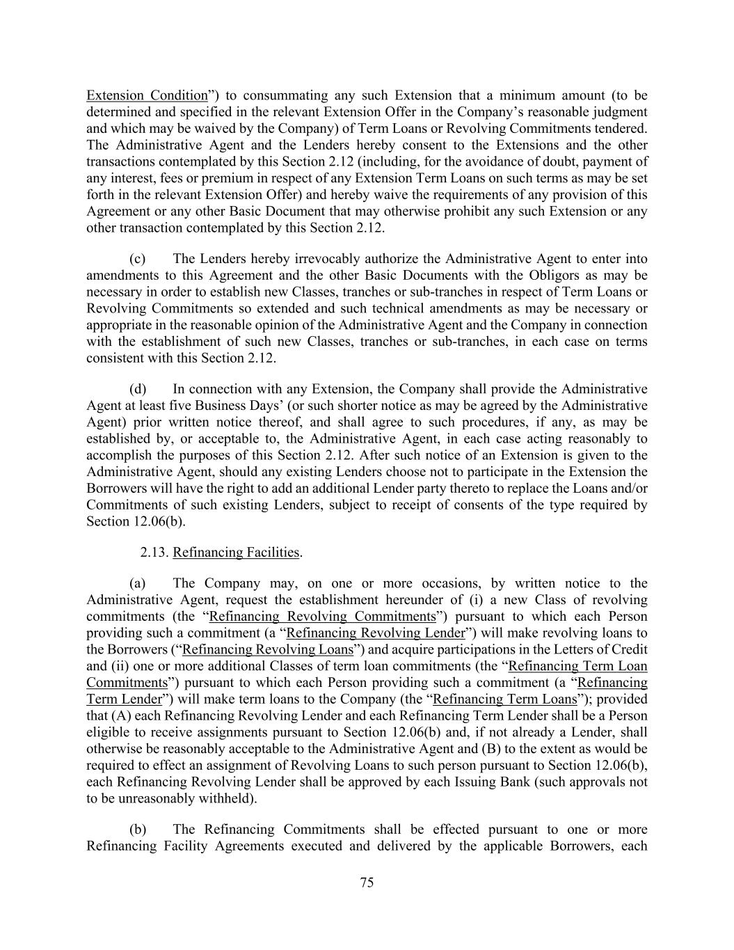 75 Extension Condition”) to consummating any such Extension that a minimum amount (to be determined and specified in the relevant Extension Offer in the Company’s reasonable judgment and which may be waived by the Company) of Term Loans or Revolving Commitments tendered. The Administrative Agent and the Lenders hereby consent to the Extensions and the other transactions contemplated by this Section 2.12 (including, for the avoidance of doubt, payment of any interest, fees or premium in respect of any Extension Term Loans on such terms as may be set forth in the relevant Extension Offer) and hereby waive the requirements of any provision of this Agreement or any other Basic Document that may otherwise prohibit any such Extension or any other transaction contemplated by this Section 2.12. (c) The Lenders hereby irrevocably authorize the Administrative Agent to enter into amendments to this Agreement and the other Basic Documents with the Obligors as may be necessary in order to establish new Classes, tranches or sub-tranches in respect of Term Loans or Revolving Commitments so extended and such technical amendments as may be necessary or appropriate in the reasonable opinion of the Administrative Agent and the Company in connection with the establishment of such new Classes, tranches or sub-tranches, in each case on terms consistent with this Section 2.12. (d) In connection with any Extension, the Company shall provide the Administrative Agent at least five Business Days’ (or such shorter notice as may be agreed by the Administrative Agent) prior written notice thereof, and shall agree to such procedures, if any, as may be established by, or acceptable to, the Administrative Agent, in each case acting reasonably to accomplish the purposes of this Section 2.12. After such notice of an Extension is given to the Administrative Agent, should any existing Lenders choose not to participate in the Extension the Borrowers will have the right to add an additional Lender party thereto to replace the Loans and/or Commitments of such existing Lenders, subject to receipt of consents of the type required by Section 12.06(b). 2.13. Refinancing Facilities. (a) The Company may, on one or more occasions, by written notice to the Administrative Agent, request the establishment hereunder of (i) a new Class of revolving commitments (the “Refinancing Revolving Commitments”) pursuant to which each Person providing such a commitment (a “Refinancing Revolving Lender”) will make revolving loans to the Borrowers (“Refinancing Revolving Loans”) and acquire participations in the Letters of Credit and (ii) one or more additional Classes of term loan commitments (the “Refinancing Term Loan Commitments”) pursuant to which each Person providing such a commitment (a “Refinancing Term Lender”) will make term loans to the Company (the “Refinancing Term Loans”); provided that (A) each Refinancing Revolving Lender and each Refinancing Term Lender shall be a Person eligible to receive assignments pursuant to Section 12.06(b) and, if not already a Lender, shall otherwise be reasonably acceptable to the Administrative Agent and (B) to the extent as would be required to effect an assignment of Revolving Loans to such person pursuant to Section 12.06(b), each Refinancing Revolving Lender shall be approved by each Issuing Bank (such approvals not to be unreasonably withheld). (b) The Refinancing Commitments shall be effected pursuant to one or more Refinancing Facility Agreements executed and delivered by the applicable Borrowers, each