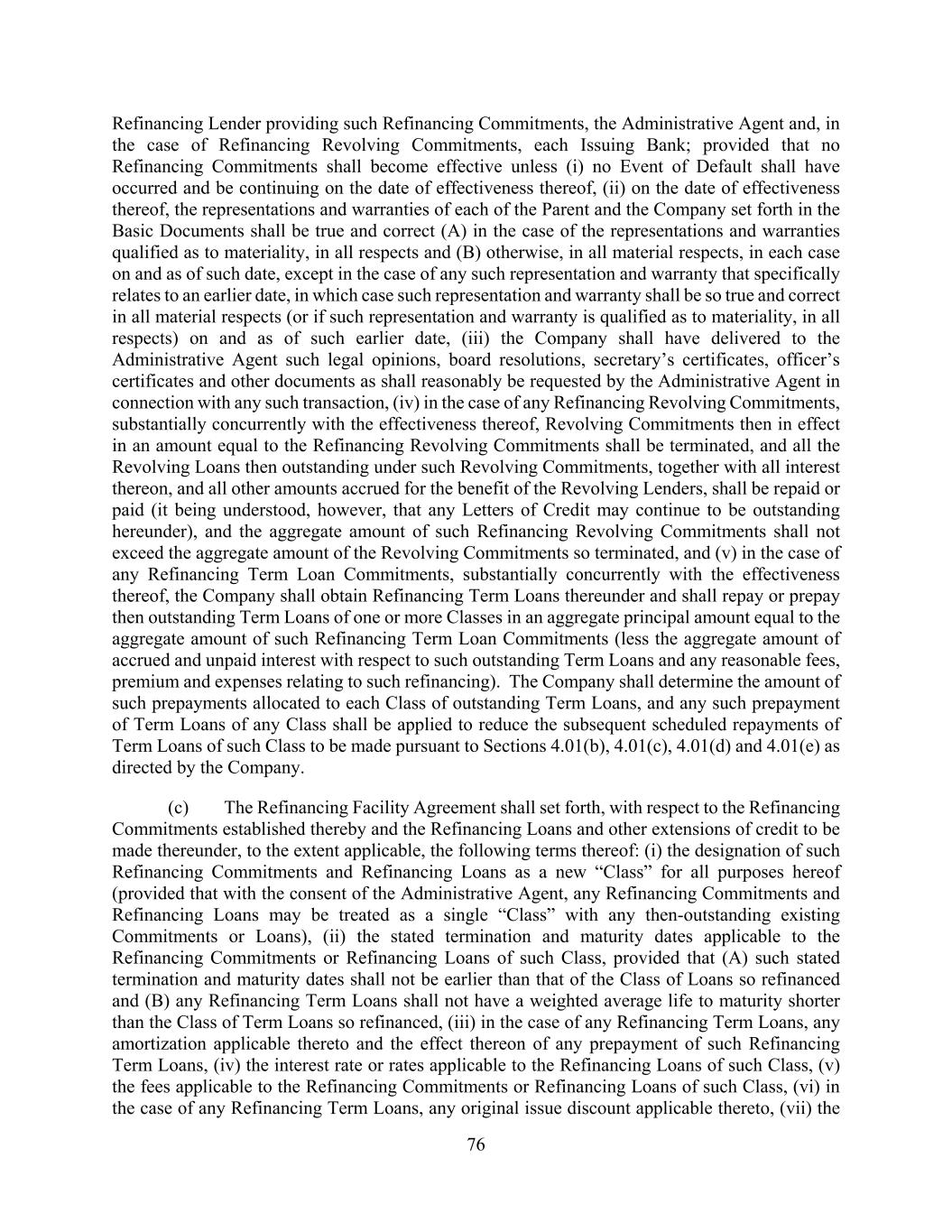76 Refinancing Lender providing such Refinancing Commitments, the Administrative Agent and, in the case of Refinancing Revolving Commitments, each Issuing Bank; provided that no Refinancing Commitments shall become effective unless (i) no Event of Default shall have occurred and be continuing on the date of effectiveness thereof, (ii) on the date of effectiveness thereof, the representations and warranties of each of the Parent and the Company set forth in the Basic Documents shall be true and correct (A) in the case of the representations and warranties qualified as to materiality, in all respects and (B) otherwise, in all material respects, in each case on and as of such date, except in the case of any such representation and warranty that specifically relates to an earlier date, in which case such representation and warranty shall be so true and correct in all material respects (or if such representation and warranty is qualified as to materiality, in all respects) on and as of such earlier date, (iii) the Company shall have delivered to the Administrative Agent such legal opinions, board resolutions, secretary’s certificates, officer’s certificates and other documents as shall reasonably be requested by the Administrative Agent in connection with any such transaction, (iv) in the case of any Refinancing Revolving Commitments, substantially concurrently with the effectiveness thereof, Revolving Commitments then in effect in an amount equal to the Refinancing Revolving Commitments shall be terminated, and all the Revolving Loans then outstanding under such Revolving Commitments, together with all interest thereon, and all other amounts accrued for the benefit of the Revolving Lenders, shall be repaid or paid (it being understood, however, that any Letters of Credit may continue to be outstanding hereunder), and the aggregate amount of such Refinancing Revolving Commitments shall not exceed the aggregate amount of the Revolving Commitments so terminated, and (v) in the case of any Refinancing Term Loan Commitments, substantially concurrently with the effectiveness thereof, the Company shall obtain Refinancing Term Loans thereunder and shall repay or prepay then outstanding Term Loans of one or more Classes in an aggregate principal amount equal to the aggregate amount of such Refinancing Term Loan Commitments (less the aggregate amount of accrued and unpaid interest with respect to such outstanding Term Loans and any reasonable fees, premium and expenses relating to such refinancing). The Company shall determine the amount of such prepayments allocated to each Class of outstanding Term Loans, and any such prepayment of Term Loans of any Class shall be applied to reduce the subsequent scheduled repayments of Term Loans of such Class to be made pursuant to Sections 4.01(b), 4.01(c), 4.01(d) and 4.01(e) as directed by the Company. (c) The Refinancing Facility Agreement shall set forth, with respect to the Refinancing Commitments established thereby and the Refinancing Loans and other extensions of credit to be made thereunder, to the extent applicable, the following terms thereof: (i) the designation of such Refinancing Commitments and Refinancing Loans as a new “Class” for all purposes hereof (provided that with the consent of the Administrative Agent, any Refinancing Commitments and Refinancing Loans may be treated as a single “Class” with any then-outstanding existing Commitments or Loans), (ii) the stated termination and maturity dates applicable to the Refinancing Commitments or Refinancing Loans of such Class, provided that (A) such stated termination and maturity dates shall not be earlier than that of the Class of Loans so refinanced and (B) any Refinancing Term Loans shall not have a weighted average life to maturity shorter than the Class of Term Loans so refinanced, (iii) in the case of any Refinancing Term Loans, any amortization applicable thereto and the effect thereon of any prepayment of such Refinancing Term Loans, (iv) the interest rate or rates applicable to the Refinancing Loans of such Class, (v) the fees applicable to the Refinancing Commitments or Refinancing Loans of such Class, (vi) in the case of any Refinancing Term Loans, any original issue discount applicable thereto, (vii) the