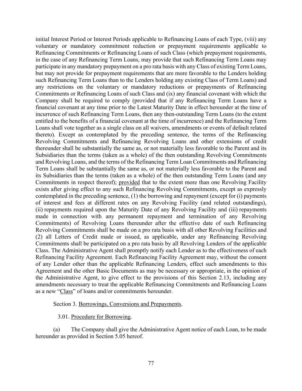77 initial Interest Period or Interest Periods applicable to Refinancing Loans of each Type, (viii) any voluntary or mandatory commitment reduction or prepayment requirements applicable to Refinancing Commitments or Refinancing Loans of such Class (which prepayment requirements, in the case of any Refinancing Term Loans, may provide that such Refinancing Term Loans may participate in any mandatory prepayment on a pro rata basis with any Class of existing Term Loans, but may not provide for prepayment requirements that are more favorable to the Lenders holding such Refinancing Term Loans than to the Lenders holding any existing Class of Term Loans) and any restrictions on the voluntary or mandatory reductions or prepayments of Refinancing Commitments or Refinancing Loans of such Class and (ix) any financial covenant with which the Company shall be required to comply (provided that if any Refinancing Term Loans have a financial covenant at any time prior to the Latest Maturity Date in effect hereunder at the time of incurrence of such Refinancing Term Loans, then any then-outstanding Term Loans (to the extent entitled to the benefits of a financial covenant at the time of incurrence) and the Refinancing Term Loans shall vote together as a single class on all waivers, amendments or events of default related thereto). Except as contemplated by the preceding sentence, the terms of the Refinancing Revolving Commitments and Refinancing Revolving Loans and other extensions of credit thereunder shall be substantially the same as, or not materially less favorable to the Parent and its Subsidiaries than the terms (taken as a whole) of the then outstanding Revolving Commitments and Revolving Loans, and the terms of the Refinancing Term Loan Commitments and Refinancing Term Loans shall be substantially the same as, or not materially less favorable to the Parent and its Subsidiaries than the terms (taken as a whole) of the then outstanding Term Loans (and any Commitments in respect thereof); provided that to the extent more than one Revolving Facility exists after giving effect to any such Refinancing Revolving Commitments, except as expressly contemplated in the preceding sentence, (1) the borrowing and repayment (except for (i) payments of interest and fees at different rates on any Revolving Facility (and related outstandings), (ii) repayments required upon the Maturity Date of any Revolving Facility and (iii) repayments made in connection with any permanent repayment and termination of any Revolving Commitments) of Revolving Loans thereunder after the effective date of such Refinancing Revolving Commitments shall be made on a pro rata basis with all other Revolving Facilities and (2) all Letters of Credit made or issued, as applicable, under any Refinancing Revolving Commitments shall be participated on a pro rata basis by all Revolving Lenders of the applicable Class. The Administrative Agent shall promptly notify each Lender as to the effectiveness of each Refinancing Facility Agreement. Each Refinancing Facility Agreement may, without the consent of any Lender other than the applicable Refinancing Lenders, effect such amendments to this Agreement and the other Basic Documents as may be necessary or appropriate, in the opinion of the Administrative Agent, to give effect to the provisions of this Section 2.13, including any amendments necessary to treat the applicable Refinancing Commitments and Refinancing Loans as a new “Class” of loans and/or commitments hereunder. Section 3. Borrowings, Conversions and Prepayments. 3.01. Procedure for Borrowing. (a) The Company shall give the Administrative Agent notice of each Loan, to be made hereunder as provided in Section 5.05 hereof.