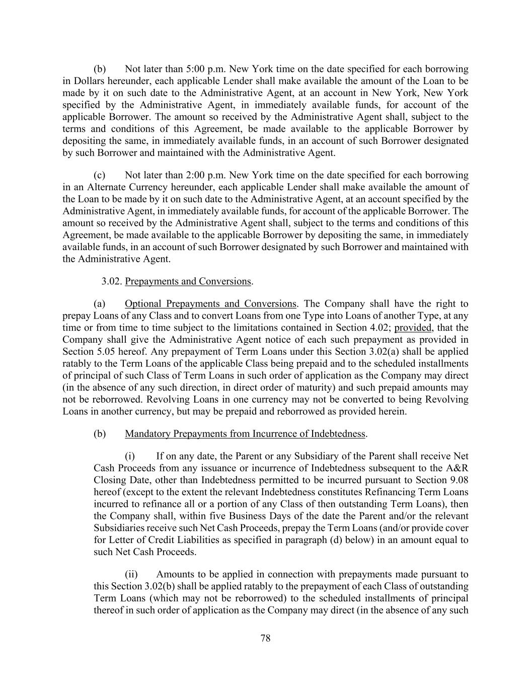 78 (b) Not later than 5:00 p.m. New York time on the date specified for each borrowing in Dollars hereunder, each applicable Lender shall make available the amount of the Loan to be made by it on such date to the Administrative Agent, at an account in New York, New York specified by the Administrative Agent, in immediately available funds, for account of the applicable Borrower. The amount so received by the Administrative Agent shall, subject to the terms and conditions of this Agreement, be made available to the applicable Borrower by depositing the same, in immediately available funds, in an account of such Borrower designated by such Borrower and maintained with the Administrative Agent. (c) Not later than 2:00 p.m. New York time on the date specified for each borrowing in an Alternate Currency hereunder, each applicable Lender shall make available the amount of the Loan to be made by it on such date to the Administrative Agent, at an account specified by the Administrative Agent, in immediately available funds, for account of the applicable Borrower. The amount so received by the Administrative Agent shall, subject to the terms and conditions of this Agreement, be made available to the applicable Borrower by depositing the same, in immediately available funds, in an account of such Borrower designated by such Borrower and maintained with the Administrative Agent. 3.02. Prepayments and Conversions. (a) Optional Prepayments and Conversions. The Company shall have the right to prepay Loans of any Class and to convert Loans from one Type into Loans of another Type, at any time or from time to time subject to the limitations contained in Section 4.02; provided, that the Company shall give the Administrative Agent notice of each such prepayment as provided in Section 5.05 hereof. Any prepayment of Term Loans under this Section 3.02(a) shall be applied ratably to the Term Loans of the applicable Class being prepaid and to the scheduled installments of principal of such Class of Term Loans in such order of application as the Company may direct (in the absence of any such direction, in direct order of maturity) and such prepaid amounts may not be reborrowed. Revolving Loans in one currency may not be converted to being Revolving Loans in another currency, but may be prepaid and reborrowed as provided herein. (b) Mandatory Prepayments from Incurrence of Indebtedness. (i) If on any date, the Parent or any Subsidiary of the Parent shall receive Net Cash Proceeds from any issuance or incurrence of Indebtedness subsequent to the A&R Closing Date, other than Indebtedness permitted to be incurred pursuant to Section 9.08 hereof (except to the extent the relevant Indebtedness constitutes Refinancing Term Loans incurred to refinance all or a portion of any Class of then outstanding Term Loans), then the Company shall, within five Business Days of the date the Parent and/or the relevant Subsidiaries receive such Net Cash Proceeds, prepay the Term Loans (and/or provide cover for Letter of Credit Liabilities as specified in paragraph (d) below) in an amount equal to such Net Cash Proceeds. (ii) Amounts to be applied in connection with prepayments made pursuant to this Section 3.02(b) shall be applied ratably to the prepayment of each Class of outstanding Term Loans (which may not be reborrowed) to the scheduled installments of principal thereof in such order of application as the Company may direct (in the absence of any such