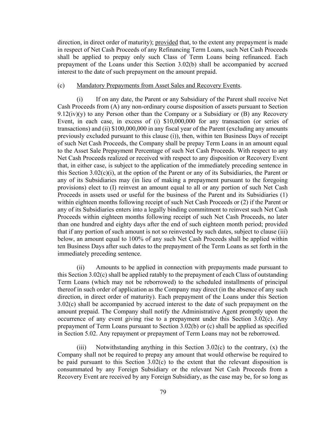 79 direction, in direct order of maturity); provided that, to the extent any prepayment is made in respect of Net Cash Proceeds of any Refinancing Term Loans, such Net Cash Proceeds shall be applied to prepay only such Class of Term Loans being refinanced. Each prepayment of the Loans under this Section 3.02(b) shall be accompanied by accrued interest to the date of such prepayment on the amount prepaid. (c) Mandatory Prepayments from Asset Sales and Recovery Events. (i) If on any date, the Parent or any Subsidiary of the Parent shall receive Net Cash Proceeds from (A) any non-ordinary course disposition of assets pursuant to Section 9.12(iv)(y) to any Person other than the Company or a Subsidiary or (B) any Recovery Event, in each case, in excess of (i) $10,000,000 for any transaction (or series of transactions) and (ii) $100,000,000 in any fiscal year of the Parent (excluding any amounts previously excluded pursuant to this clause (i)), then, within ten Business Days of receipt of such Net Cash Proceeds, the Company shall be prepay Term Loans in an amount equal to the Asset Sale Prepayment Percentage of such Net Cash Proceeds. With respect to any Net Cash Proceeds realized or received with respect to any disposition or Recovery Event that, in either case, is subject to the application of the immediately preceding sentence in this Section 3.02(c)(i), at the option of the Parent or any of its Subsidiaries, the Parent or any of its Subsidiaries may (in lieu of making a prepayment pursuant to the foregoing provisions) elect to (I) reinvest an amount equal to all or any portion of such Net Cash Proceeds in assets used or useful for the business of the Parent and its Subsidiaries (1) within eighteen months following receipt of such Net Cash Proceeds or (2) if the Parent or any of its Subsidiaries enters into a legally binding commitment to reinvest such Net Cash Proceeds within eighteen months following receipt of such Net Cash Proceeds, no later than one hundred and eighty days after the end of such eighteen month period; provided that if any portion of such amount is not so reinvested by such dates, subject to clause (iii) below, an amount equal to 100% of any such Net Cash Proceeds shall be applied within ten Business Days after such dates to the prepayment of the Term Loans as set forth in the immediately preceding sentence. (ii) Amounts to be applied in connection with prepayments made pursuant to this Section 3.02(c) shall be applied ratably to the prepayment of each Class of outstanding Term Loans (which may not be reborrowed) to the scheduled installments of principal thereof in such order of application as the Company may direct (in the absence of any such direction, in direct order of maturity). Each prepayment of the Loans under this Section 3.02(c) shall be accompanied by accrued interest to the date of such prepayment on the amount prepaid. The Company shall notify the Administrative Agent promptly upon the occurrence of any event giving rise to a prepayment under this Section 3.02(c). Any prepayment of Term Loans pursuant to Section 3.02(b) or (c) shall be applied as specified in Section 5.02. Any repayment or prepayment of Term Loans may not be reborrowed. (iii) Notwithstanding anything in this Section 3.02(c) to the contrary, (x) the Company shall not be required to prepay any amount that would otherwise be required to be paid pursuant to this Section 3.02(c) to the extent that the relevant disposition is consummated by any Foreign Subsidiary or the relevant Net Cash Proceeds from a Recovery Event are received by any Foreign Subsidiary, as the case may be, for so long as