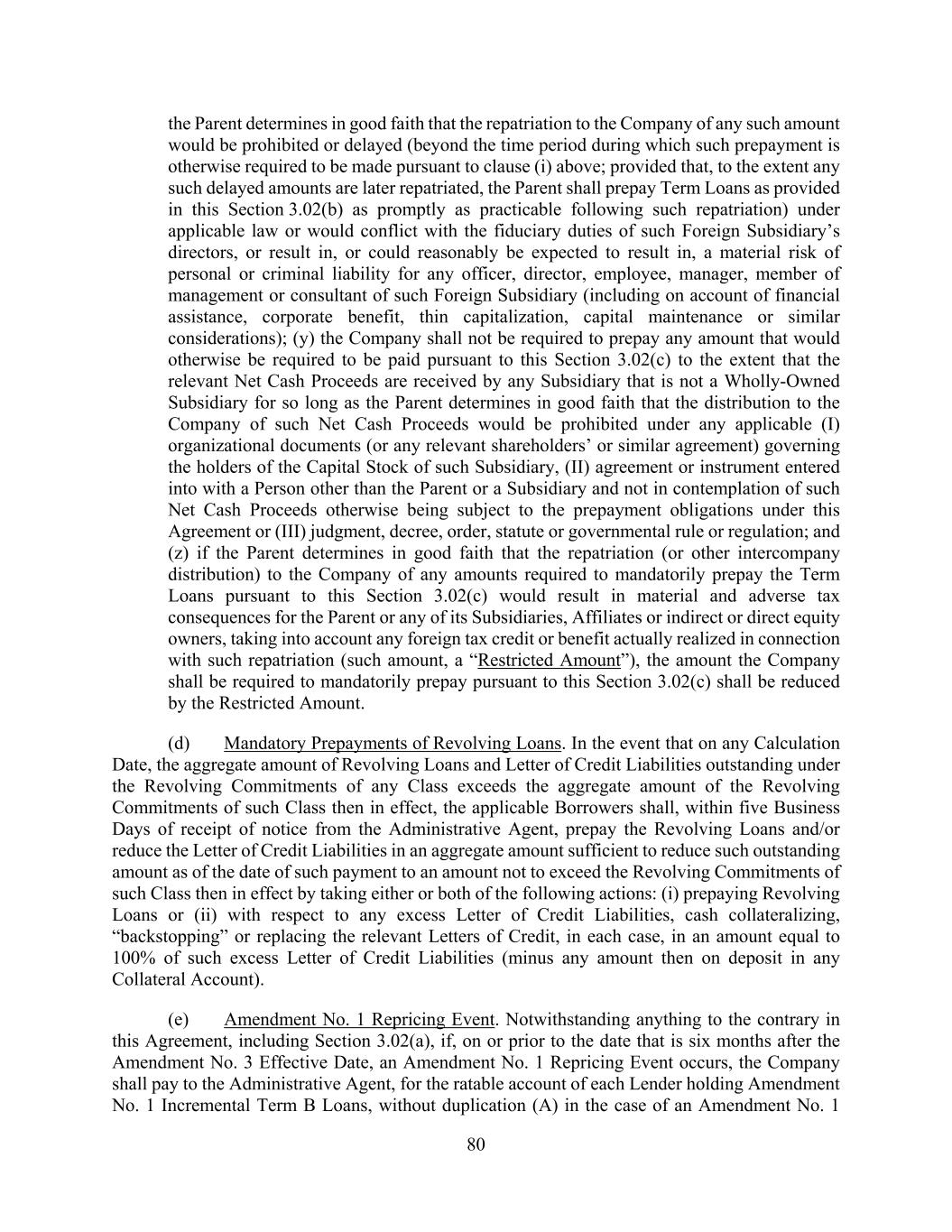 80 the Parent determines in good faith that the repatriation to the Company of any such amount would be prohibited or delayed (beyond the time period during which such prepayment is otherwise required to be made pursuant to clause (i) above; provided that, to the extent any such delayed amounts are later repatriated, the Parent shall prepay Term Loans as provided in this Section 3.02(b) as promptly as practicable following such repatriation) under applicable law or would conflict with the fiduciary duties of such Foreign Subsidiary’s directors, or result in, or could reasonably be expected to result in, a material risk of personal or criminal liability for any officer, director, employee, manager, member of management or consultant of such Foreign Subsidiary (including on account of financial assistance, corporate benefit, thin capitalization, capital maintenance or similar considerations); (y) the Company shall not be required to prepay any amount that would otherwise be required to be paid pursuant to this Section 3.02(c) to the extent that the relevant Net Cash Proceeds are received by any Subsidiary that is not a Wholly-Owned Subsidiary for so long as the Parent determines in good faith that the distribution to the Company of such Net Cash Proceeds would be prohibited under any applicable (I) organizational documents (or any relevant shareholders’ or similar agreement) governing the holders of the Capital Stock of such Subsidiary, (II) agreement or instrument entered into with a Person other than the Parent or a Subsidiary and not in contemplation of such Net Cash Proceeds otherwise being subject to the prepayment obligations under this Agreement or (III) judgment, decree, order, statute or governmental rule or regulation; and (z) if the Parent determines in good faith that the repatriation (or other intercompany distribution) to the Company of any amounts required to mandatorily prepay the Term Loans pursuant to this Section 3.02(c) would result in material and adverse tax consequences for the Parent or any of its Subsidiaries, Affiliates or indirect or direct equity owners, taking into account any foreign tax credit or benefit actually realized in connection with such repatriation (such amount, a “Restricted Amount”), the amount the Company shall be required to mandatorily prepay pursuant to this Section 3.02(c) shall be reduced by the Restricted Amount. (d) Mandatory Prepayments of Revolving Loans. In the event that on any Calculation Date, the aggregate amount of Revolving Loans and Letter of Credit Liabilities outstanding under the Revolving Commitments of any Class exceeds the aggregate amount of the Revolving Commitments of such Class then in effect, the applicable Borrowers shall, within five Business Days of receipt of notice from the Administrative Agent, prepay the Revolving Loans and/or reduce the Letter of Credit Liabilities in an aggregate amount sufficient to reduce such outstanding amount as of the date of such payment to an amount not to exceed the Revolving Commitments of such Class then in effect by taking either or both of the following actions: (i) prepaying Revolving Loans or (ii) with respect to any excess Letter of Credit Liabilities, cash collateralizing, “backstopping” or replacing the relevant Letters of Credit, in each case, in an amount equal to 100% of such excess Letter of Credit Liabilities (minus any amount then on deposit in any Collateral Account). (e) Amendment No. 1 Repricing Event. Notwithstanding anything to the contrary in this Agreement, including Section 3.02(a), if, on or prior to the date that is six months after the Amendment No. 3 Effective Date, an Amendment No. 1 Repricing Event occurs, the Company shall pay to the Administrative Agent, for the ratable account of each Lender holding Amendment No. 1 Incremental Term B Loans, without duplication (A) in the case of an Amendment No. 1