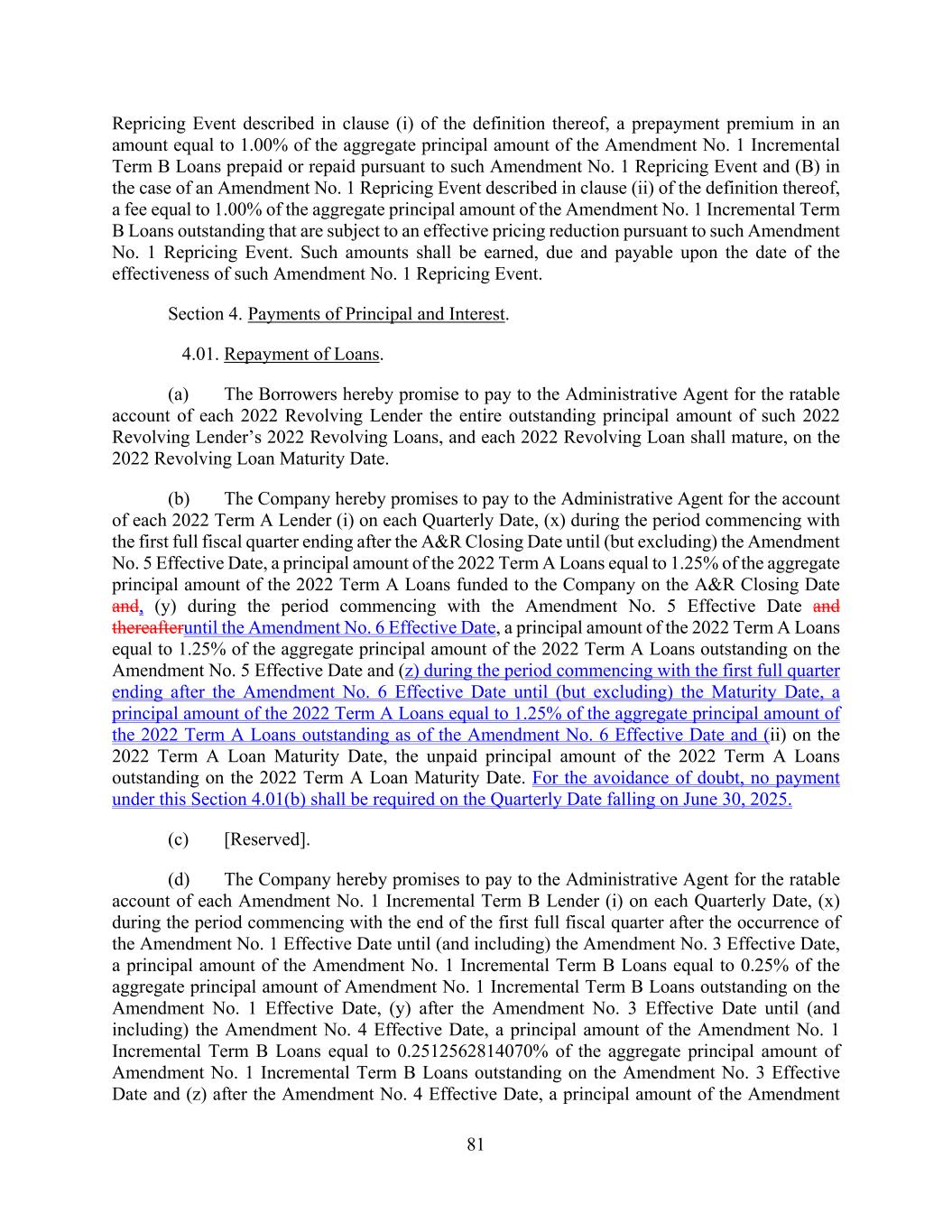 81 Repricing Event described in clause (i) of the definition thereof, a prepayment premium in an amount equal to 1.00% of the aggregate principal amount of the Amendment No. 1 Incremental Term B Loans prepaid or repaid pursuant to such Amendment No. 1 Repricing Event and (B) in the case of an Amendment No. 1 Repricing Event described in clause (ii) of the definition thereof, a fee equal to 1.00% of the aggregate principal amount of the Amendment No. 1 Incremental Term B Loans outstanding that are subject to an effective pricing reduction pursuant to such Amendment No. 1 Repricing Event. Such amounts shall be earned, due and payable upon the date of the effectiveness of such Amendment No. 1 Repricing Event. Section 4. Payments of Principal and Interest. 4.01. Repayment of Loans. (a) The Borrowers hereby promise to pay to the Administrative Agent for the ratable account of each 2022 Revolving Lender the entire outstanding principal amount of such 2022 Revolving Lender’s 2022 Revolving Loans, and each 2022 Revolving Loan shall mature, on the 2022 Revolving Loan Maturity Date. (b) The Company hereby promises to pay to the Administrative Agent for the account of each 2022 Term A Lender (i) on each Quarterly Date, (x) during the period commencing with the first full fiscal quarter ending after the A&R Closing Date until (but excluding) the Amendment No. 5 Effective Date, a principal amount of the 2022 Term A Loans equal to 1.25% of the aggregate principal amount of the 2022 Term A Loans funded to the Company on the A&R Closing Date and, (y) during the period commencing with the Amendment No. 5 Effective Date and thereafteruntil the Amendment No. 6 Effective Date, a principal amount of the 2022 Term A Loans equal to 1.25% of the aggregate principal amount of the 2022 Term A Loans outstanding on the Amendment No. 5 Effective Date and (z) during the period commencing with the first full quarter ending after the Amendment No. 6 Effective Date until (but excluding) the Maturity Date, a principal amount of the 2022 Term A Loans equal to 1.25% of the aggregate principal amount of the 2022 Term A Loans outstanding as of the Amendment No. 6 Effective Date and (ii) on the 2022 Term A Loan Maturity Date, the unpaid principal amount of the 2022 Term A Loans outstanding on the 2022 Term A Loan Maturity Date. For the avoidance of doubt, no payment under this Section 4.01(b) shall be required on the Quarterly Date falling on June 30, 2025. (c) [Reserved]. (d) The Company hereby promises to pay to the Administrative Agent for the ratable account of each Amendment No. 1 Incremental Term B Lender (i) on each Quarterly Date, (x) during the period commencing with the end of the first full fiscal quarter after the occurrence of the Amendment No. 1 Effective Date until (and including) the Amendment No. 3 Effective Date, a principal amount of the Amendment No. 1 Incremental Term B Loans equal to 0.25% of the aggregate principal amount of Amendment No. 1 Incremental Term B Loans outstanding on the Amendment No. 1 Effective Date, (y) after the Amendment No. 3 Effective Date until (and including) the Amendment No. 4 Effective Date, a principal amount of the Amendment No. 1 Incremental Term B Loans equal to 0.2512562814070% of the aggregate principal amount of Amendment No. 1 Incremental Term B Loans outstanding on the Amendment No. 3 Effective Date and (z) after the Amendment No. 4 Effective Date, a principal amount of the Amendment