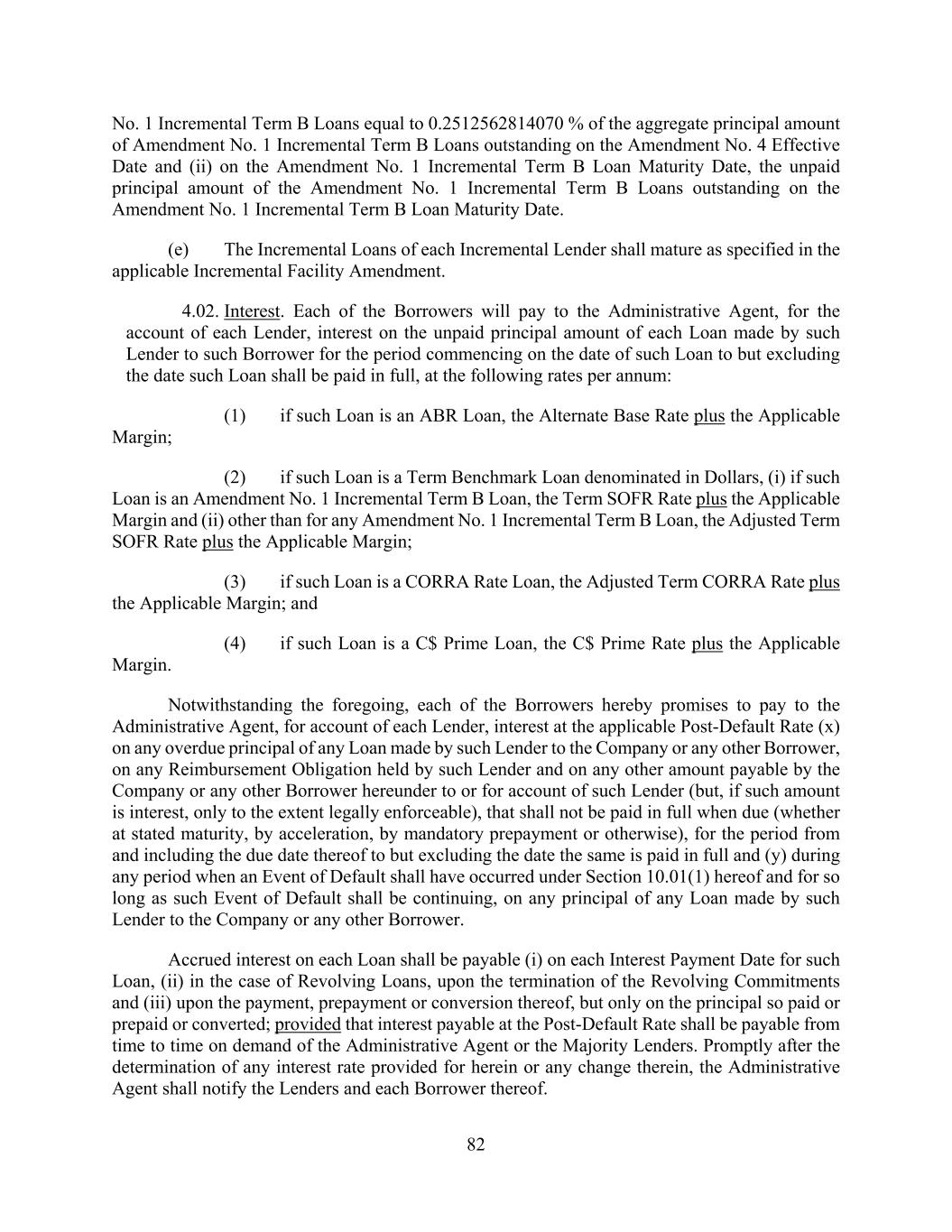 82 No. 1 Incremental Term B Loans equal to 0.2512562814070 % of the aggregate principal amount of Amendment No. 1 Incremental Term B Loans outstanding on the Amendment No. 4 Effective Date and (ii) on the Amendment No. 1 Incremental Term B Loan Maturity Date, the unpaid principal amount of the Amendment No. 1 Incremental Term B Loans outstanding on the Amendment No. 1 Incremental Term B Loan Maturity Date. (e) The Incremental Loans of each Incremental Lender shall mature as specified in the applicable Incremental Facility Amendment. 4.02. Interest. Each of the Borrowers will pay to the Administrative Agent, for the account of each Lender, interest on the unpaid principal amount of each Loan made by such Lender to such Borrower for the period commencing on the date of such Loan to but excluding the date such Loan shall be paid in full, at the following rates per annum: (1) if such Loan is an ABR Loan, the Alternate Base Rate plus the Applicable Margin; (2) if such Loan is a Term Benchmark Loan denominated in Dollars, (i) if such Loan is an Amendment No. 1 Incremental Term B Loan, the Term SOFR Rate plus the Applicable Margin and (ii) other than for any Amendment No. 1 Incremental Term B Loan, the Adjusted Term SOFR Rate plus the Applicable Margin; (3) if such Loan is a CORRA Rate Loan, the Adjusted Term CORRA Rate plus the Applicable Margin; and (4) if such Loan is a C$ Prime Loan, the C$ Prime Rate plus the Applicable Margin. Notwithstanding the foregoing, each of the Borrowers hereby promises to pay to the Administrative Agent, for account of each Lender, interest at the applicable Post-Default Rate (x) on any overdue principal of any Loan made by such Lender to the Company or any other Borrower, on any Reimbursement Obligation held by such Lender and on any other amount payable by the Company or any other Borrower hereunder to or for account of such Lender (but, if such amount is interest, only to the extent legally enforceable), that shall not be paid in full when due (whether at stated maturity, by acceleration, by mandatory prepayment or otherwise), for the period from and including the due date thereof to but excluding the date the same is paid in full and (y) during any period when an Event of Default shall have occurred under Section 10.01(1) hereof and for so long as such Event of Default shall be continuing, on any principal of any Loan made by such Lender to the Company or any other Borrower. Accrued interest on each Loan shall be payable (i) on each Interest Payment Date for such Loan, (ii) in the case of Revolving Loans, upon the termination of the Revolving Commitments and (iii) upon the payment, prepayment or conversion thereof, but only on the principal so paid or prepaid or converted; provided that interest payable at the Post-Default Rate shall be payable from time to time on demand of the Administrative Agent or the Majority Lenders. Promptly after the determination of any interest rate provided for herein or any change therein, the Administrative Agent shall notify the Lenders and each Borrower thereof.