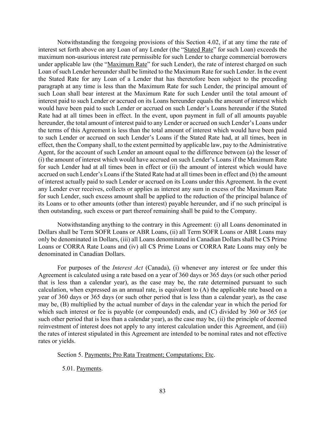 83 Notwithstanding the foregoing provisions of this Section 4.02, if at any time the rate of interest set forth above on any Loan of any Lender (the “Stated Rate” for such Loan) exceeds the maximum non-usurious interest rate permissible for such Lender to charge commercial borrowers under applicable law (the “Maximum Rate” for such Lender), the rate of interest charged on such Loan of such Lender hereunder shall be limited to the Maximum Rate for such Lender. In the event the Stated Rate for any Loan of a Lender that has theretofore been subject to the preceding paragraph at any time is less than the Maximum Rate for such Lender, the principal amount of such Loan shall bear interest at the Maximum Rate for such Lender until the total amount of interest paid to such Lender or accrued on its Loans hereunder equals the amount of interest which would have been paid to such Lender or accrued on such Lender’s Loans hereunder if the Stated Rate had at all times been in effect. In the event, upon payment in full of all amounts payable hereunder, the total amount of interest paid to any Lender or accrued on such Lender’s Loans under the terms of this Agreement is less than the total amount of interest which would have been paid to such Lender or accrued on such Lender’s Loans if the Stated Rate had, at all times, been in effect, then the Company shall, to the extent permitted by applicable law, pay to the Administrative Agent, for the account of such Lender an amount equal to the difference between (a) the lesser of (i) the amount of interest which would have accrued on such Lender’s Loans if the Maximum Rate for such Lender had at all times been in effect or (ii) the amount of interest which would have accrued on such Lender’s Loans if the Stated Rate had at all times been in effect and (b) the amount of interest actually paid to such Lender or accrued on its Loans under this Agreement. In the event any Lender ever receives, collects or applies as interest any sum in excess of the Maximum Rate for such Lender, such excess amount shall be applied to the reduction of the principal balance of its Loans or to other amounts (other than interest) payable hereunder, and if no such principal is then outstanding, such excess or part thereof remaining shall be paid to the Company. Notwithstanding anything to the contrary in this Agreement: (i) all Loans denominated in Dollars shall be Term SOFR Loans or ABR Loans, (ii) all Term SOFR Loans or ABR Loans may only be denominated in Dollars, (iii) all Loans denominated in Canadian Dollars shall be C$ Prime Loans or CORRA Rate Loans and (iv) all C$ Prime Loans or CORRA Rate Loans may only be denominated in Canadian Dollars. For purposes of the Interest Act (Canada), (i) whenever any interest or fee under this Agreement is calculated using a rate based on a year of 360 days or 365 days (or such other period that is less than a calendar year), as the case may be, the rate determined pursuant to such calculation, when expressed as an annual rate, is equivalent to (A) the applicable rate based on a year of 360 days or 365 days (or such other period that is less than a calendar year), as the case may be, (B) multiplied by the actual number of days in the calendar year in which the period for which such interest or fee is payable (or compounded) ends, and (C) divided by 360 or 365 (or such other period that is less than a calendar year), as the case may be, (ii) the principle of deemed reinvestment of interest does not apply to any interest calculation under this Agreement, and (iii) the rates of interest stipulated in this Agreement are intended to be nominal rates and not effective rates or yields. Section 5. Payments; Pro Rata Treatment; Computations; Etc. 5.01. Payments.