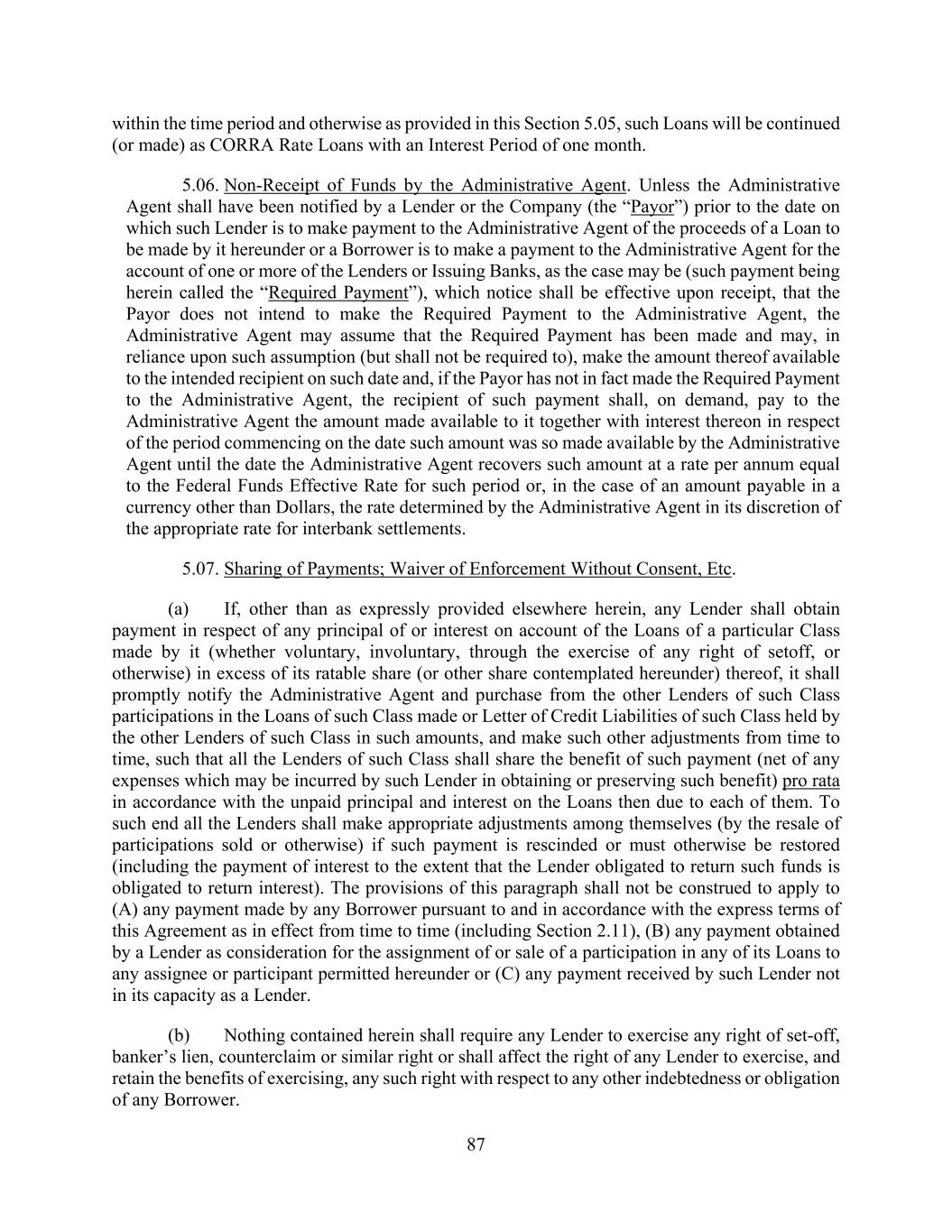 87 within the time period and otherwise as provided in this Section 5.05, such Loans will be continued (or made) as CORRA Rate Loans with an Interest Period of one month. 5.06. Non-Receipt of Funds by the Administrative Agent. Unless the Administrative Agent shall have been notified by a Lender or the Company (the “Payor”) prior to the date on which such Lender is to make payment to the Administrative Agent of the proceeds of a Loan to be made by it hereunder or a Borrower is to make a payment to the Administrative Agent for the account of one or more of the Lenders or Issuing Banks, as the case may be (such payment being herein called the “Required Payment”), which notice shall be effective upon receipt, that the Payor does not intend to make the Required Payment to the Administrative Agent, the Administrative Agent may assume that the Required Payment has been made and may, in reliance upon such assumption (but shall not be required to), make the amount thereof available to the intended recipient on such date and, if the Payor has not in fact made the Required Payment to the Administrative Agent, the recipient of such payment shall, on demand, pay to the Administrative Agent the amount made available to it together with interest thereon in respect of the period commencing on the date such amount was so made available by the Administrative Agent until the date the Administrative Agent recovers such amount at a rate per annum equal to the Federal Funds Effective Rate for such period or, in the case of an amount payable in a currency other than Dollars, the rate determined by the Administrative Agent in its discretion of the appropriate rate for interbank settlements. 5.07. Sharing of Payments; Waiver of Enforcement Without Consent, Etc. (a) If, other than as expressly provided elsewhere herein, any Lender shall obtain payment in respect of any principal of or interest on account of the Loans of a particular Class made by it (whether voluntary, involuntary, through the exercise of any right of setoff, or otherwise) in excess of its ratable share (or other share contemplated hereunder) thereof, it shall promptly notify the Administrative Agent and purchase from the other Lenders of such Class participations in the Loans of such Class made or Letter of Credit Liabilities of such Class held by the other Lenders of such Class in such amounts, and make such other adjustments from time to time, such that all the Lenders of such Class shall share the benefit of such payment (net of any expenses which may be incurred by such Lender in obtaining or preserving such benefit) pro rata in accordance with the unpaid principal and interest on the Loans then due to each of them. To such end all the Lenders shall make appropriate adjustments among themselves (by the resale of participations sold or otherwise) if such payment is rescinded or must otherwise be restored (including the payment of interest to the extent that the Lender obligated to return such funds is obligated to return interest). The provisions of this paragraph shall not be construed to apply to (A) any payment made by any Borrower pursuant to and in accordance with the express terms of this Agreement as in effect from time to time (including Section 2.11), (B) any payment obtained by a Lender as consideration for the assignment of or sale of a participation in any of its Loans to any assignee or participant permitted hereunder or (C) any payment received by such Lender not in its capacity as a Lender. (b) Nothing contained herein shall require any Lender to exercise any right of set-off, banker’s lien, counterclaim or similar right or shall affect the right of any Lender to exercise, and retain the benefits of exercising, any such right with respect to any other indebtedness or obligation of any Borrower.