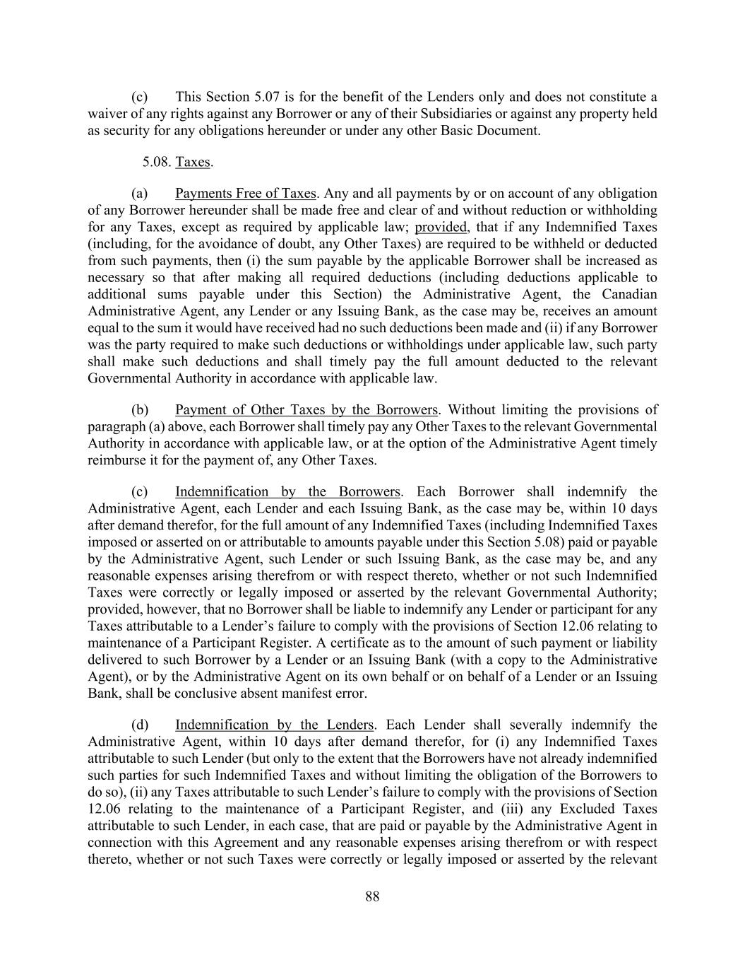 88 (c) This Section 5.07 is for the benefit of the Lenders only and does not constitute a waiver of any rights against any Borrower or any of their Subsidiaries or against any property held as security for any obligations hereunder or under any other Basic Document. 5.08. Taxes. (a) Payments Free of Taxes. Any and all payments by or on account of any obligation of any Borrower hereunder shall be made free and clear of and without reduction or withholding for any Taxes, except as required by applicable law; provided, that if any Indemnified Taxes (including, for the avoidance of doubt, any Other Taxes) are required to be withheld or deducted from such payments, then (i) the sum payable by the applicable Borrower shall be increased as necessary so that after making all required deductions (including deductions applicable to additional sums payable under this Section) the Administrative Agent, the Canadian Administrative Agent, any Lender or any Issuing Bank, as the case may be, receives an amount equal to the sum it would have received had no such deductions been made and (ii) if any Borrower was the party required to make such deductions or withholdings under applicable law, such party shall make such deductions and shall timely pay the full amount deducted to the relevant Governmental Authority in accordance with applicable law. (b) Payment of Other Taxes by the Borrowers. Without limiting the provisions of paragraph (a) above, each Borrower shall timely pay any Other Taxes to the relevant Governmental Authority in accordance with applicable law, or at the option of the Administrative Agent timely reimburse it for the payment of, any Other Taxes. (c) Indemnification by the Borrowers. Each Borrower shall indemnify the Administrative Agent, each Lender and each Issuing Bank, as the case may be, within 10 days after demand therefor, for the full amount of any Indemnified Taxes (including Indemnified Taxes imposed or asserted on or attributable to amounts payable under this Section 5.08) paid or payable by the Administrative Agent, such Lender or such Issuing Bank, as the case may be, and any reasonable expenses arising therefrom or with respect thereto, whether or not such Indemnified Taxes were correctly or legally imposed or asserted by the relevant Governmental Authority; provided, however, that no Borrower shall be liable to indemnify any Lender or participant for any Taxes attributable to a Lender’s failure to comply with the provisions of Section 12.06 relating to maintenance of a Participant Register. A certificate as to the amount of such payment or liability delivered to such Borrower by a Lender or an Issuing Bank (with a copy to the Administrative Agent), or by the Administrative Agent on its own behalf or on behalf of a Lender or an Issuing Bank, shall be conclusive absent manifest error. (d) Indemnification by the Lenders. Each Lender shall severally indemnify the Administrative Agent, within 10 days after demand therefor, for (i) any Indemnified Taxes attributable to such Lender (but only to the extent that the Borrowers have not already indemnified such parties for such Indemnified Taxes and without limiting the obligation of the Borrowers to do so), (ii) any Taxes attributable to such Lender’s failure to comply with the provisions of Section 12.06 relating to the maintenance of a Participant Register, and (iii) any Excluded Taxes attributable to such Lender, in each case, that are paid or payable by the Administrative Agent in connection with this Agreement and any reasonable expenses arising therefrom or with respect thereto, whether or not such Taxes were correctly or legally imposed or asserted by the relevant