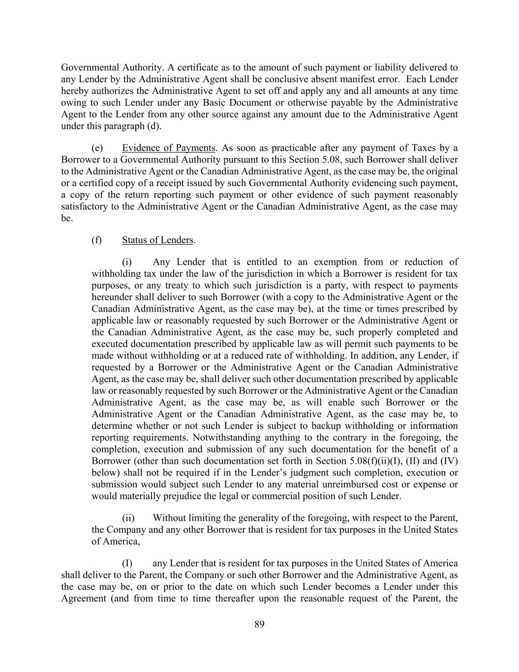 89 Governmental Authority. A certificate as to the amount of such payment or liability delivered to any Lender by the Administrative Agent shall be conclusive absent manifest error. Each Lender hereby authorizes the Administrative Agent to set off and apply any and all amounts at any time owing to such Lender under any Basic Document or otherwise payable by the Administrative Agent to the Lender from any other source against any amount due to the Administrative Agent under this paragraph (d). (e) Evidence of Payments. As soon as practicable after any payment of Taxes by a Borrower to a Governmental Authority pursuant to this Section 5.08, such Borrower shall deliver to the Administrative Agent or the Canadian Administrative Agent, as the case may be, the original or a certified copy of a receipt issued by such Governmental Authority evidencing such payment, a copy of the return reporting such payment or other evidence of such payment reasonably satisfactory to the Administrative Agent or the Canadian Administrative Agent, as the case may be. (f) Status of Lenders. (i) Any Lender that is entitled to an exemption from or reduction of withholding tax under the law of the jurisdiction in which a Borrower is resident for tax purposes, or any treaty to which such jurisdiction is a party, with respect to payments hereunder shall deliver to such Borrower (with a copy to the Administrative Agent or the Canadian Administrative Agent, as the case may be), at the time or times prescribed by applicable law or reasonably requested by such Borrower or the Administrative Agent or the Canadian Administrative Agent, as the case may be, such properly completed and executed documentation prescribed by applicable law as will permit such payments to be made without withholding or at a reduced rate of withholding. In addition, any Lender, if requested by a Borrower or the Administrative Agent or the Canadian Administrative Agent, as the case may be, shall deliver such other documentation prescribed by applicable law or reasonably requested by such Borrower or the Administrative Agent or the Canadian Administrative Agent, as the case may be, as will enable such Borrower or the Administrative Agent or the Canadian Administrative Agent, as the case may be, to determine whether or not such Lender is subject to backup withholding or information reporting requirements. Notwithstanding anything to the contrary in the foregoing, the completion, execution and submission of any such documentation for the benefit of a Borrower (other than such documentation set forth in Section 5.08(f)(ii)(I), (II) and (IV) below) shall not be required if in the Lender’s judgment such completion, execution or submission would subject such Lender to any material unreimbursed cost or expense or would materially prejudice the legal or commercial position of such Lender. (ii) Without limiting the generality of the foregoing, with respect to the Parent, the Company and any other Borrower that is resident for tax purposes in the United States of America, (I) any Lender that is resident for tax purposes in the United States of America shall deliver to the Parent, the Company or such other Borrower and the Administrative Agent, as the case may be, on or prior to the date on which such Lender becomes a Lender under this Agreement (and from time to time thereafter upon the reasonable request of the Parent, the