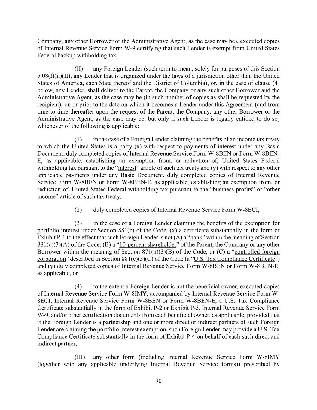 90 Company, any other Borrower or the Administrative Agent, as the case may be), executed copies of Internal Revenue Service Form W-9 certifying that such Lender is exempt from United States Federal backup withholding tax, (II) any Foreign Lender (such term to mean, solely for purposes of this Section 5.08(f)(ii)(II), any Lender that is organized under the laws of a jurisdiction other than the United States of America, each State thereof and the District of Columbia), or, in the case of clause (4) below, any Lender, shall deliver to the Parent, the Company or any such other Borrower and the Administrative Agent, as the case may be (in such number of copies as shall be requested by the recipient), on or prior to the date on which it becomes a Lender under this Agreement (and from time to time thereafter upon the request of the Parent, the Company, any other Borrower or the Administrative Agent, as the case may be, but only if such Lender is legally entitled to do so) whichever of the following is applicable: (1) in the case of a Foreign Lender claiming the benefits of an income tax treaty to which the United States is a party (x) with respect to payments of interest under any Basic Document, duly completed copies of Internal Revenue Service Form W-8BEN or Form W-8BEN- E, as applicable, establishing an exemption from, or reduction of, United States Federal withholding tax pursuant to the “interest” article of such tax treaty and (y) with respect to any other applicable payments under any Basic Document, duly completed copies of Internal Revenue Service Form W-8BEN or Form W-8BEN-E, as applicable, establishing an exemption from, or reduction of, United States Federal withholding tax pursuant to the “business profits” or “other income” article of such tax treaty, (2) duly completed copies of Internal Revenue Service Form W-8ECI, (3) in the case of a Foreign Lender claiming the benefits of the exemption for portfolio interest under Section 881(c) of the Code, (x) a certificate substantially in the form of Exhibit P-1 to the effect that such Foreign Lender is not (A) a “bank” within the meaning of Section 881(c)(3)(A) of the Code, (B) a “10-percent shareholder” of the Parent, the Company or any other Borrower within the meaning of Section 871(h)(3)(B) of the Code, or (C) a “controlled foreign corporation” described in Section 881(c)(3)(C) of the Code (a “U.S. Tax Compliance Certificate”) and (y) duly completed copies of Internal Revenue Service Form W-8BEN or Form W-8BEN-E, as applicable, or (4) to the extent a Foreign Lender is not the beneficial owner, executed copies of Internal Revenue Service Form W-8IMY, accompanied by Internal Revenue Service Form W- 8ECI, Internal Revenue Service Form W-8BEN or Form W-8BEN-E, a U.S. Tax Compliance Certificate substantially in the form of Exhibit P-2 or Exhibit P-3, Internal Revenue Service Form W-9, and/or other certification documents from each beneficial owner, as applicable; provided that if the Foreign Lender is a partnership and one or more direct or indirect partners of such Foreign Lender are claiming the portfolio interest exemption, such Foreign Lender may provide a U.S. Tax Compliance Certificate substantially in the form of Exhibit P-4 on behalf of each such direct and indirect partner, (III) any other form (including Internal Revenue Service Form W-8IMY (together with any applicable underlying Internal Revenue Service forms)) prescribed by