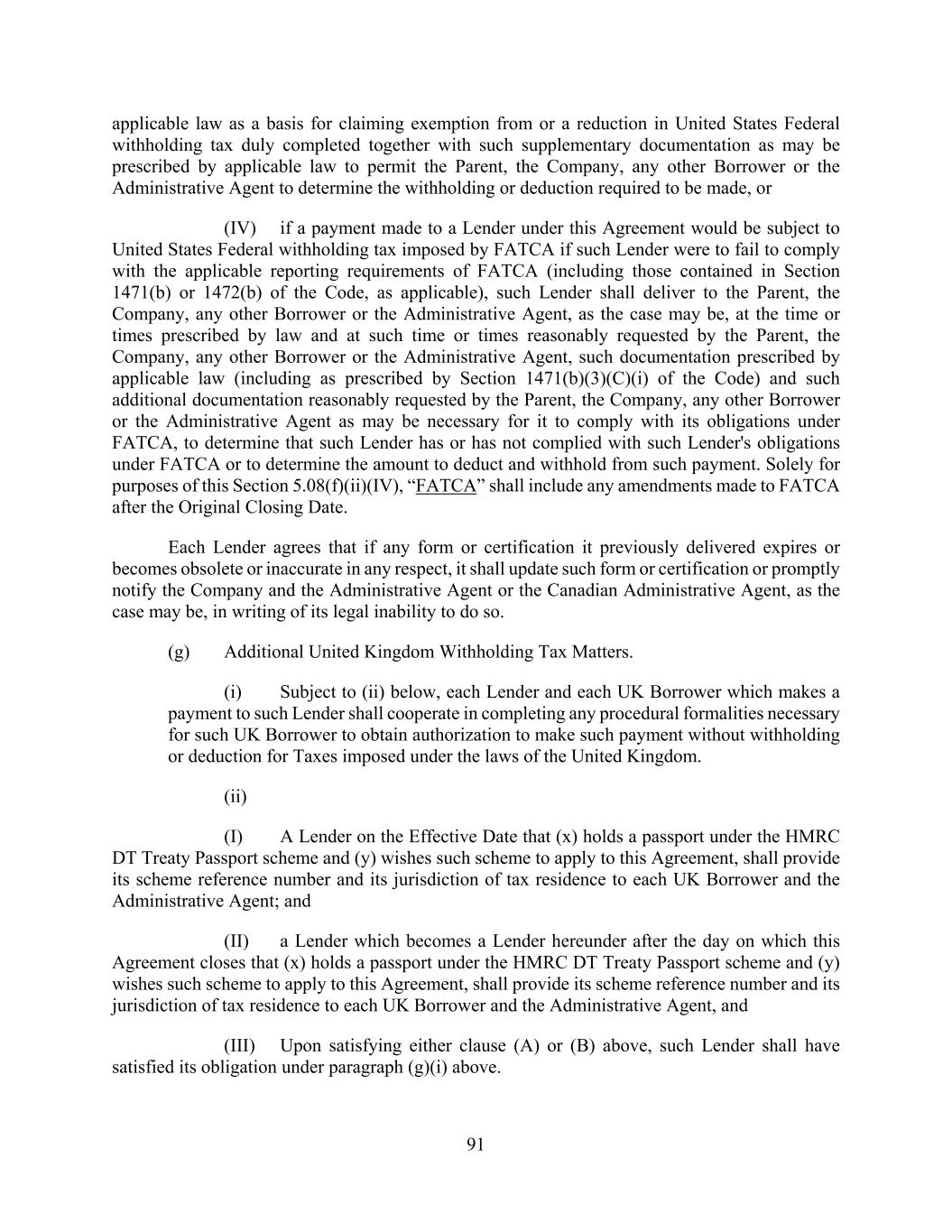 91 applicable law as a basis for claiming exemption from or a reduction in United States Federal withholding tax duly completed together with such supplementary documentation as may be prescribed by applicable law to permit the Parent, the Company, any other Borrower or the Administrative Agent to determine the withholding or deduction required to be made, or (IV) if a payment made to a Lender under this Agreement would be subject to United States Federal withholding tax imposed by FATCA if such Lender were to fail to comply with the applicable reporting requirements of FATCA (including those contained in Section 1471(b) or 1472(b) of the Code, as applicable), such Lender shall deliver to the Parent, the Company, any other Borrower or the Administrative Agent, as the case may be, at the time or times prescribed by law and at such time or times reasonably requested by the Parent, the Company, any other Borrower or the Administrative Agent, such documentation prescribed by applicable law (including as prescribed by Section 1471(b)(3)(C)(i) of the Code) and such additional documentation reasonably requested by the Parent, the Company, any other Borrower or the Administrative Agent as may be necessary for it to comply with its obligations under FATCA, to determine that such Lender has or has not complied with such Lender's obligations under FATCA or to determine the amount to deduct and withhold from such payment. Solely for purposes of this Section 5.08(f)(ii)(IV), “FATCA” shall include any amendments made to FATCA after the Original Closing Date. Each Lender agrees that if any form or certification it previously delivered expires or becomes obsolete or inaccurate in any respect, it shall update such form or certification or promptly notify the Company and the Administrative Agent or the Canadian Administrative Agent, as the case may be, in writing of its legal inability to do so. (g) Additional United Kingdom Withholding Tax Matters. (i) Subject to (ii) below, each Lender and each UK Borrower which makes a payment to such Lender shall cooperate in completing any procedural formalities necessary for such UK Borrower to obtain authorization to make such payment without withholding or deduction for Taxes imposed under the laws of the United Kingdom. (ii) (I) A Lender on the Effective Date that (x) holds a passport under the HMRC DT Treaty Passport scheme and (y) wishes such scheme to apply to this Agreement, shall provide its scheme reference number and its jurisdiction of tax residence to each UK Borrower and the Administrative Agent; and (II) a Lender which becomes a Lender hereunder after the day on which this Agreement closes that (x) holds a passport under the HMRC DT Treaty Passport scheme and (y) wishes such scheme to apply to this Agreement, shall provide its scheme reference number and its jurisdiction of tax residence to each UK Borrower and the Administrative Agent, and (III) Upon satisfying either clause (A) or (B) above, such Lender shall have satisfied its obligation under paragraph (g)(i) above.