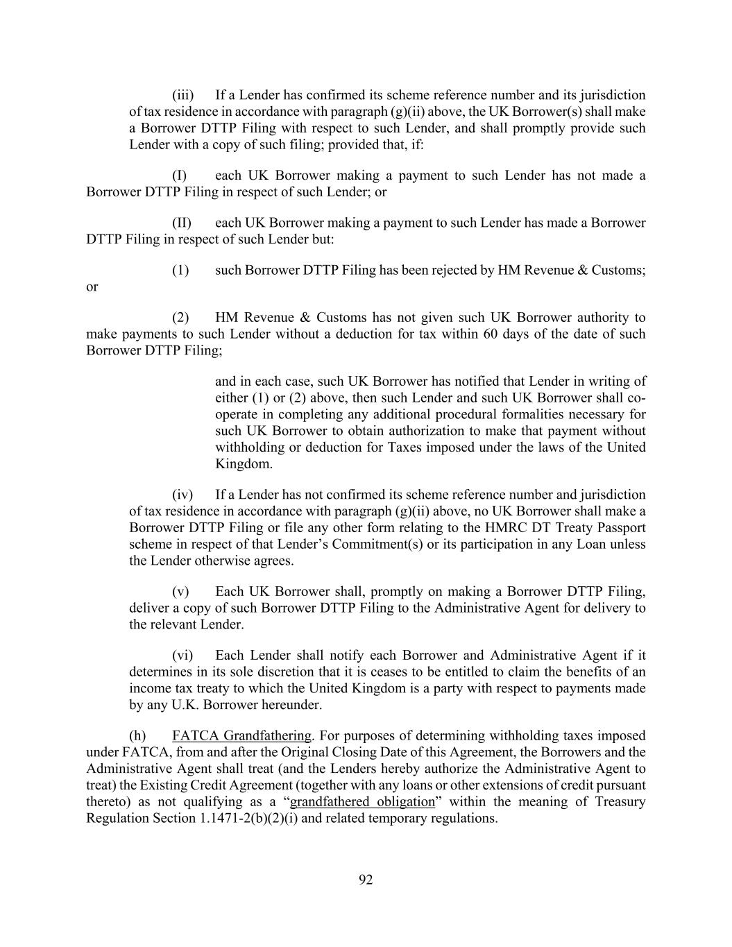 92 (iii) If a Lender has confirmed its scheme reference number and its jurisdiction of tax residence in accordance with paragraph (g)(ii) above, the UK Borrower(s) shall make a Borrower DTTP Filing with respect to such Lender, and shall promptly provide such Lender with a copy of such filing; provided that, if: (I) each UK Borrower making a payment to such Lender has not made a Borrower DTTP Filing in respect of such Lender; or (II) each UK Borrower making a payment to such Lender has made a Borrower DTTP Filing in respect of such Lender but: (1) such Borrower DTTP Filing has been rejected by HM Revenue & Customs; or (2) HM Revenue & Customs has not given such UK Borrower authority to make payments to such Lender without a deduction for tax within 60 days of the date of such Borrower DTTP Filing; and in each case, such UK Borrower has notified that Lender in writing of either (1) or (2) above, then such Lender and such UK Borrower shall co- operate in completing any additional procedural formalities necessary for such UK Borrower to obtain authorization to make that payment without withholding or deduction for Taxes imposed under the laws of the United Kingdom. (iv) If a Lender has not confirmed its scheme reference number and jurisdiction of tax residence in accordance with paragraph (g)(ii) above, no UK Borrower shall make a Borrower DTTP Filing or file any other form relating to the HMRC DT Treaty Passport scheme in respect of that Lender’s Commitment(s) or its participation in any Loan unless the Lender otherwise agrees. (v) Each UK Borrower shall, promptly on making a Borrower DTTP Filing, deliver a copy of such Borrower DTTP Filing to the Administrative Agent for delivery to the relevant Lender. (vi) Each Lender shall notify each Borrower and Administrative Agent if it determines in its sole discretion that it is ceases to be entitled to claim the benefits of an income tax treaty to which the United Kingdom is a party with respect to payments made by any U.K. Borrower hereunder. (h) FATCA Grandfathering. For purposes of determining withholding taxes imposed under FATCA, from and after the Original Closing Date of this Agreement, the Borrowers and the Administrative Agent shall treat (and the Lenders hereby authorize the Administrative Agent to treat) the Existing Credit Agreement (together with any loans or other extensions of credit pursuant thereto) as not qualifying as a “grandfathered obligation” within the meaning of Treasury Regulation Section 1.1471-2(b)(2)(i) and related temporary regulations.