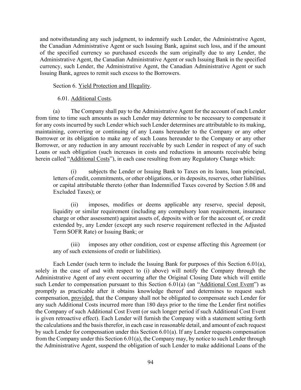 94 and notwithstanding any such judgment, to indemnify such Lender, the Administrative Agent, the Canadian Administrative Agent or such Issuing Bank, against such loss, and if the amount of the specified currency so purchased exceeds the sum originally due to any Lender, the Administrative Agent, the Canadian Administrative Agent or such Issuing Bank in the specified currency, such Lender, the Administrative Agent, the Canadian Administrative Agent or such Issuing Bank, agrees to remit such excess to the Borrowers. Section 6. Yield Protection and Illegality. 6.01. Additional Costs. (a) The Company shall pay to the Administrative Agent for the account of each Lender from time to time such amounts as such Lender may determine to be necessary to compensate it for any costs incurred by such Lender which such Lender determines are attributable to its making, maintaining, converting or continuing of any Loans hereunder to the Company or any other Borrower or its obligation to make any of such Loans hereunder to the Company or any other Borrower, or any reduction in any amount receivable by such Lender in respect of any of such Loans or such obligation (such increases in costs and reductions in amounts receivable being herein called “Additional Costs”), in each case resulting from any Regulatory Change which: (i) subjects the Lender or Issuing Bank to Taxes on its loans, loan principal, letters of credit, commitments, or other obligations, or its deposits, reserves, other liabilities or capital attributable thereto (other than Indemnified Taxes covered by Section 5.08 and Excluded Taxes); or (ii) imposes, modifies or deems applicable any reserve, special deposit, liquidity or similar requirement (including any compulsory loan requirement, insurance charge or other assessment) against assets of, deposits with or for the account of, or credit extended by, any Lender (except any such reserve requirement reflected in the Adjusted Term SOFR Rate) or Issuing Bank; or (iii) imposes any other condition, cost or expense affecting this Agreement (or any of such extensions of credit or liabilities). Each Lender (such term to include the Issuing Bank for purposes of this Section 6.01(a), solely in the case of and with respect to (i) above) will notify the Company through the Administrative Agent of any event occurring after the Original Closing Date which will entitle such Lender to compensation pursuant to this Section 6.01(a) (an “Additional Cost Event”) as promptly as practicable after it obtains knowledge thereof and determines to request such compensation, provided, that the Company shall not be obligated to compensate such Lender for any such Additional Costs incurred more than 180 days prior to the time the Lender first notifies the Company of such Additional Cost Event (or such longer period if such Additional Cost Event is given retroactive effect). Each Lender will furnish the Company with a statement setting forth the calculations and the basis therefor, in each case in reasonable detail, and amount of each request by such Lender for compensation under this Section 6.01(a). If any Lender requests compensation from the Company under this Section 6.01(a), the Company may, by notice to such Lender through the Administrative Agent, suspend the obligation of such Lender to make additional Loans of the