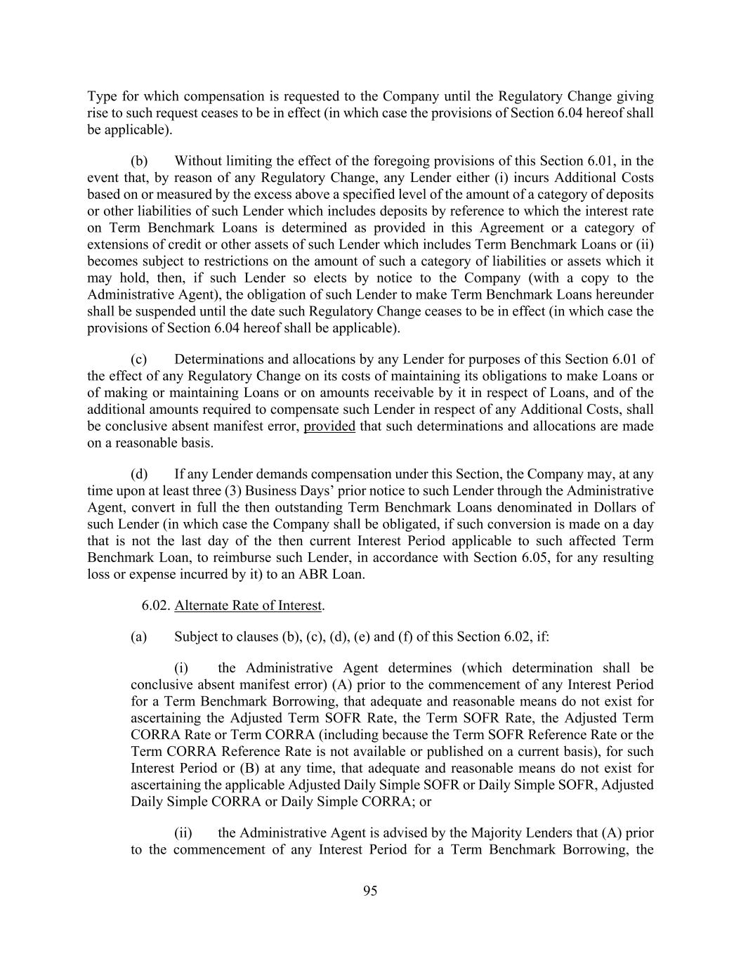 95 Type for which compensation is requested to the Company until the Regulatory Change giving rise to such request ceases to be in effect (in which case the provisions of Section 6.04 hereof shall be applicable). (b) Without limiting the effect of the foregoing provisions of this Section 6.01, in the event that, by reason of any Regulatory Change, any Lender either (i) incurs Additional Costs based on or measured by the excess above a specified level of the amount of a category of deposits or other liabilities of such Lender which includes deposits by reference to which the interest rate on Term Benchmark Loans is determined as provided in this Agreement or a category of extensions of credit or other assets of such Lender which includes Term Benchmark Loans or (ii) becomes subject to restrictions on the amount of such a category of liabilities or assets which it may hold, then, if such Lender so elects by notice to the Company (with a copy to the Administrative Agent), the obligation of such Lender to make Term Benchmark Loans hereunder shall be suspended until the date such Regulatory Change ceases to be in effect (in which case the provisions of Section 6.04 hereof shall be applicable). (c) Determinations and allocations by any Lender for purposes of this Section 6.01 of the effect of any Regulatory Change on its costs of maintaining its obligations to make Loans or of making or maintaining Loans or on amounts receivable by it in respect of Loans, and of the additional amounts required to compensate such Lender in respect of any Additional Costs, shall be conclusive absent manifest error, provided that such determinations and allocations are made on a reasonable basis. (d) If any Lender demands compensation under this Section, the Company may, at any time upon at least three (3) Business Days’ prior notice to such Lender through the Administrative Agent, convert in full the then outstanding Term Benchmark Loans denominated in Dollars of such Lender (in which case the Company shall be obligated, if such conversion is made on a day that is not the last day of the then current Interest Period applicable to such affected Term Benchmark Loan, to reimburse such Lender, in accordance with Section 6.05, for any resulting loss or expense incurred by it) to an ABR Loan. 6.02. Alternate Rate of Interest. (a) Subject to clauses (b), (c), (d), (e) and (f) of this Section 6.02, if: (i) the Administrative Agent determines (which determination shall be conclusive absent manifest error) (A) prior to the commencement of any Interest Period for a Term Benchmark Borrowing, that adequate and reasonable means do not exist for ascertaining the Adjusted Term SOFR Rate, the Term SOFR Rate, the Adjusted Term CORRA Rate or Term CORRA (including because the Term SOFR Reference Rate or the Term CORRA Reference Rate is not available or published on a current basis), for such Interest Period or (B) at any time, that adequate and reasonable means do not exist for ascertaining the applicable Adjusted Daily Simple SOFR or Daily Simple SOFR, Adjusted Daily Simple CORRA or Daily Simple CORRA; or (ii) the Administrative Agent is advised by the Majority Lenders that (A) prior to the commencement of any Interest Period for a Term Benchmark Borrowing, the