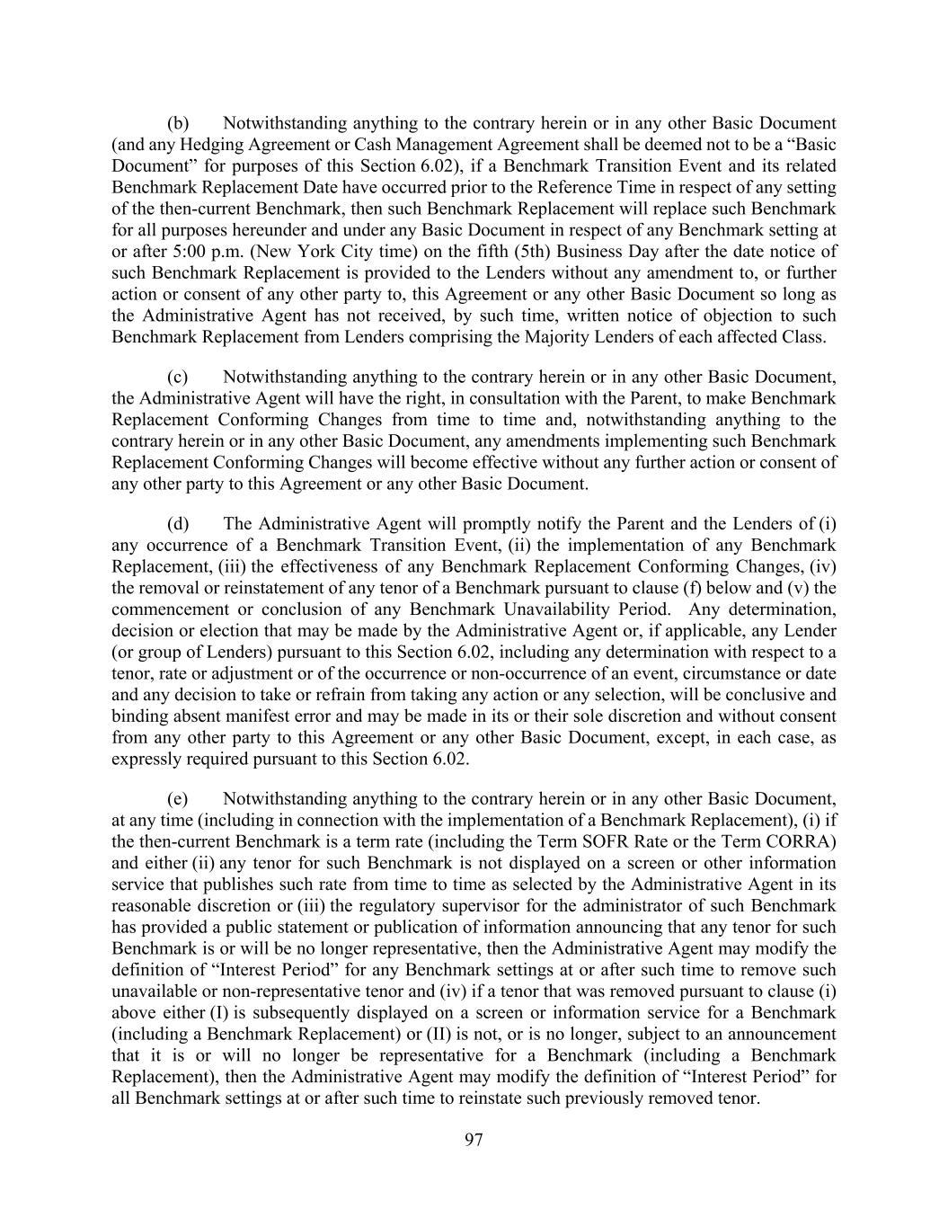 97 (b) Notwithstanding anything to the contrary herein or in any other Basic Document (and any Hedging Agreement or Cash Management Agreement shall be deemed not to be a “Basic Document” for purposes of this Section 6.02), if a Benchmark Transition Event and its related Benchmark Replacement Date have occurred prior to the Reference Time in respect of any setting of the then-current Benchmark, then such Benchmark Replacement will replace such Benchmark for all purposes hereunder and under any Basic Document in respect of any Benchmark setting at or after 5:00 p.m. (New York City time) on the fifth (5th) Business Day after the date notice of such Benchmark Replacement is provided to the Lenders without any amendment to, or further action or consent of any other party to, this Agreement or any other Basic Document so long as the Administrative Agent has not received, by such time, written notice of objection to such Benchmark Replacement from Lenders comprising the Majority Lenders of each affected Class. (c) Notwithstanding anything to the contrary herein or in any other Basic Document, the Administrative Agent will have the right, in consultation with the Parent, to make Benchmark Replacement Conforming Changes from time to time and, notwithstanding anything to the contrary herein or in any other Basic Document, any amendments implementing such Benchmark Replacement Conforming Changes will become effective without any further action or consent of any other party to this Agreement or any other Basic Document. (d) The Administrative Agent will promptly notify the Parent and the Lenders of (i) any occurrence of a Benchmark Transition Event, (ii) the implementation of any Benchmark Replacement, (iii) the effectiveness of any Benchmark Replacement Conforming Changes, (iv) the removal or reinstatement of any tenor of a Benchmark pursuant to clause (f) below and (v) the commencement or conclusion of any Benchmark Unavailability Period. Any determination, decision or election that may be made by the Administrative Agent or, if applicable, any Lender (or group of Lenders) pursuant to this Section 6.02, including any determination with respect to a tenor, rate or adjustment or of the occurrence or non-occurrence of an event, circumstance or date and any decision to take or refrain from taking any action or any selection, will be conclusive and binding absent manifest error and may be made in its or their sole discretion and without consent from any other party to this Agreement or any other Basic Document, except, in each case, as expressly required pursuant to this Section 6.02. (e) Notwithstanding anything to the contrary herein or in any other Basic Document, at any time (including in connection with the implementation of a Benchmark Replacement), (i) if the then-current Benchmark is a term rate (including the Term SOFR Rate or the Term CORRA) and either (ii) any tenor for such Benchmark is not displayed on a screen or other information service that publishes such rate from time to time as selected by the Administrative Agent in its reasonable discretion or (iii) the regulatory supervisor for the administrator of such Benchmark has provided a public statement or publication of information announcing that any tenor for such Benchmark is or will be no longer representative, then the Administrative Agent may modify the definition of “Interest Period” for any Benchmark settings at or after such time to remove such unavailable or non-representative tenor and (iv) if a tenor that was removed pursuant to clause (i) above either (I) is subsequently displayed on a screen or information service for a Benchmark (including a Benchmark Replacement) or (II) is not, or is no longer, subject to an announcement that it is or will no longer be representative for a Benchmark (including a Benchmark Replacement), then the Administrative Agent may modify the definition of “Interest Period” for all Benchmark settings at or after such time to reinstate such previously removed tenor.