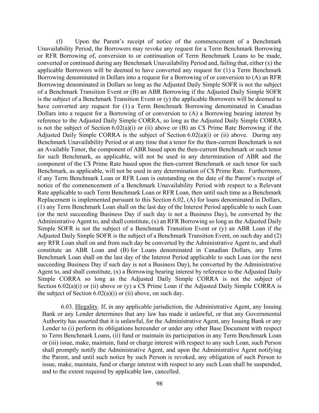 98 (f) Upon the Parent’s receipt of notice of the commencement of a Benchmark Unavailability Period, the Borrowers may revoke any request for a Term Benchmark Borrowing or RFR Borrowing of, conversion to or continuation of Term Benchmark Loans to be made, converted or continued during any Benchmark Unavailability Period and, failing that, either (x) the applicable Borrowers will be deemed to have converted any request for (1) a Term Benchmark Borrowing denominated in Dollars into a request for a Borrowing of or conversion to (A) an RFR Borrowing denominated in Dollars so long as the Adjusted Daily Simple SOFR is not the subject of a Benchmark Transition Event or (B) an ABR Borrowing if the Adjusted Daily Simple SOFR is the subject of a Benchmark Transition Event or (y) the applicable Borrowers will be deemed to have converted any request for (1) a Term Benchmark Borrowing denominated in Canadian Dollars into a request for a Borrowing of or conversion to (A) a Borrowing bearing interest by reference to the Adjusted Daily Simple CORRA, so long as the Adjusted Daily Simple CORRA is not the subject of Section 6.02(a)(i) or (ii) above or (B) an C$ Prime Rate Borrowing if the Adjusted Daily Simple CORRA is the subject of Section 6.02(a)(i) or (ii) above. During any Benchmark Unavailability Period or at any time that a tenor for the then-current Benchmark is not an Available Tenor, the component of ABR based upon the then-current Benchmark or such tenor for such Benchmark, as applicable, will not be used in any determination of ABR and the component of the C$ Prime Rate based upon the then-current Benchmark or such tenor for such Benchmark, as applicable, will not be used in any determination of C$ Prime Rate. Furthermore, if any Term Benchmark Loan or RFR Loan is outstanding on the date of the Parent’s receipt of notice of the commencement of a Benchmark Unavailability Period with respect to a Relevant Rate applicable to such Term Benchmark Loan or RFR Loan, then until such time as a Benchmark Replacement is implemented pursuant to this Section 6.02, (A) for loans denominated in Dollars, (1) any Term Benchmark Loan shall on the last day of the Interest Period applicable to such Loan (or the next succeeding Business Day if such day is not a Business Day), be converted by the Administrative Agent to, and shall constitute, (x) an RFR Borrowing so long as the Adjusted Daily Simple SOFR is not the subject of a Benchmark Transition Event or (y) an ABR Loan if the Adjusted Daily Simple SOFR is the subject of a Benchmark Transition Event, on such day and (2) any RFR Loan shall on and from such day be converted by the Administrative Agent to, and shall constitute an ABR Loan and (B) for Loans denominated in Canadian Dollars, any Term Benchmark Loan shall on the last day of the Interest Period applicable to such Loan (or the next succeeding Business Day if such day is not a Business Day), be converted by the Administrative Agent to, and shall constitute, (x) a Borrowing bearing interest by reference to the Adjusted Daily Simple CORRA so long as the Adjusted Daily Simple CORRA is not the subject of Section 6.02(a)(i) or (ii) above or (y) a C$ Prime Loan if the Adjusted Daily Simple CORRA is the subject of Section 6.02(a)(i) or (ii) above, on such day. 6.03. Illegality. If, in any applicable jurisdiction, the Administrative Agent, any Issuing Bank or any Lender determines that any law has made it unlawful, or that any Governmental Authority has asserted that it is unlawful, for the Administrative Agent, any Issuing Bank or any Lender to (i) perform its obligations hereunder or under any other Base Document with respect to Term Benchmark Loans, (ii) fund or maintain its participation in any Term Benchmark Loan or (iii) issue, make, maintain, fund or charge interest with respect to any such Loan, such Person shall promptly notify the Administrative Agent, and upon the Administrative Agent notifying the Parent, and until such notice by such Person is revoked, any obligation of such Person to issue, make, maintain, fund or charge interest with respect to any such Loan shall be suspended, and to the extent required by applicable law, cancelled.