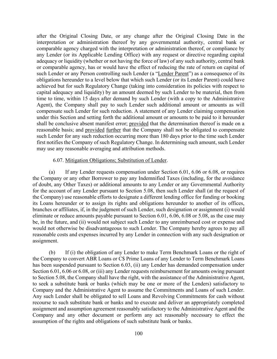 100 after the Original Closing Date, or any change after the Original Closing Date in the interpretation or administration thereof by any governmental authority, central bank or comparable agency charged with the interpretation or administration thereof, or compliance by any Lender (or its Applicable Lending Office) with any request or directive regarding capital adequacy or liquidity (whether or not having the force of law) of any such authority, central bank or comparable agency, has or would have the effect of reducing the rate of return on capital of such Lender or any Person controlling such Lender (a “Lender Parent”) as a consequence of its obligations hereunder to a level below that which such Lender (or its Lender Parent) could have achieved but for such Regulatory Change (taking into consideration its policies with respect to capital adequacy and liquidity) by an amount deemed by such Lender to be material, then from time to time, within 15 days after demand by such Lender (with a copy to the Administrative Agent), the Company shall pay to such Lender such additional amount or amounts as will compensate such Lender for such reduction. A statement of any Lender claiming compensation under this Section and setting forth the additional amount or amounts to be paid to it hereunder shall be conclusive absent manifest error; provided that the determination thereof is made on a reasonable basis; and provided further that the Company shall not be obligated to compensate such Lender for any such reduction occurring more than 180 days prior to the time such Lender first notifies the Company of such Regulatory Change. In determining such amount, such Lender may use any reasonable averaging and attribution methods. 6.07. Mitigation Obligations; Substitution of Lender. (a) If any Lender requests compensation under Section 6.01, 6.06 or 6.08, or requires the Company or any other Borrower to pay any Indemnified Taxes (including, for the avoidance of doubt, any Other Taxes) or additional amounts to any Lender or any Governmental Authority for the account of any Lender pursuant to Section 5.08, then such Lender shall (at the request of the Company) use reasonable efforts to designate a different lending office for funding or booking its Loans hereunder or to assign its rights and obligations hereunder to another of its offices, branches or affiliates, if, in the judgment of such Lender, such designation or assignment (i) would eliminate or reduce amounts payable pursuant to Section 6.01, 6.06, 6.08 or 5.08, as the case may be, in the future, and (ii) would not subject such Lender to any unreimbursed cost or expense and would not otherwise be disadvantageous to such Lender. The Company hereby agrees to pay all reasonable costs and expenses incurred by any Lender in connection with any such designation or assignment. (b) If (i) the obligation of any Lender to make Term Benchmark Loans or the right of the Company to convert ABR Loans or C$ Prime Loans of any Lender to Term Benchmark Loans has been suspended pursuant to Section 6.03, (ii) any Lender has demanded compensation under Section 6.01, 6.06 or 6.08, or (iii) any Lender requests reimbursement for amounts owing pursuant to Section 5.08, the Company shall have the right, with the assistance of the Administrative Agent, to seek a substitute bank or banks (which may be one or more of the Lenders) satisfactory to Company and the Administrative Agent to assume the Commitments and Loans of such Lender. Any such Lender shall be obligated to sell Loans and Revolving Commitments for cash without recourse to such substitute bank or banks and to execute and deliver an appropriately completed assignment and assumption agreement reasonably satisfactory to the Administrative Agent and the Company and any other document or perform any act reasonably necessary to effect the assumption of the rights and obligations of such substitute bank or banks.