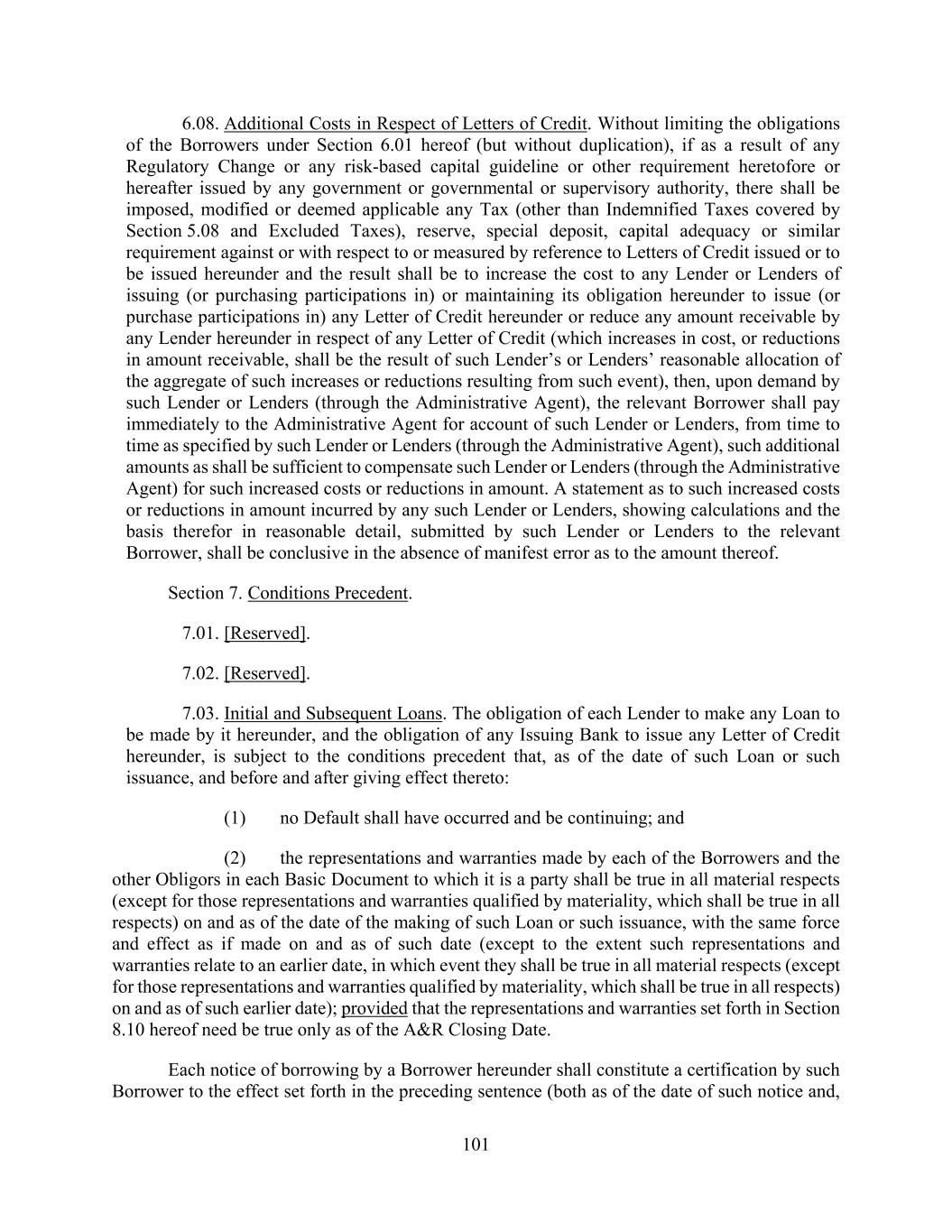 101 6.08. Additional Costs in Respect of Letters of Credit. Without limiting the obligations of the Borrowers under Section 6.01 hereof (but without duplication), if as a result of any Regulatory Change or any risk-based capital guideline or other requirement heretofore or hereafter issued by any government or governmental or supervisory authority, there shall be imposed, modified or deemed applicable any Tax (other than Indemnified Taxes covered by Section 5.08 and Excluded Taxes), reserve, special deposit, capital adequacy or similar requirement against or with respect to or measured by reference to Letters of Credit issued or to be issued hereunder and the result shall be to increase the cost to any Lender or Lenders of issuing (or purchasing participations in) or maintaining its obligation hereunder to issue (or purchase participations in) any Letter of Credit hereunder or reduce any amount receivable by any Lender hereunder in respect of any Letter of Credit (which increases in cost, or reductions in amount receivable, shall be the result of such Lender’s or Lenders’ reasonable allocation of the aggregate of such increases or reductions resulting from such event), then, upon demand by such Lender or Lenders (through the Administrative Agent), the relevant Borrower shall pay immediately to the Administrative Agent for account of such Lender or Lenders, from time to time as specified by such Lender or Lenders (through the Administrative Agent), such additional amounts as shall be sufficient to compensate such Lender or Lenders (through the Administrative Agent) for such increased costs or reductions in amount. A statement as to such increased costs or reductions in amount incurred by any such Lender or Lenders, showing calculations and the basis therefor in reasonable detail, submitted by such Lender or Lenders to the relevant Borrower, shall be conclusive in the absence of manifest error as to the amount thereof. Section 7. Conditions Precedent. 7.01. [Reserved]. 7.02. [Reserved]. 7.03. Initial and Subsequent Loans. The obligation of each Lender to make any Loan to be made by it hereunder, and the obligation of any Issuing Bank to issue any Letter of Credit hereunder, is subject to the conditions precedent that, as of the date of such Loan or such issuance, and before and after giving effect thereto: (1) no Default shall have occurred and be continuing; and (2) the representations and warranties made by each of the Borrowers and the other Obligors in each Basic Document to which it is a party shall be true in all material respects (except for those representations and warranties qualified by materiality, which shall be true in all respects) on and as of the date of the making of such Loan or such issuance, with the same force and effect as if made on and as of such date (except to the extent such representations and warranties relate to an earlier date, in which event they shall be true in all material respects (except for those representations and warranties qualified by materiality, which shall be true in all respects) on and as of such earlier date); provided that the representations and warranties set forth in Section 8.10 hereof need be true only as of the A&R Closing Date. Each notice of borrowing by a Borrower hereunder shall constitute a certification by such Borrower to the effect set forth in the preceding sentence (both as of the date of such notice and,