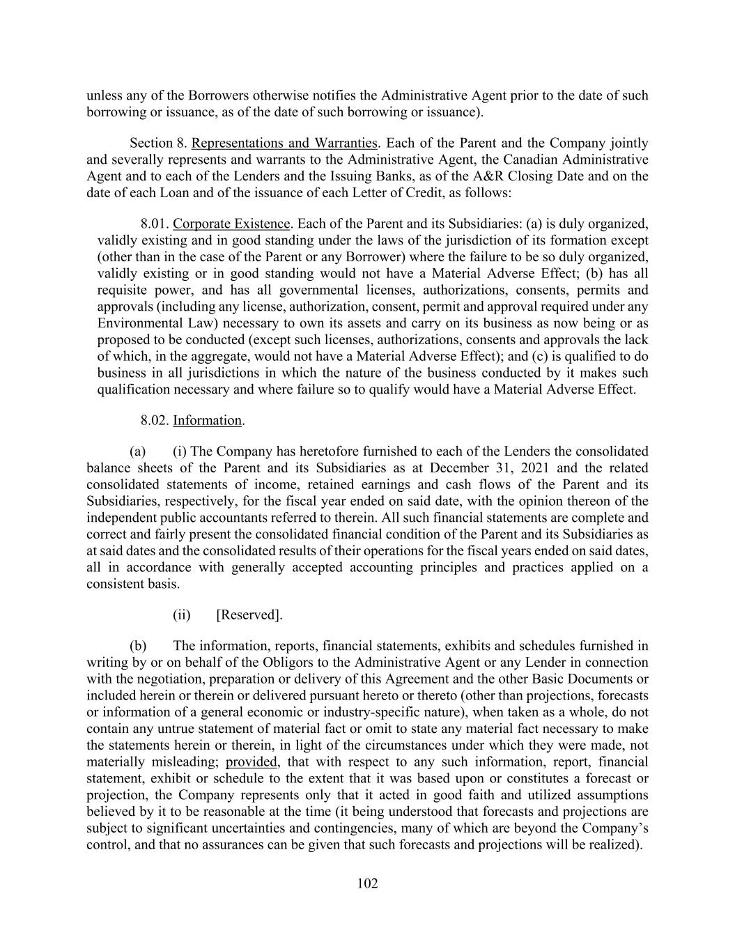 102 unless any of the Borrowers otherwise notifies the Administrative Agent prior to the date of such borrowing or issuance, as of the date of such borrowing or issuance). Section 8. Representations and Warranties. Each of the Parent and the Company jointly and severally represents and warrants to the Administrative Agent, the Canadian Administrative Agent and to each of the Lenders and the Issuing Banks, as of the A&R Closing Date and on the date of each Loan and of the issuance of each Letter of Credit, as follows: 8.01. Corporate Existence. Each of the Parent and its Subsidiaries: (a) is duly organized, validly existing and in good standing under the laws of the jurisdiction of its formation except (other than in the case of the Parent or any Borrower) where the failure to be so duly organized, validly existing or in good standing would not have a Material Adverse Effect; (b) has all requisite power, and has all governmental licenses, authorizations, consents, permits and approvals (including any license, authorization, consent, permit and approval required under any Environmental Law) necessary to own its assets and carry on its business as now being or as proposed to be conducted (except such licenses, authorizations, consents and approvals the lack of which, in the aggregate, would not have a Material Adverse Effect); and (c) is qualified to do business in all jurisdictions in which the nature of the business conducted by it makes such qualification necessary and where failure so to qualify would have a Material Adverse Effect. 8.02. Information. (a) (i) The Company has heretofore furnished to each of the Lenders the consolidated balance sheets of the Parent and its Subsidiaries as at December 31, 2021 and the related consolidated statements of income, retained earnings and cash flows of the Parent and its Subsidiaries, respectively, for the fiscal year ended on said date, with the opinion thereon of the independent public accountants referred to therein. All such financial statements are complete and correct and fairly present the consolidated financial condition of the Parent and its Subsidiaries as at said dates and the consolidated results of their operations for the fiscal years ended on said dates, all in accordance with generally accepted accounting principles and practices applied on a consistent basis. (ii) [Reserved]. (b) The information, reports, financial statements, exhibits and schedules furnished in writing by or on behalf of the Obligors to the Administrative Agent or any Lender in connection with the negotiation, preparation or delivery of this Agreement and the other Basic Documents or included herein or therein or delivered pursuant hereto or thereto (other than projections, forecasts or information of a general economic or industry-specific nature), when taken as a whole, do not contain any untrue statement of material fact or omit to state any material fact necessary to make the statements herein or therein, in light of the circumstances under which they were made, not materially misleading; provided, that with respect to any such information, report, financial statement, exhibit or schedule to the extent that it was based upon or constitutes a forecast or projection, the Company represents only that it acted in good faith and utilized assumptions believed by it to be reasonable at the time (it being understood that forecasts and projections are subject to significant uncertainties and contingencies, many of which are beyond the Company’s control, and that no assurances can be given that such forecasts and projections will be realized).