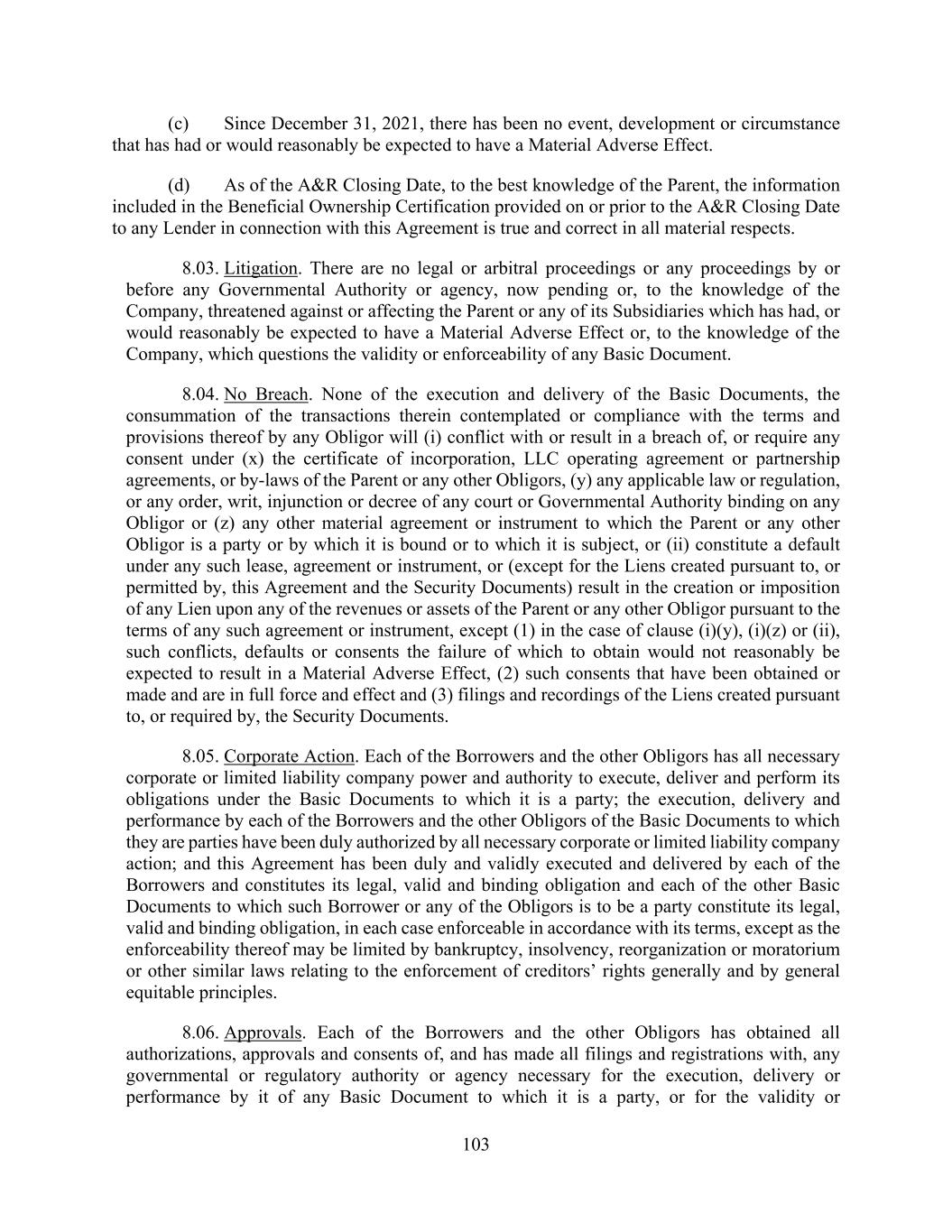 103 (c) Since December 31, 2021, there has been no event, development or circumstance that has had or would reasonably be expected to have a Material Adverse Effect. (d) As of the A&R Closing Date, to the best knowledge of the Parent, the information included in the Beneficial Ownership Certification provided on or prior to the A&R Closing Date to any Lender in connection with this Agreement is true and correct in all material respects. 8.03. Litigation. There are no legal or arbitral proceedings or any proceedings by or before any Governmental Authority or agency, now pending or, to the knowledge of the Company, threatened against or affecting the Parent or any of its Subsidiaries which has had, or would reasonably be expected to have a Material Adverse Effect or, to the knowledge of the Company, which questions the validity or enforceability of any Basic Document. 8.04. No Breach. None of the execution and delivery of the Basic Documents, the consummation of the transactions therein contemplated or compliance with the terms and provisions thereof by any Obligor will (i) conflict with or result in a breach of, or require any consent under (x) the certificate of incorporation, LLC operating agreement or partnership agreements, or by-laws of the Parent or any other Obligors, (y) any applicable law or regulation, or any order, writ, injunction or decree of any court or Governmental Authority binding on any Obligor or (z) any other material agreement or instrument to which the Parent or any other Obligor is a party or by which it is bound or to which it is subject, or (ii) constitute a default under any such lease, agreement or instrument, or (except for the Liens created pursuant to, or permitted by, this Agreement and the Security Documents) result in the creation or imposition of any Lien upon any of the revenues or assets of the Parent or any other Obligor pursuant to the terms of any such agreement or instrument, except (1) in the case of clause (i)(y), (i)(z) or (ii), such conflicts, defaults or consents the failure of which to obtain would not reasonably be expected to result in a Material Adverse Effect, (2) such consents that have been obtained or made and are in full force and effect and (3) filings and recordings of the Liens created pursuant to, or required by, the Security Documents. 8.05. Corporate Action. Each of the Borrowers and the other Obligors has all necessary corporate or limited liability company power and authority to execute, deliver and perform its obligations under the Basic Documents to which it is a party; the execution, delivery and performance by each of the Borrowers and the other Obligors of the Basic Documents to which they are parties have been duly authorized by all necessary corporate or limited liability company action; and this Agreement has been duly and validly executed and delivered by each of the Borrowers and constitutes its legal, valid and binding obligation and each of the other Basic Documents to which such Borrower or any of the Obligors is to be a party constitute its legal, valid and binding obligation, in each case enforceable in accordance with its terms, except as the enforceability thereof may be limited by bankruptcy, insolvency, reorganization or moratorium or other similar laws relating to the enforcement of creditors’ rights generally and by general equitable principles. 8.06. Approvals. Each of the Borrowers and the other Obligors has obtained all authorizations, approvals and consents of, and has made all filings and registrations with, any governmental or regulatory authority or agency necessary for the execution, delivery or performance by it of any Basic Document to which it is a party, or for the validity or