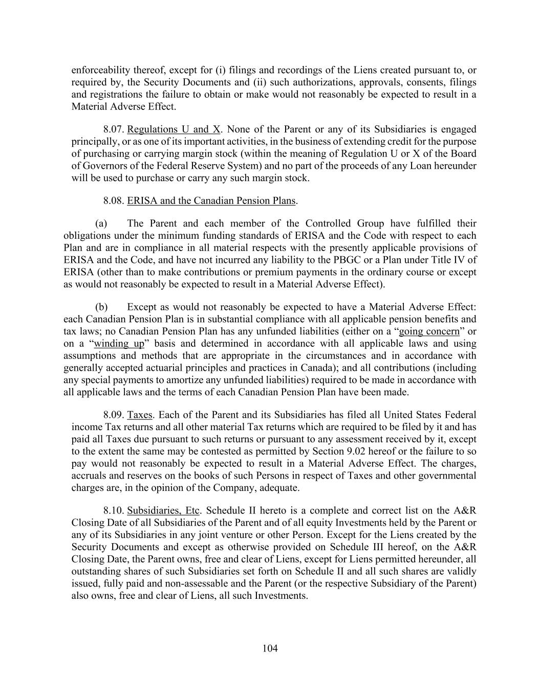 104 enforceability thereof, except for (i) filings and recordings of the Liens created pursuant to, or required by, the Security Documents and (ii) such authorizations, approvals, consents, filings and registrations the failure to obtain or make would not reasonably be expected to result in a Material Adverse Effect. 8.07. Regulations U and X. None of the Parent or any of its Subsidiaries is engaged principally, or as one of its important activities, in the business of extending credit for the purpose of purchasing or carrying margin stock (within the meaning of Regulation U or X of the Board of Governors of the Federal Reserve System) and no part of the proceeds of any Loan hereunder will be used to purchase or carry any such margin stock. 8.08. ERISA and the Canadian Pension Plans. (a) The Parent and each member of the Controlled Group have fulfilled their obligations under the minimum funding standards of ERISA and the Code with respect to each Plan and are in compliance in all material respects with the presently applicable provisions of ERISA and the Code, and have not incurred any liability to the PBGC or a Plan under Title IV of ERISA (other than to make contributions or premium payments in the ordinary course or except as would not reasonably be expected to result in a Material Adverse Effect). (b) Except as would not reasonably be expected to have a Material Adverse Effect: each Canadian Pension Plan is in substantial compliance with all applicable pension benefits and tax laws; no Canadian Pension Plan has any unfunded liabilities (either on a “going concern” or on a “winding up” basis and determined in accordance with all applicable laws and using assumptions and methods that are appropriate in the circumstances and in accordance with generally accepted actuarial principles and practices in Canada); and all contributions (including any special payments to amortize any unfunded liabilities) required to be made in accordance with all applicable laws and the terms of each Canadian Pension Plan have been made. 8.09. Taxes. Each of the Parent and its Subsidiaries has filed all United States Federal income Tax returns and all other material Tax returns which are required to be filed by it and has paid all Taxes due pursuant to such returns or pursuant to any assessment received by it, except to the extent the same may be contested as permitted by Section 9.02 hereof or the failure to so pay would not reasonably be expected to result in a Material Adverse Effect. The charges, accruals and reserves on the books of such Persons in respect of Taxes and other governmental charges are, in the opinion of the Company, adequate. 8.10. Subsidiaries, Etc. Schedule II hereto is a complete and correct list on the A&R Closing Date of all Subsidiaries of the Parent and of all equity Investments held by the Parent or any of its Subsidiaries in any joint venture or other Person. Except for the Liens created by the Security Documents and except as otherwise provided on Schedule III hereof, on the A&R Closing Date, the Parent owns, free and clear of Liens, except for Liens permitted hereunder, all outstanding shares of such Subsidiaries set forth on Schedule II and all such shares are validly issued, fully paid and non-assessable and the Parent (or the respective Subsidiary of the Parent) also owns, free and clear of Liens, all such Investments.