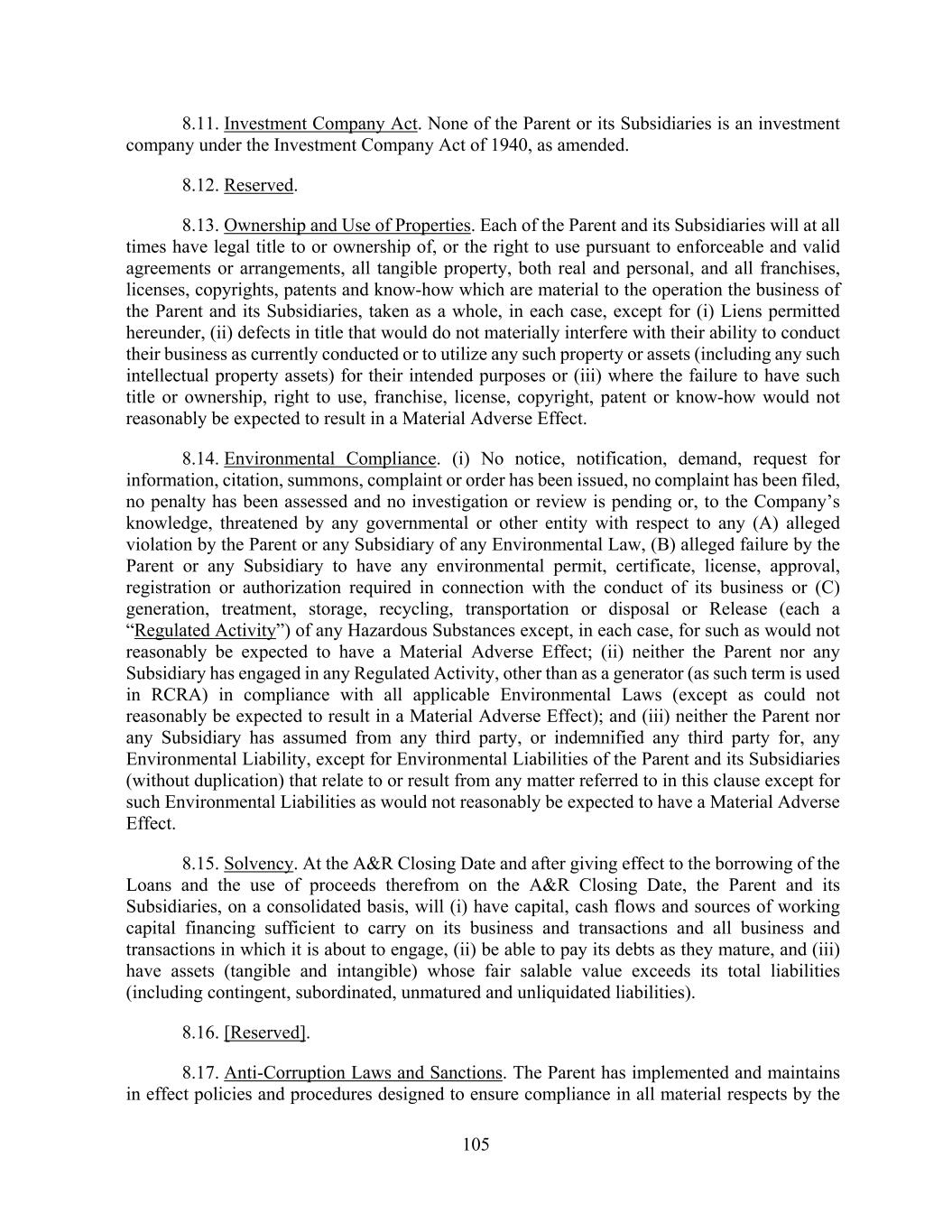 105 8.11. Investment Company Act. None of the Parent or its Subsidiaries is an investment company under the Investment Company Act of 1940, as amended. 8.12. Reserved. 8.13. Ownership and Use of Properties. Each of the Parent and its Subsidiaries will at all times have legal title to or ownership of, or the right to use pursuant to enforceable and valid agreements or arrangements, all tangible property, both real and personal, and all franchises, licenses, copyrights, patents and know-how which are material to the operation the business of the Parent and its Subsidiaries, taken as a whole, in each case, except for (i) Liens permitted hereunder, (ii) defects in title that would do not materially interfere with their ability to conduct their business as currently conducted or to utilize any such property or assets (including any such intellectual property assets) for their intended purposes or (iii) where the failure to have such title or ownership, right to use, franchise, license, copyright, patent or know-how would not reasonably be expected to result in a Material Adverse Effect. 8.14. Environmental Compliance. (i) No notice, notification, demand, request for information, citation, summons, complaint or order has been issued, no complaint has been filed, no penalty has been assessed and no investigation or review is pending or, to the Company’s knowledge, threatened by any governmental or other entity with respect to any (A) alleged violation by the Parent or any Subsidiary of any Environmental Law, (B) alleged failure by the Parent or any Subsidiary to have any environmental permit, certificate, license, approval, registration or authorization required in connection with the conduct of its business or (C) generation, treatment, storage, recycling, transportation or disposal or Release (each a “Regulated Activity”) of any Hazardous Substances except, in each case, for such as would not reasonably be expected to have a Material Adverse Effect; (ii) neither the Parent nor any Subsidiary has engaged in any Regulated Activity, other than as a generator (as such term is used in RCRA) in compliance with all applicable Environmental Laws (except as could not reasonably be expected to result in a Material Adverse Effect); and (iii) neither the Parent nor any Subsidiary has assumed from any third party, or indemnified any third party for, any Environmental Liability, except for Environmental Liabilities of the Parent and its Subsidiaries (without duplication) that relate to or result from any matter referred to in this clause except for such Environmental Liabilities as would not reasonably be expected to have a Material Adverse Effect. 8.15. Solvency. At the A&R Closing Date and after giving effect to the borrowing of the Loans and the use of proceeds therefrom on the A&R Closing Date, the Parent and its Subsidiaries, on a consolidated basis, will (i) have capital, cash flows and sources of working capital financing sufficient to carry on its business and transactions and all business and transactions in which it is about to engage, (ii) be able to pay its debts as they mature, and (iii) have assets (tangible and intangible) whose fair salable value exceeds its total liabilities (including contingent, subordinated, unmatured and unliquidated liabilities). 8.16. [Reserved]. 8.17. Anti-Corruption Laws and Sanctions. The Parent has implemented and maintains in effect policies and procedures designed to ensure compliance in all material respects by the