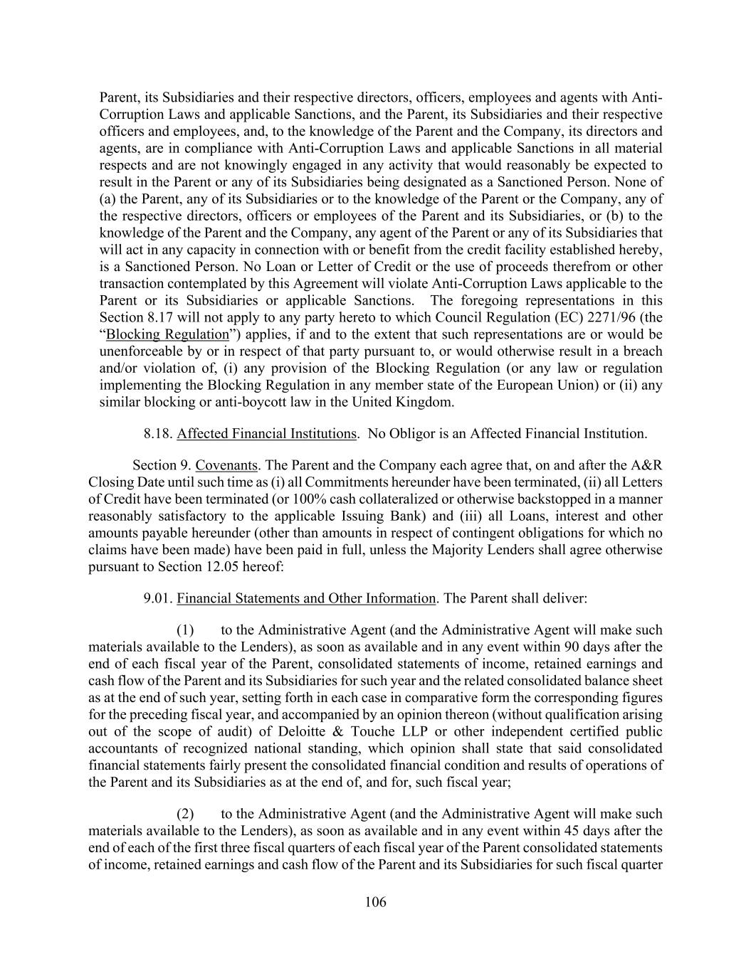 106 Parent, its Subsidiaries and their respective directors, officers, employees and agents with Anti- Corruption Laws and applicable Sanctions, and the Parent, its Subsidiaries and their respective officers and employees, and, to the knowledge of the Parent and the Company, its directors and agents, are in compliance with Anti-Corruption Laws and applicable Sanctions in all material respects and are not knowingly engaged in any activity that would reasonably be expected to result in the Parent or any of its Subsidiaries being designated as a Sanctioned Person. None of (a) the Parent, any of its Subsidiaries or to the knowledge of the Parent or the Company, any of the respective directors, officers or employees of the Parent and its Subsidiaries, or (b) to the knowledge of the Parent and the Company, any agent of the Parent or any of its Subsidiaries that will act in any capacity in connection with or benefit from the credit facility established hereby, is a Sanctioned Person. No Loan or Letter of Credit or the use of proceeds therefrom or other transaction contemplated by this Agreement will violate Anti-Corruption Laws applicable to the Parent or its Subsidiaries or applicable Sanctions. The foregoing representations in this Section 8.17 will not apply to any party hereto to which Council Regulation (EC) 2271/96 (the “Blocking Regulation”) applies, if and to the extent that such representations are or would be unenforceable by or in respect of that party pursuant to, or would otherwise result in a breach and/or violation of, (i) any provision of the Blocking Regulation (or any law or regulation implementing the Blocking Regulation in any member state of the European Union) or (ii) any similar blocking or anti-boycott law in the United Kingdom. 8.18. Affected Financial Institutions. No Obligor is an Affected Financial Institution. Section 9. Covenants. The Parent and the Company each agree that, on and after the A&R Closing Date until such time as (i) all Commitments hereunder have been terminated, (ii) all Letters of Credit have been terminated (or 100% cash collateralized or otherwise backstopped in a manner reasonably satisfactory to the applicable Issuing Bank) and (iii) all Loans, interest and other amounts payable hereunder (other than amounts in respect of contingent obligations for which no claims have been made) have been paid in full, unless the Majority Lenders shall agree otherwise pursuant to Section 12.05 hereof: 9.01. Financial Statements and Other Information. The Parent shall deliver: (1) to the Administrative Agent (and the Administrative Agent will make such materials available to the Lenders), as soon as available and in any event within 90 days after the end of each fiscal year of the Parent, consolidated statements of income, retained earnings and cash flow of the Parent and its Subsidiaries for such year and the related consolidated balance sheet as at the end of such year, setting forth in each case in comparative form the corresponding figures for the preceding fiscal year, and accompanied by an opinion thereon (without qualification arising out of the scope of audit) of Deloitte & Touche LLP or other independent certified public accountants of recognized national standing, which opinion shall state that said consolidated financial statements fairly present the consolidated financial condition and results of operations of the Parent and its Subsidiaries as at the end of, and for, such fiscal year; (2) to the Administrative Agent (and the Administrative Agent will make such materials available to the Lenders), as soon as available and in any event within 45 days after the end of each of the first three fiscal quarters of each fiscal year of the Parent consolidated statements of income, retained earnings and cash flow of the Parent and its Subsidiaries for such fiscal quarter