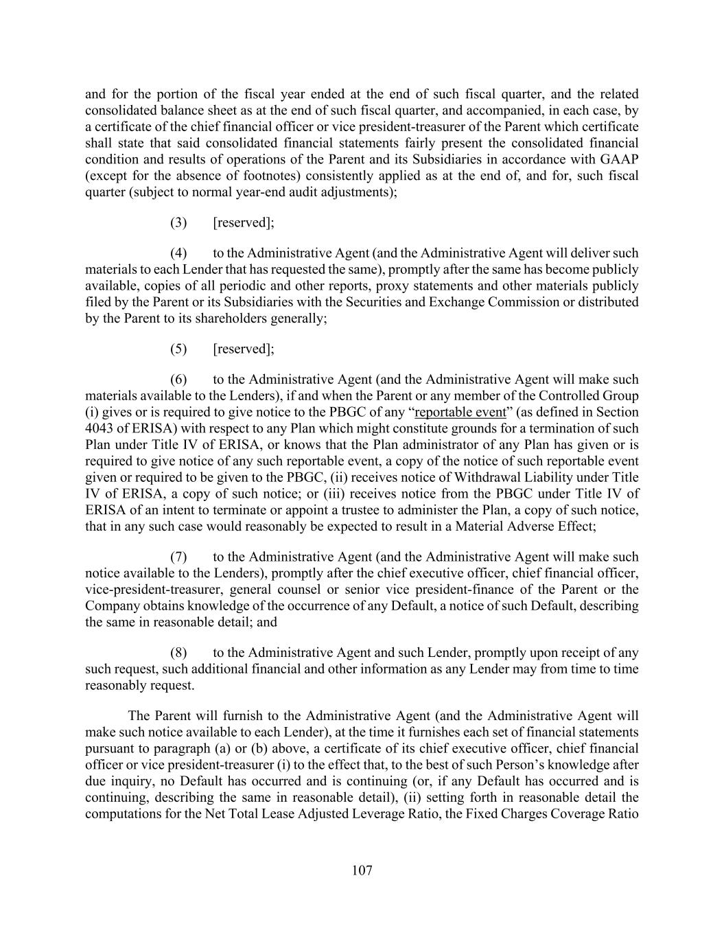 107 and for the portion of the fiscal year ended at the end of such fiscal quarter, and the related consolidated balance sheet as at the end of such fiscal quarter, and accompanied, in each case, by a certificate of the chief financial officer or vice president-treasurer of the Parent which certificate shall state that said consolidated financial statements fairly present the consolidated financial condition and results of operations of the Parent and its Subsidiaries in accordance with GAAP (except for the absence of footnotes) consistently applied as at the end of, and for, such fiscal quarter (subject to normal year-end audit adjustments); (3) [reserved]; (4) to the Administrative Agent (and the Administrative Agent will deliver such materials to each Lender that has requested the same), promptly after the same has become publicly available, copies of all periodic and other reports, proxy statements and other materials publicly filed by the Parent or its Subsidiaries with the Securities and Exchange Commission or distributed by the Parent to its shareholders generally; (5) [reserved]; (6) to the Administrative Agent (and the Administrative Agent will make such materials available to the Lenders), if and when the Parent or any member of the Controlled Group (i) gives or is required to give notice to the PBGC of any “reportable event” (as defined in Section 4043 of ERISA) with respect to any Plan which might constitute grounds for a termination of such Plan under Title IV of ERISA, or knows that the Plan administrator of any Plan has given or is required to give notice of any such reportable event, a copy of the notice of such reportable event given or required to be given to the PBGC, (ii) receives notice of Withdrawal Liability under Title IV of ERISA, a copy of such notice; or (iii) receives notice from the PBGC under Title IV of ERISA of an intent to terminate or appoint a trustee to administer the Plan, a copy of such notice, that in any such case would reasonably be expected to result in a Material Adverse Effect; (7) to the Administrative Agent (and the Administrative Agent will make such notice available to the Lenders), promptly after the chief executive officer, chief financial officer, vice-president-treasurer, general counsel or senior vice president-finance of the Parent or the Company obtains knowledge of the occurrence of any Default, a notice of such Default, describing the same in reasonable detail; and (8) to the Administrative Agent and such Lender, promptly upon receipt of any such request, such additional financial and other information as any Lender may from time to time reasonably request. The Parent will furnish to the Administrative Agent (and the Administrative Agent will make such notice available to each Lender), at the time it furnishes each set of financial statements pursuant to paragraph (a) or (b) above, a certificate of its chief executive officer, chief financial officer or vice president-treasurer (i) to the effect that, to the best of such Person’s knowledge after due inquiry, no Default has occurred and is continuing (or, if any Default has occurred and is continuing, describing the same in reasonable detail), (ii) setting forth in reasonable detail the computations for the Net Total Lease Adjusted Leverage Ratio, the Fixed Charges Coverage Ratio