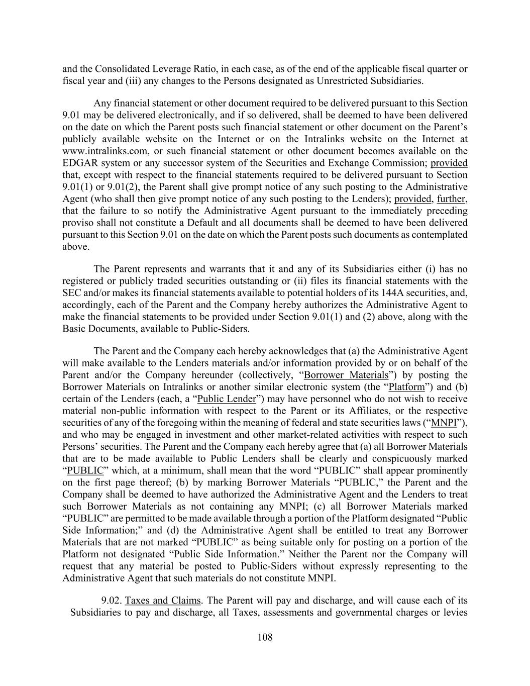 108 and the Consolidated Leverage Ratio, in each case, as of the end of the applicable fiscal quarter or fiscal year and (iii) any changes to the Persons designated as Unrestricted Subsidiaries. Any financial statement or other document required to be delivered pursuant to this Section 9.01 may be delivered electronically, and if so delivered, shall be deemed to have been delivered on the date on which the Parent posts such financial statement or other document on the Parent’s publicly available website on the Internet or on the Intralinks website on the Internet at www.intralinks.com, or such financial statement or other document becomes available on the EDGAR system or any successor system of the Securities and Exchange Commission; provided that, except with respect to the financial statements required to be delivered pursuant to Section 9.01(1) or 9.01(2), the Parent shall give prompt notice of any such posting to the Administrative Agent (who shall then give prompt notice of any such posting to the Lenders); provided, further, that the failure to so notify the Administrative Agent pursuant to the immediately preceding proviso shall not constitute a Default and all documents shall be deemed to have been delivered pursuant to this Section 9.01 on the date on which the Parent posts such documents as contemplated above. The Parent represents and warrants that it and any of its Subsidiaries either (i) has no registered or publicly traded securities outstanding or (ii) files its financial statements with the SEC and/or makes its financial statements available to potential holders of its 144A securities, and, accordingly, each of the Parent and the Company hereby authorizes the Administrative Agent to make the financial statements to be provided under Section 9.01(1) and (2) above, along with the Basic Documents, available to Public-Siders. The Parent and the Company each hereby acknowledges that (a) the Administrative Agent will make available to the Lenders materials and/or information provided by or on behalf of the Parent and/or the Company hereunder (collectively, “Borrower Materials”) by posting the Borrower Materials on Intralinks or another similar electronic system (the “Platform”) and (b) certain of the Lenders (each, a “Public Lender”) may have personnel who do not wish to receive material non-public information with respect to the Parent or its Affiliates, or the respective securities of any of the foregoing within the meaning of federal and state securities laws (“MNPI”), and who may be engaged in investment and other market-related activities with respect to such Persons’ securities. The Parent and the Company each hereby agree that (a) all Borrower Materials that are to be made available to Public Lenders shall be clearly and conspicuously marked “PUBLIC” which, at a minimum, shall mean that the word “PUBLIC” shall appear prominently on the first page thereof; (b) by marking Borrower Materials “PUBLIC,” the Parent and the Company shall be deemed to have authorized the Administrative Agent and the Lenders to treat such Borrower Materials as not containing any MNPI; (c) all Borrower Materials marked “PUBLIC” are permitted to be made available through a portion of the Platform designated “Public Side Information;” and (d) the Administrative Agent shall be entitled to treat any Borrower Materials that are not marked “PUBLIC” as being suitable only for posting on a portion of the Platform not designated “Public Side Information.” Neither the Parent nor the Company will request that any material be posted to Public-Siders without expressly representing to the Administrative Agent that such materials do not constitute MNPI. 9.02. Taxes and Claims. The Parent will pay and discharge, and will cause each of its Subsidiaries to pay and discharge, all Taxes, assessments and governmental charges or levies