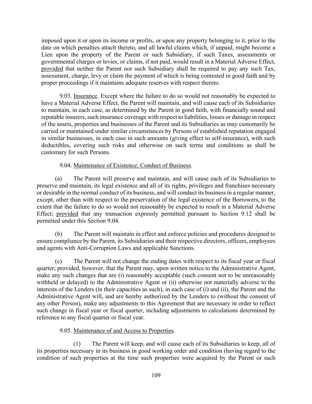 109 imposed upon it or upon its income or profits, or upon any property belonging to it, prior to the date on which penalties attach thereto, and all lawful claims which, if unpaid, might become a Lien upon the property of the Parent or such Subsidiary, if such Taxes, assessments or governmental charges or levies, or claims, if not paid, would result in a Material Adverse Effect, provided that neither the Parent nor such Subsidiary shall be required to pay any such Tax, assessment, charge, levy or claim the payment of which is being contested in good faith and by proper proceedings if it maintains adequate reserves with respect thereto. 9.03. Insurance. Except where the failure to do so would not reasonably be expected to have a Material Adverse Effect, the Parent will maintain, and will cause each of its Subsidiaries to maintain, in each case, as determined by the Parent in good faith, with financially sound and reputable insurers, such insurance coverage with respect to liabilities, losses or damage in respect of the assets, properties and businesses of the Parent and its Subsidiaries as may customarily be carried or maintained under similar circumstances by Persons of established reputation engaged in similar businesses, in each case in such amounts (giving effect to self-insurance), with such deductibles, covering such risks and otherwise on such terms and conditions as shall be customary for such Persons. 9.04. Maintenance of Existence; Conduct of Business. (a) The Parent will preserve and maintain, and will cause each of its Subsidiaries to preserve and maintain, its legal existence and all of its rights, privileges and franchises necessary or desirable in the normal conduct of its business, and will conduct its business in a regular manner, except, other than with respect to the preservation of the legal existence of the Borrowers, to the extent that the failure to do so would not reasonably be expected to result in a Material Adverse Effect; provided that any transaction expressly permitted pursuant to Section 9.12 shall be permitted under this Section 9.04. (b) The Parent will maintain in effect and enforce policies and procedures designed to ensure compliance by the Parent, its Subsidiaries and their respective directors, officers, employees and agents with Anti-Corruption Laws and applicable Sanctions. (c) The Parent will not change the ending dates with respect to its fiscal year or fiscal quarter; provided, however, that the Parent may, upon written notice to the Administrative Agent, make any such changes that are (i) reasonably acceptable (such consent not to be unreasonably withheld or delayed) to the Administrative Agent or (ii) otherwise not materially adverse to the interests of the Lenders (in their capacities as such), in each case of (i) and (ii), the Parent and the Administrative Agent will, and are hereby authorized by the Lenders to (without the consent of any other Person), make any adjustments to this Agreement that are necessary in order to reflect such change in fiscal year or fiscal quarter, including adjustments to calculations determined by reference to any fiscal quarter or fiscal year. 9.05. Maintenance of and Access to Properties. (1) The Parent will keep, and will cause each of its Subsidiaries to keep, all of its properties necessary in its business in good working order and condition (having regard to the condition of such properties at the time such properties were acquired by the Parent or such