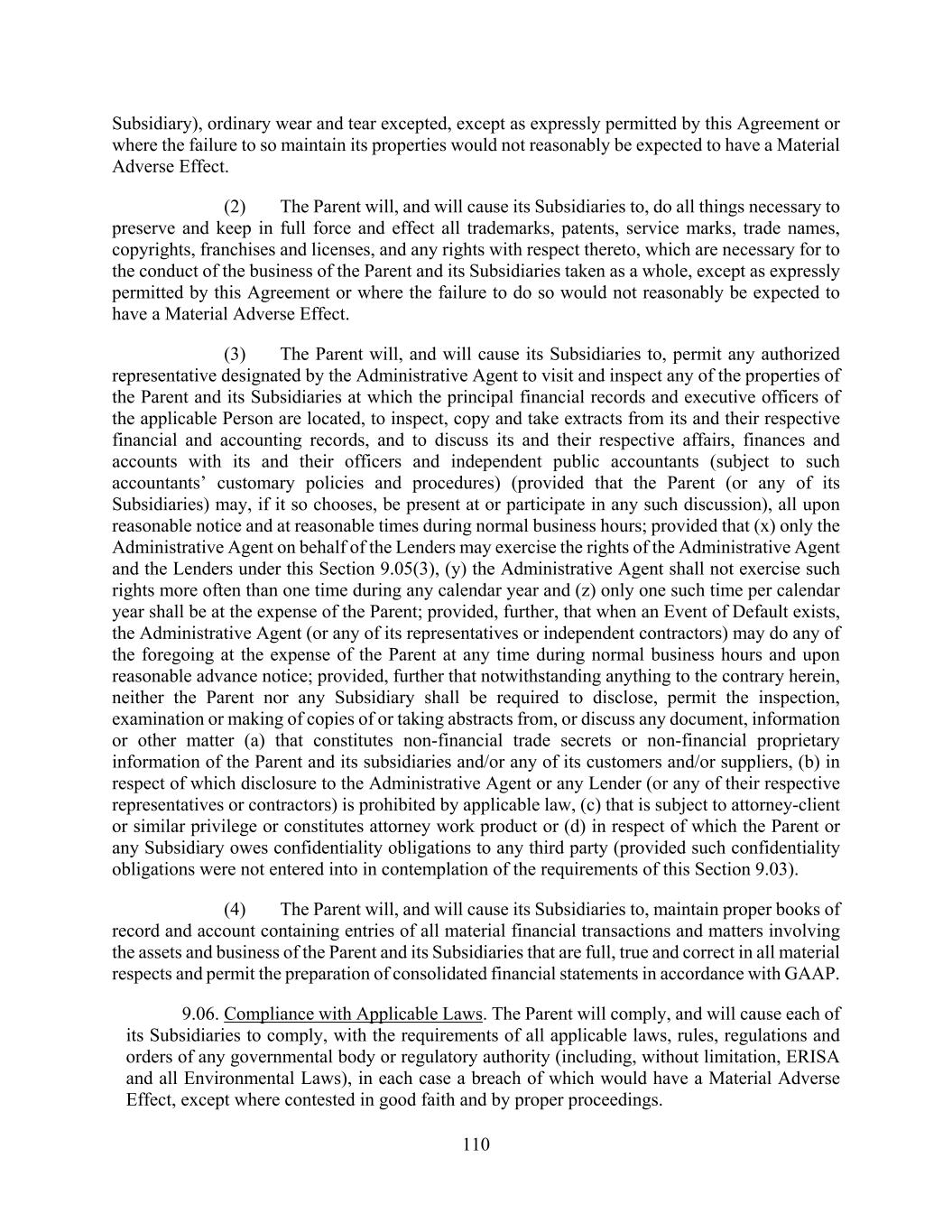 110 Subsidiary), ordinary wear and tear excepted, except as expressly permitted by this Agreement or where the failure to so maintain its properties would not reasonably be expected to have a Material Adverse Effect. (2) The Parent will, and will cause its Subsidiaries to, do all things necessary to preserve and keep in full force and effect all trademarks, patents, service marks, trade names, copyrights, franchises and licenses, and any rights with respect thereto, which are necessary for to the conduct of the business of the Parent and its Subsidiaries taken as a whole, except as expressly permitted by this Agreement or where the failure to do so would not reasonably be expected to have a Material Adverse Effect. (3) The Parent will, and will cause its Subsidiaries to, permit any authorized representative designated by the Administrative Agent to visit and inspect any of the properties of the Parent and its Subsidiaries at which the principal financial records and executive officers of the applicable Person are located, to inspect, copy and take extracts from its and their respective financial and accounting records, and to discuss its and their respective affairs, finances and accounts with its and their officers and independent public accountants (subject to such accountants’ customary policies and procedures) (provided that the Parent (or any of its Subsidiaries) may, if it so chooses, be present at or participate in any such discussion), all upon reasonable notice and at reasonable times during normal business hours; provided that (x) only the Administrative Agent on behalf of the Lenders may exercise the rights of the Administrative Agent and the Lenders under this Section 9.05(3), (y) the Administrative Agent shall not exercise such rights more often than one time during any calendar year and (z) only one such time per calendar year shall be at the expense of the Parent; provided, further, that when an Event of Default exists, the Administrative Agent (or any of its representatives or independent contractors) may do any of the foregoing at the expense of the Parent at any time during normal business hours and upon reasonable advance notice; provided, further that notwithstanding anything to the contrary herein, neither the Parent nor any Subsidiary shall be required to disclose, permit the inspection, examination or making of copies of or taking abstracts from, or discuss any document, information or other matter (a) that constitutes non-financial trade secrets or non-financial proprietary information of the Parent and its subsidiaries and/or any of its customers and/or suppliers, (b) in respect of which disclosure to the Administrative Agent or any Lender (or any of their respective representatives or contractors) is prohibited by applicable law, (c) that is subject to attorney-client or similar privilege or constitutes attorney work product or (d) in respect of which the Parent or any Subsidiary owes confidentiality obligations to any third party (provided such confidentiality obligations were not entered into in contemplation of the requirements of this Section 9.03). (4) The Parent will, and will cause its Subsidiaries to, maintain proper books of record and account containing entries of all material financial transactions and matters involving the assets and business of the Parent and its Subsidiaries that are full, true and correct in all material respects and permit the preparation of consolidated financial statements in accordance with GAAP. 9.06. Compliance with Applicable Laws. The Parent will comply, and will cause each of its Subsidiaries to comply, with the requirements of all applicable laws, rules, regulations and orders of any governmental body or regulatory authority (including, without limitation, ERISA and all Environmental Laws), in each case a breach of which would have a Material Adverse Effect, except where contested in good faith and by proper proceedings.