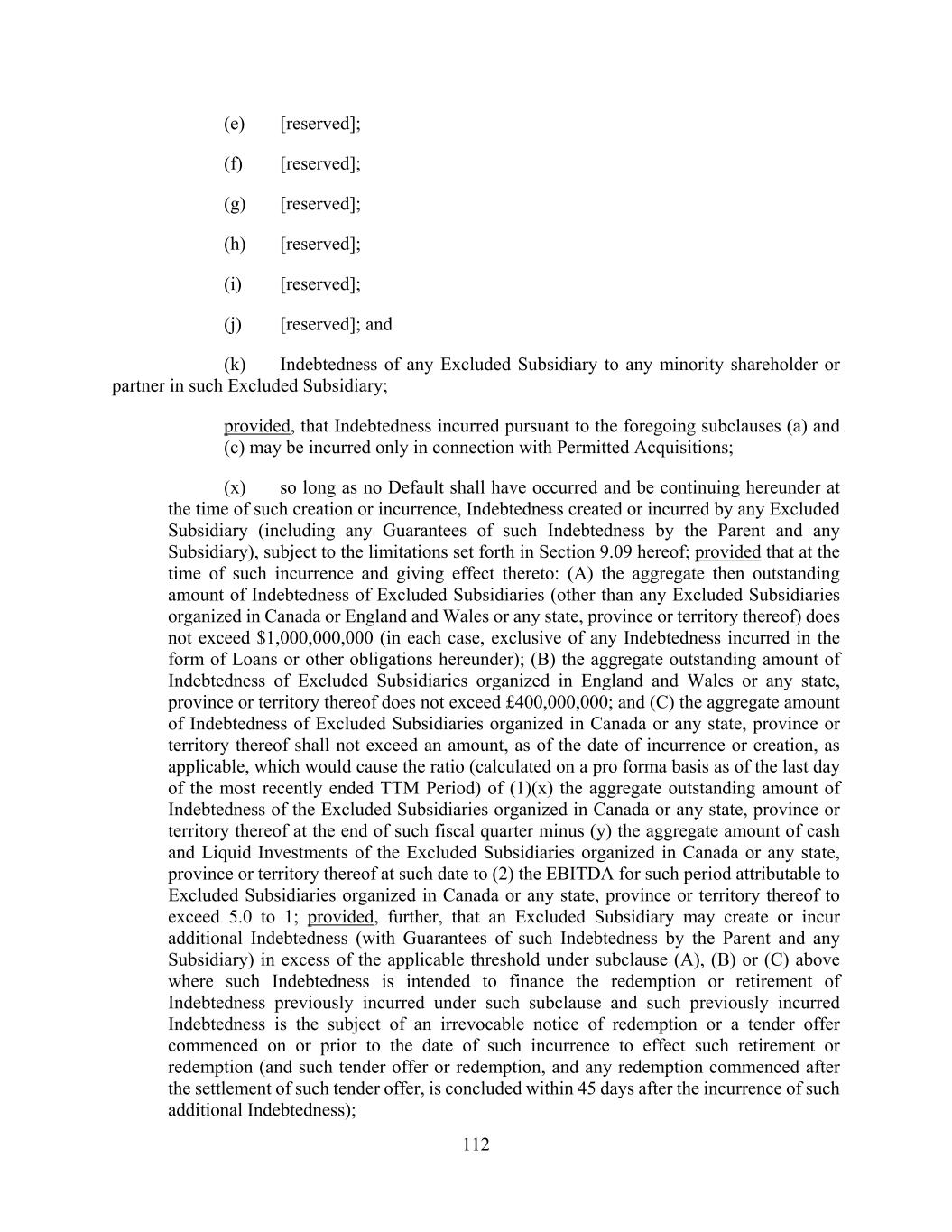 112 (e) [reserved]; (f) [reserved]; (g) [reserved]; (h) [reserved]; (i) [reserved]; (j) [reserved]; and (k) Indebtedness of any Excluded Subsidiary to any minority shareholder or partner in such Excluded Subsidiary; provided, that Indebtedness incurred pursuant to the foregoing subclauses (a) and (c) may be incurred only in connection with Permitted Acquisitions; (x) so long as no Default shall have occurred and be continuing hereunder at the time of such creation or incurrence, Indebtedness created or incurred by any Excluded Subsidiary (including any Guarantees of such Indebtedness by the Parent and any Subsidiary), subject to the limitations set forth in Section 9.09 hereof; provided that at the time of such incurrence and giving effect thereto: (A) the aggregate then outstanding amount of Indebtedness of Excluded Subsidiaries (other than any Excluded Subsidiaries organized in Canada or England and Wales or any state, province or territory thereof) does not exceed $1,000,000,000 (in each case, exclusive of any Indebtedness incurred in the form of Loans or other obligations hereunder); (B) the aggregate outstanding amount of Indebtedness of Excluded Subsidiaries organized in England and Wales or any state, province or territory thereof does not exceed £400,000,000; and (C) the aggregate amount of Indebtedness of Excluded Subsidiaries organized in Canada or any state, province or territory thereof shall not exceed an amount, as of the date of incurrence or creation, as applicable, which would cause the ratio (calculated on a pro forma basis as of the last day of the most recently ended TTM Period) of (1)(x) the aggregate outstanding amount of Indebtedness of the Excluded Subsidiaries organized in Canada or any state, province or territory thereof at the end of such fiscal quarter minus (y) the aggregate amount of cash and Liquid Investments of the Excluded Subsidiaries organized in Canada or any state, province or territory thereof at such date to (2) the EBITDA for such period attributable to Excluded Subsidiaries organized in Canada or any state, province or territory thereof to exceed 5.0 to 1; provided, further, that an Excluded Subsidiary may create or incur additional Indebtedness (with Guarantees of such Indebtedness by the Parent and any Subsidiary) in excess of the applicable threshold under subclause (A), (B) or (C) above where such Indebtedness is intended to finance the redemption or retirement of Indebtedness previously incurred under such subclause and such previously incurred Indebtedness is the subject of an irrevocable notice of redemption or a tender offer commenced on or prior to the date of such incurrence to effect such retirement or redemption (and such tender offer or redemption, and any redemption commenced after the settlement of such tender offer, is concluded within 45 days after the incurrence of such additional Indebtedness);