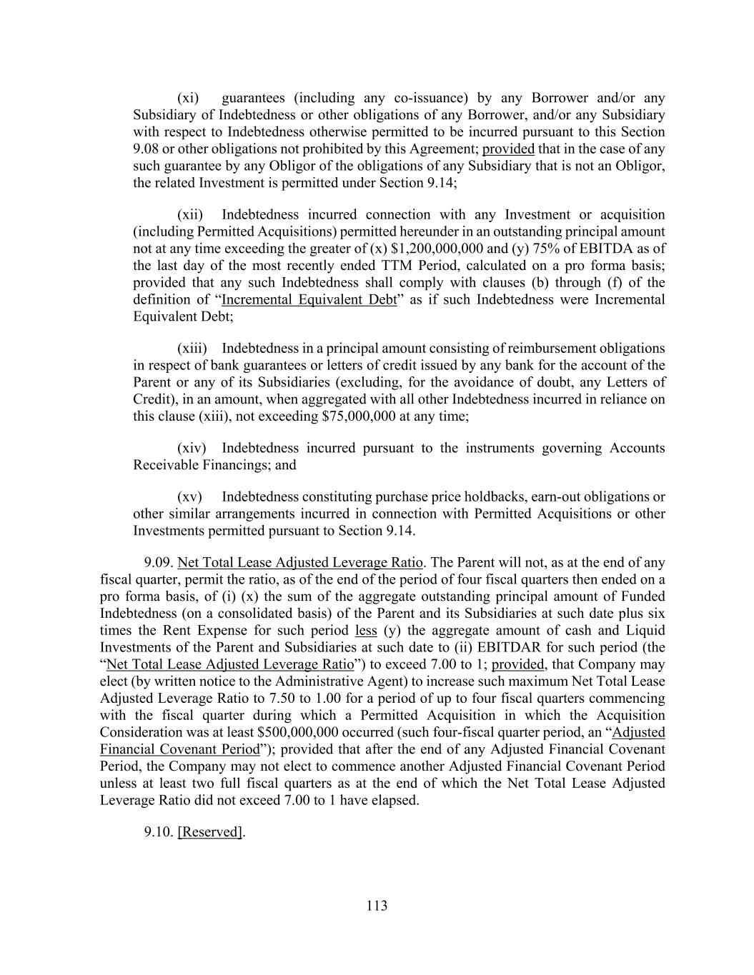 113 (xi) guarantees (including any co-issuance) by any Borrower and/or any Subsidiary of Indebtedness or other obligations of any Borrower, and/or any Subsidiary with respect to Indebtedness otherwise permitted to be incurred pursuant to this Section 9.08 or other obligations not prohibited by this Agreement; provided that in the case of any such guarantee by any Obligor of the obligations of any Subsidiary that is not an Obligor, the related Investment is permitted under Section 9.14; (xii) Indebtedness incurred connection with any Investment or acquisition (including Permitted Acquisitions) permitted hereunder in an outstanding principal amount not at any time exceeding the greater of (x) $1,200,000,000 and (y) 75% of EBITDA as of the last day of the most recently ended TTM Period, calculated on a pro forma basis; provided that any such Indebtedness shall comply with clauses (b) through (f) of the definition of “Incremental Equivalent Debt” as if such Indebtedness were Incremental Equivalent Debt; (xiii) Indebtedness in a principal amount consisting of reimbursement obligations in respect of bank guarantees or letters of credit issued by any bank for the account of the Parent or any of its Subsidiaries (excluding, for the avoidance of doubt, any Letters of Credit), in an amount, when aggregated with all other Indebtedness incurred in reliance on this clause (xiii), not exceeding $75,000,000 at any time; (xiv) Indebtedness incurred pursuant to the instruments governing Accounts Receivable Financings; and (xv) Indebtedness constituting purchase price holdbacks, earn-out obligations or other similar arrangements incurred in connection with Permitted Acquisitions or other Investments permitted pursuant to Section 9.14. 9.09. Net Total Lease Adjusted Leverage Ratio. The Parent will not, as at the end of any fiscal quarter, permit the ratio, as of the end of the period of four fiscal quarters then ended on a pro forma basis, of (i) (x) the sum of the aggregate outstanding principal amount of Funded Indebtedness (on a consolidated basis) of the Parent and its Subsidiaries at such date plus six times the Rent Expense for such period less (y) the aggregate amount of cash and Liquid Investments of the Parent and Subsidiaries at such date to (ii) EBITDAR for such period (the “Net Total Lease Adjusted Leverage Ratio”) to exceed 7.00 to 1; provided, that Company may elect (by written notice to the Administrative Agent) to increase such maximum Net Total Lease Adjusted Leverage Ratio to 7.50 to 1.00 for a period of up to four fiscal quarters commencing with the fiscal quarter during which a Permitted Acquisition in which the Acquisition Consideration was at least $500,000,000 occurred (such four-fiscal quarter period, an “Adjusted Financial Covenant Period”); provided that after the end of any Adjusted Financial Covenant Period, the Company may not elect to commence another Adjusted Financial Covenant Period unless at least two full fiscal quarters as at the end of which the Net Total Lease Adjusted Leverage Ratio did not exceed 7.00 to 1 have elapsed. 9.10. [Reserved].