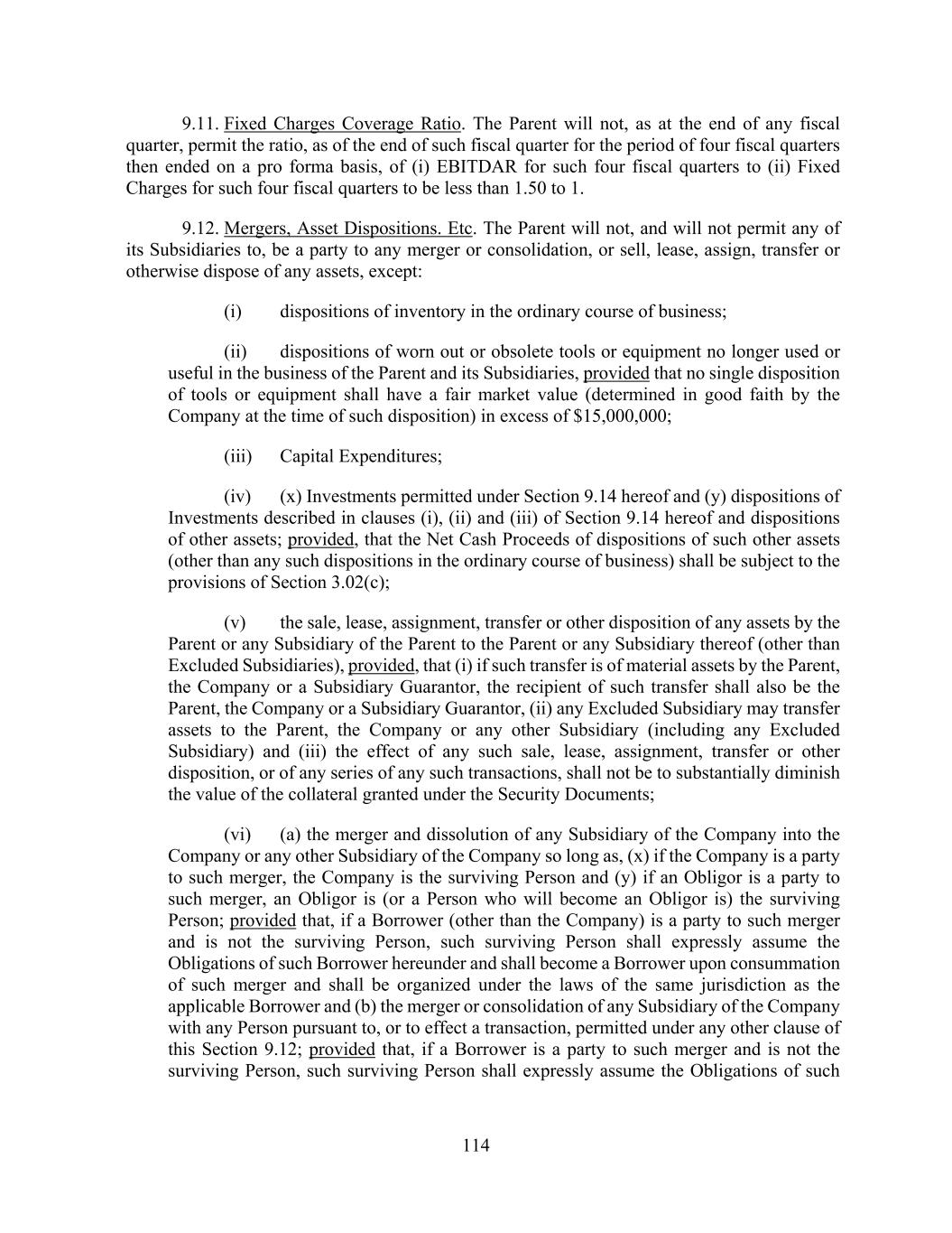 114 9.11. Fixed Charges Coverage Ratio. The Parent will not, as at the end of any fiscal quarter, permit the ratio, as of the end of such fiscal quarter for the period of four fiscal quarters then ended on a pro forma basis, of (i) EBITDAR for such four fiscal quarters to (ii) Fixed Charges for such four fiscal quarters to be less than 1.50 to 1. 9.12. Mergers, Asset Dispositions. Etc. The Parent will not, and will not permit any of its Subsidiaries to, be a party to any merger or consolidation, or sell, lease, assign, transfer or otherwise dispose of any assets, except: (i) dispositions of inventory in the ordinary course of business; (ii) dispositions of worn out or obsolete tools or equipment no longer used or useful in the business of the Parent and its Subsidiaries, provided that no single disposition of tools or equipment shall have a fair market value (determined in good faith by the Company at the time of such disposition) in excess of $15,000,000; (iii) Capital Expenditures; (iv) (x) Investments permitted under Section 9.14 hereof and (y) dispositions of Investments described in clauses (i), (ii) and (iii) of Section 9.14 hereof and dispositions of other assets; provided, that the Net Cash Proceeds of dispositions of such other assets (other than any such dispositions in the ordinary course of business) shall be subject to the provisions of Section 3.02(c); (v) the sale, lease, assignment, transfer or other disposition of any assets by the Parent or any Subsidiary of the Parent to the Parent or any Subsidiary thereof (other than Excluded Subsidiaries), provided, that (i) if such transfer is of material assets by the Parent, the Company or a Subsidiary Guarantor, the recipient of such transfer shall also be the Parent, the Company or a Subsidiary Guarantor, (ii) any Excluded Subsidiary may transfer assets to the Parent, the Company or any other Subsidiary (including any Excluded Subsidiary) and (iii) the effect of any such sale, lease, assignment, transfer or other disposition, or of any series of any such transactions, shall not be to substantially diminish the value of the collateral granted under the Security Documents; (vi) (a) the merger and dissolution of any Subsidiary of the Company into the Company or any other Subsidiary of the Company so long as, (x) if the Company is a party to such merger, the Company is the surviving Person and (y) if an Obligor is a party to such merger, an Obligor is (or a Person who will become an Obligor is) the surviving Person; provided that, if a Borrower (other than the Company) is a party to such merger and is not the surviving Person, such surviving Person shall expressly assume the Obligations of such Borrower hereunder and shall become a Borrower upon consummation of such merger and shall be organized under the laws of the same jurisdiction as the applicable Borrower and (b) the merger or consolidation of any Subsidiary of the Company with any Person pursuant to, or to effect a transaction, permitted under any other clause of this Section 9.12; provided that, if a Borrower is a party to such merger and is not the surviving Person, such surviving Person shall expressly assume the Obligations of such