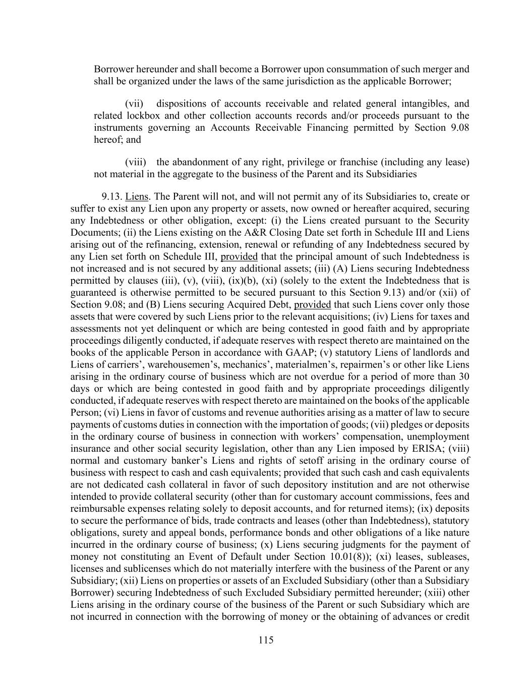 115 Borrower hereunder and shall become a Borrower upon consummation of such merger and shall be organized under the laws of the same jurisdiction as the applicable Borrower; (vii) dispositions of accounts receivable and related general intangibles, and related lockbox and other collection accounts records and/or proceeds pursuant to the instruments governing an Accounts Receivable Financing permitted by Section 9.08 hereof; and (viii) the abandonment of any right, privilege or franchise (including any lease) not material in the aggregate to the business of the Parent and its Subsidiaries 9.13. Liens. The Parent will not, and will not permit any of its Subsidiaries to, create or suffer to exist any Lien upon any property or assets, now owned or hereafter acquired, securing any Indebtedness or other obligation, except: (i) the Liens created pursuant to the Security Documents; (ii) the Liens existing on the A&R Closing Date set forth in Schedule III and Liens arising out of the refinancing, extension, renewal or refunding of any Indebtedness secured by any Lien set forth on Schedule III, provided that the principal amount of such Indebtedness is not increased and is not secured by any additional assets; (iii) (A) Liens securing Indebtedness permitted by clauses (iii), (v), (viii), (ix)(b), (xi) (solely to the extent the Indebtedness that is guaranteed is otherwise permitted to be secured pursuant to this Section 9.13) and/or (xii) of Section 9.08; and (B) Liens securing Acquired Debt, provided that such Liens cover only those assets that were covered by such Liens prior to the relevant acquisitions; (iv) Liens for taxes and assessments not yet delinquent or which are being contested in good faith and by appropriate proceedings diligently conducted, if adequate reserves with respect thereto are maintained on the books of the applicable Person in accordance with GAAP; (v) statutory Liens of landlords and Liens of carriers’, warehousemen’s, mechanics’, materialmen’s, repairmen’s or other like Liens arising in the ordinary course of business which are not overdue for a period of more than 30 days or which are being contested in good faith and by appropriate proceedings diligently conducted, if adequate reserves with respect thereto are maintained on the books of the applicable Person; (vi) Liens in favor of customs and revenue authorities arising as a matter of law to secure payments of customs duties in connection with the importation of goods; (vii) pledges or deposits in the ordinary course of business in connection with workers’ compensation, unemployment insurance and other social security legislation, other than any Lien imposed by ERISA; (viii) normal and customary banker’s Liens and rights of setoff arising in the ordinary course of business with respect to cash and cash equivalents; provided that such cash and cash equivalents are not dedicated cash collateral in favor of such depository institution and are not otherwise intended to provide collateral security (other than for customary account commissions, fees and reimbursable expenses relating solely to deposit accounts, and for returned items); (ix) deposits to secure the performance of bids, trade contracts and leases (other than Indebtedness), statutory obligations, surety and appeal bonds, performance bonds and other obligations of a like nature incurred in the ordinary course of business; (x) Liens securing judgments for the payment of money not constituting an Event of Default under Section 10.01(8)); (xi) leases, subleases, licenses and sublicenses which do not materially interfere with the business of the Parent or any Subsidiary; (xii) Liens on properties or assets of an Excluded Subsidiary (other than a Subsidiary Borrower) securing Indebtedness of such Excluded Subsidiary permitted hereunder; (xiii) other Liens arising in the ordinary course of the business of the Parent or such Subsidiary which are not incurred in connection with the borrowing of money or the obtaining of advances or credit