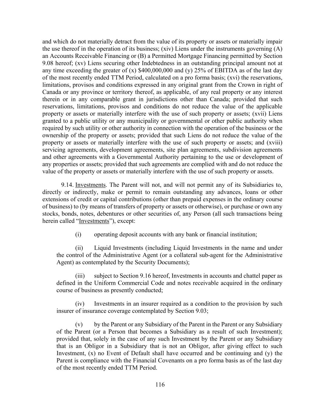 116 and which do not materially detract from the value of its property or assets or materially impair the use thereof in the operation of its business; (xiv) Liens under the instruments governing (A) an Accounts Receivable Financing or (B) a Permitted Mortgage Financing permitted by Section 9.08 hereof; (xv) Liens securing other Indebtedness in an outstanding principal amount not at any time exceeding the greater of (x) $400,000,000 and (y) 25% of EBITDA as of the last day of the most recently ended TTM Period, calculated on a pro forma basis; (xvi) the reservations, limitations, provisos and conditions expressed in any original grant from the Crown in right of Canada or any province or territory thereof, as applicable, of any real property or any interest therein or in any comparable grant in jurisdictions other than Canada; provided that such reservations, limitations, provisos and conditions do not reduce the value of the applicable property or assets or materially interfere with the use of such property or assets; (xvii) Liens granted to a public utility or any municipality or governmental or other public authority when required by such utility or other authority in connection with the operation of the business or the ownership of the property or assets; provided that such Liens do not reduce the value of the property or assets or materially interfere with the use of such property or assets; and (xviii) servicing agreements, development agreements, site plan agreements, subdivision agreements and other agreements with a Governmental Authority pertaining to the use or development of any properties or assets; provided that such agreements are complied with and do not reduce the value of the property or assets or materially interfere with the use of such property or assets. 9.14. Investments. The Parent will not, and will not permit any of its Subsidiaries to, directly or indirectly, make or permit to remain outstanding any advances, loans or other extensions of credit or capital contributions (other than prepaid expenses in the ordinary course of business) to (by means of transfers of property or assets or otherwise), or purchase or own any stocks, bonds, notes, debentures or other securities of, any Person (all such transactions being herein called “Investments”), except: (i) operating deposit accounts with any bank or financial institution; (ii) Liquid Investments (including Liquid Investments in the name and under the control of the Administrative Agent (or a collateral sub-agent for the Administrative Agent) as contemplated by the Security Documents); (iii) subject to Section 9.16 hereof, Investments in accounts and chattel paper as defined in the Uniform Commercial Code and notes receivable acquired in the ordinary course of business as presently conducted; (iv) Investments in an insurer required as a condition to the provision by such insurer of insurance coverage contemplated by Section 9.03; (v) by the Parent or any Subsidiary of the Parent in the Parent or any Subsidiary of the Parent (or a Person that becomes a Subsidiary as a result of such Investment); provided that, solely in the case of any such Investment by the Parent or any Subsidiary that is an Obligor in a Subsidiary that is not an Obligor, after giving effect to such Investment, (x) no Event of Default shall have occurred and be continuing and (y) the Parent is compliance with the Financial Covenants on a pro forma basis as of the last day of the most recently ended TTM Period.
