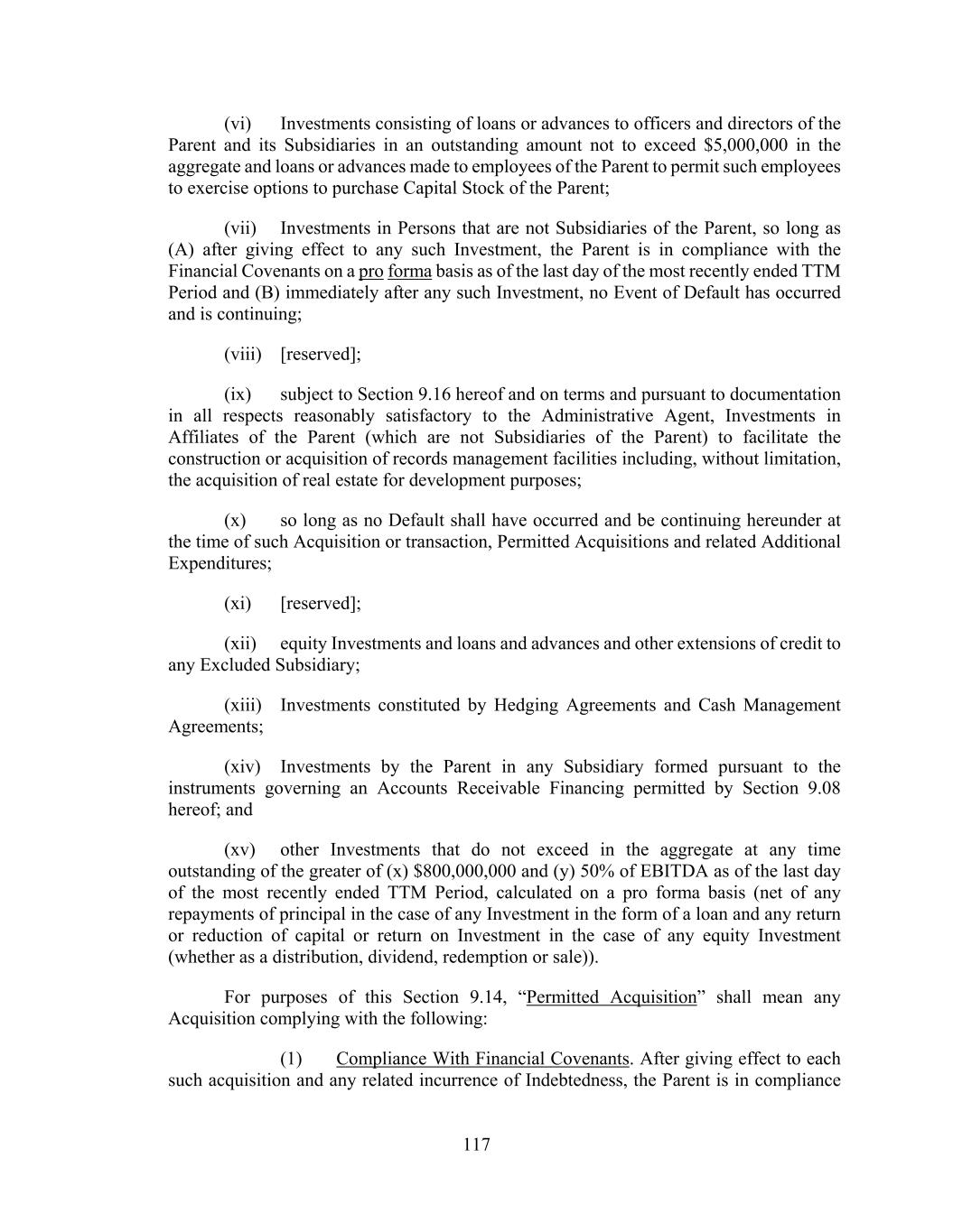 117 (vi) Investments consisting of loans or advances to officers and directors of the Parent and its Subsidiaries in an outstanding amount not to exceed $5,000,000 in the aggregate and loans or advances made to employees of the Parent to permit such employees to exercise options to purchase Capital Stock of the Parent; (vii) Investments in Persons that are not Subsidiaries of the Parent, so long as (A) after giving effect to any such Investment, the Parent is in compliance with the Financial Covenants on a pro forma basis as of the last day of the most recently ended TTM Period and (B) immediately after any such Investment, no Event of Default has occurred and is continuing; (viii) [reserved]; (ix) subject to Section 9.16 hereof and on terms and pursuant to documentation in all respects reasonably satisfactory to the Administrative Agent, Investments in Affiliates of the Parent (which are not Subsidiaries of the Parent) to facilitate the construction or acquisition of records management facilities including, without limitation, the acquisition of real estate for development purposes; (x) so long as no Default shall have occurred and be continuing hereunder at the time of such Acquisition or transaction, Permitted Acquisitions and related Additional Expenditures; (xi) [reserved]; (xii) equity Investments and loans and advances and other extensions of credit to any Excluded Subsidiary; (xiii) Investments constituted by Hedging Agreements and Cash Management Agreements; (xiv) Investments by the Parent in any Subsidiary formed pursuant to the instruments governing an Accounts Receivable Financing permitted by Section 9.08 hereof; and (xv) other Investments that do not exceed in the aggregate at any time outstanding of the greater of (x) $800,000,000 and (y) 50% of EBITDA as of the last day of the most recently ended TTM Period, calculated on a pro forma basis (net of any repayments of principal in the case of any Investment in the form of a loan and any return or reduction of capital or return on Investment in the case of any equity Investment (whether as a distribution, dividend, redemption or sale)). For purposes of this Section 9.14, “Permitted Acquisition” shall mean any Acquisition complying with the following: (1) Compliance With Financial Covenants. After giving effect to each such acquisition and any related incurrence of Indebtedness, the Parent is in compliance
