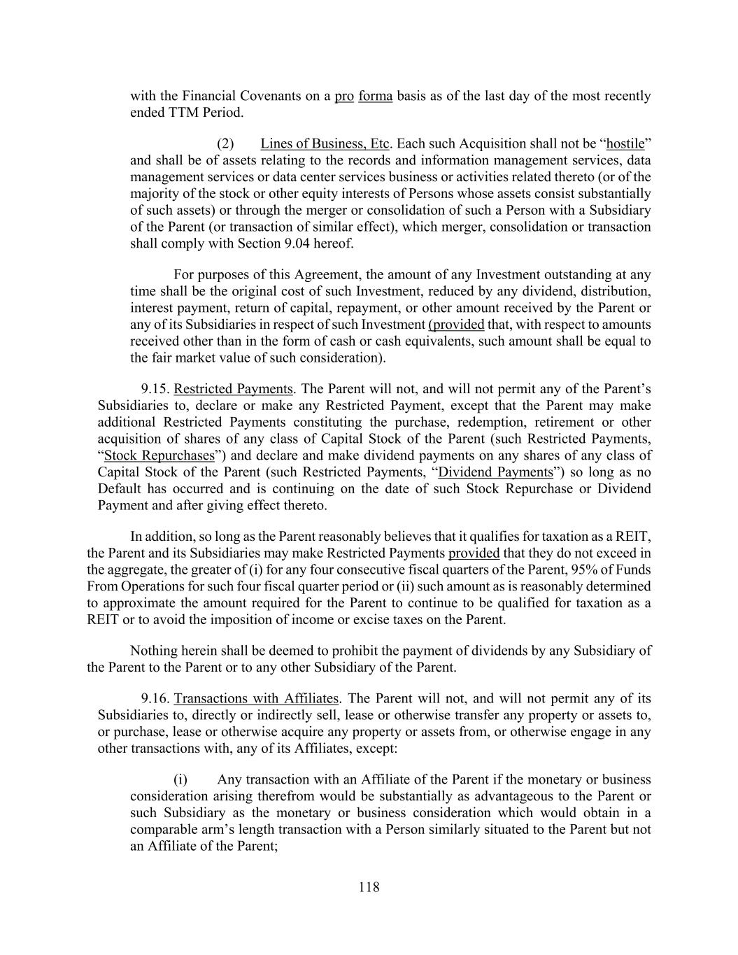 118 with the Financial Covenants on a pro forma basis as of the last day of the most recently ended TTM Period. (2) Lines of Business, Etc. Each such Acquisition shall not be “hostile” and shall be of assets relating to the records and information management services, data management services or data center services business or activities related thereto (or of the majority of the stock or other equity interests of Persons whose assets consist substantially of such assets) or through the merger or consolidation of such a Person with a Subsidiary of the Parent (or transaction of similar effect), which merger, consolidation or transaction shall comply with Section 9.04 hereof. For purposes of this Agreement, the amount of any Investment outstanding at any time shall be the original cost of such Investment, reduced by any dividend, distribution, interest payment, return of capital, repayment, or other amount received by the Parent or any of its Subsidiaries in respect of such Investment (provided that, with respect to amounts received other than in the form of cash or cash equivalents, such amount shall be equal to the fair market value of such consideration). 9.15. Restricted Payments. The Parent will not, and will not permit any of the Parent’s Subsidiaries to, declare or make any Restricted Payment, except that the Parent may make additional Restricted Payments constituting the purchase, redemption, retirement or other acquisition of shares of any class of Capital Stock of the Parent (such Restricted Payments, “Stock Repurchases”) and declare and make dividend payments on any shares of any class of Capital Stock of the Parent (such Restricted Payments, “Dividend Payments”) so long as no Default has occurred and is continuing on the date of such Stock Repurchase or Dividend Payment and after giving effect thereto. In addition, so long as the Parent reasonably believes that it qualifies for taxation as a REIT, the Parent and its Subsidiaries may make Restricted Payments provided that they do not exceed in the aggregate, the greater of (i) for any four consecutive fiscal quarters of the Parent, 95% of Funds From Operations for such four fiscal quarter period or (ii) such amount as is reasonably determined to approximate the amount required for the Parent to continue to be qualified for taxation as a REIT or to avoid the imposition of income or excise taxes on the Parent. Nothing herein shall be deemed to prohibit the payment of dividends by any Subsidiary of the Parent to the Parent or to any other Subsidiary of the Parent. 9.16. Transactions with Affiliates. The Parent will not, and will not permit any of its Subsidiaries to, directly or indirectly sell, lease or otherwise transfer any property or assets to, or purchase, lease or otherwise acquire any property or assets from, or otherwise engage in any other transactions with, any of its Affiliates, except: (i) Any transaction with an Affiliate of the Parent if the monetary or business consideration arising therefrom would be substantially as advantageous to the Parent or such Subsidiary as the monetary or business consideration which would obtain in a comparable arm’s length transaction with a Person similarly situated to the Parent but not an Affiliate of the Parent;
