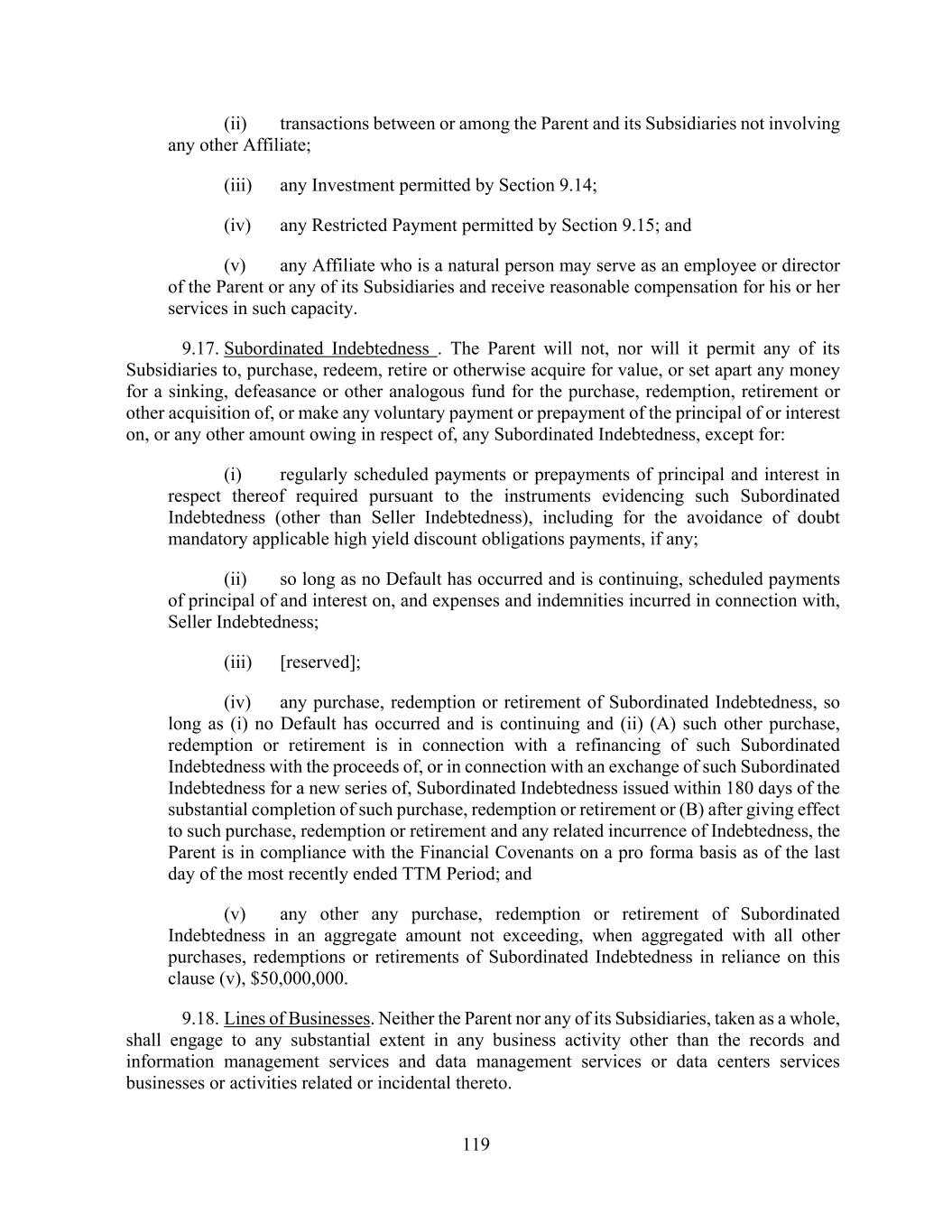 119 (ii) transactions between or among the Parent and its Subsidiaries not involving any other Affiliate; (iii) any Investment permitted by Section 9.14; (iv) any Restricted Payment permitted by Section 9.15; and (v) any Affiliate who is a natural person may serve as an employee or director of the Parent or any of its Subsidiaries and receive reasonable compensation for his or her services in such capacity. 9.17. Subordinated Indebtedness . The Parent will not, nor will it permit any of its Subsidiaries to, purchase, redeem, retire or otherwise acquire for value, or set apart any money for a sinking, defeasance or other analogous fund for the purchase, redemption, retirement or other acquisition of, or make any voluntary payment or prepayment of the principal of or interest on, or any other amount owing in respect of, any Subordinated Indebtedness, except for: (i) regularly scheduled payments or prepayments of principal and interest in respect thereof required pursuant to the instruments evidencing such Subordinated Indebtedness (other than Seller Indebtedness), including for the avoidance of doubt mandatory applicable high yield discount obligations payments, if any; (ii) so long as no Default has occurred and is continuing, scheduled payments of principal of and interest on, and expenses and indemnities incurred in connection with, Seller Indebtedness; (iii) [reserved]; (iv) any purchase, redemption or retirement of Subordinated Indebtedness, so long as (i) no Default has occurred and is continuing and (ii) (A) such other purchase, redemption or retirement is in connection with a refinancing of such Subordinated Indebtedness with the proceeds of, or in connection with an exchange of such Subordinated Indebtedness for a new series of, Subordinated Indebtedness issued within 180 days of the substantial completion of such purchase, redemption or retirement or (B) after giving effect to such purchase, redemption or retirement and any related incurrence of Indebtedness, the Parent is in compliance with the Financial Covenants on a pro forma basis as of the last day of the most recently ended TTM Period; and (v) any other any purchase, redemption or retirement of Subordinated Indebtedness in an aggregate amount not exceeding, when aggregated with all other purchases, redemptions or retirements of Subordinated Indebtedness in reliance on this clause (v), $50,000,000. 9.18. Lines of Businesses. Neither the Parent nor any of its Subsidiaries, taken as a whole, shall engage to any substantial extent in any business activity other than the records and information management services and data management services or data centers services businesses or activities related or incidental thereto.
