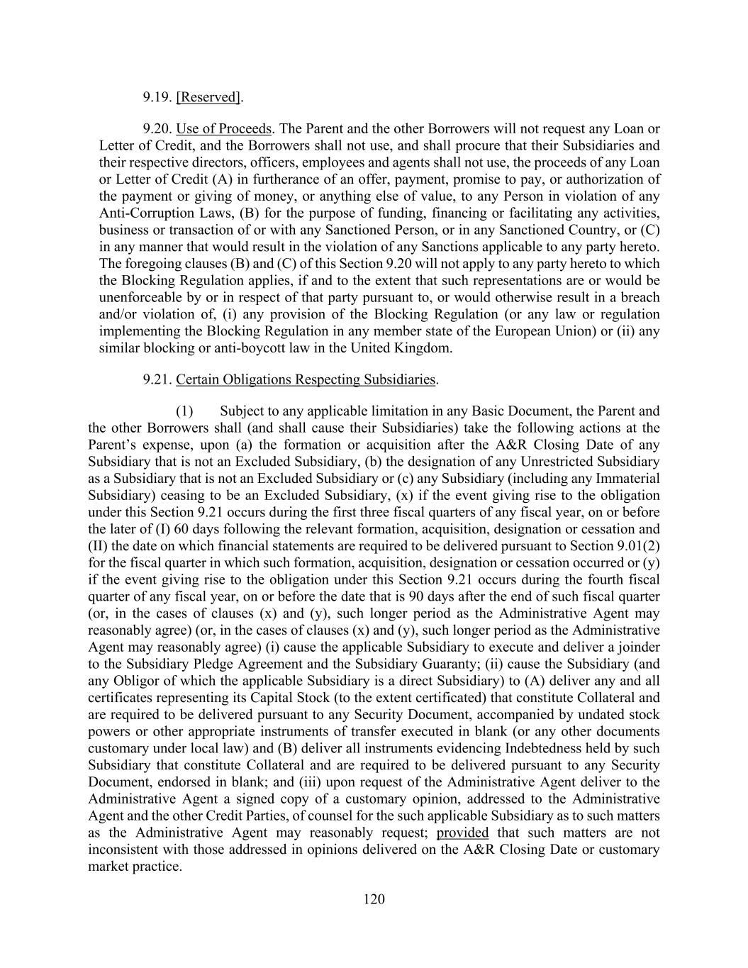 120 9.19. [Reserved]. 9.20. Use of Proceeds. The Parent and the other Borrowers will not request any Loan or Letter of Credit, and the Borrowers shall not use, and shall procure that their Subsidiaries and their respective directors, officers, employees and agents shall not use, the proceeds of any Loan or Letter of Credit (A) in furtherance of an offer, payment, promise to pay, or authorization of the payment or giving of money, or anything else of value, to any Person in violation of any Anti-Corruption Laws, (B) for the purpose of funding, financing or facilitating any activities, business or transaction of or with any Sanctioned Person, or in any Sanctioned Country, or (C) in any manner that would result in the violation of any Sanctions applicable to any party hereto. The foregoing clauses (B) and (C) of this Section 9.20 will not apply to any party hereto to which the Blocking Regulation applies, if and to the extent that such representations are or would be unenforceable by or in respect of that party pursuant to, or would otherwise result in a breach and/or violation of, (i) any provision of the Blocking Regulation (or any law or regulation implementing the Blocking Regulation in any member state of the European Union) or (ii) any similar blocking or anti-boycott law in the United Kingdom. 9.21. Certain Obligations Respecting Subsidiaries. (1) Subject to any applicable limitation in any Basic Document, the Parent and the other Borrowers shall (and shall cause their Subsidiaries) take the following actions at the Parent’s expense, upon (a) the formation or acquisition after the A&R Closing Date of any Subsidiary that is not an Excluded Subsidiary, (b) the designation of any Unrestricted Subsidiary as a Subsidiary that is not an Excluded Subsidiary or (c) any Subsidiary (including any Immaterial Subsidiary) ceasing to be an Excluded Subsidiary, (x) if the event giving rise to the obligation under this Section 9.21 occurs during the first three fiscal quarters of any fiscal year, on or before the later of (I) 60 days following the relevant formation, acquisition, designation or cessation and (II) the date on which financial statements are required to be delivered pursuant to Section 9.01(2) for the fiscal quarter in which such formation, acquisition, designation or cessation occurred or (y) if the event giving rise to the obligation under this Section 9.21 occurs during the fourth fiscal quarter of any fiscal year, on or before the date that is 90 days after the end of such fiscal quarter (or, in the cases of clauses (x) and (y), such longer period as the Administrative Agent may reasonably agree) (or, in the cases of clauses (x) and (y), such longer period as the Administrative Agent may reasonably agree) (i) cause the applicable Subsidiary to execute and deliver a joinder to the Subsidiary Pledge Agreement and the Subsidiary Guaranty; (ii) cause the Subsidiary (and any Obligor of which the applicable Subsidiary is a direct Subsidiary) to (A) deliver any and all certificates representing its Capital Stock (to the extent certificated) that constitute Collateral and are required to be delivered pursuant to any Security Document, accompanied by undated stock powers or other appropriate instruments of transfer executed in blank (or any other documents customary under local law) and (B) deliver all instruments evidencing Indebtedness held by such Subsidiary that constitute Collateral and are required to be delivered pursuant to any Security Document, endorsed in blank; and (iii) upon request of the Administrative Agent deliver to the Administrative Agent a signed copy of a customary opinion, addressed to the Administrative Agent and the other Credit Parties, of counsel for the such applicable Subsidiary as to such matters as the Administrative Agent may reasonably request; provided that such matters are not inconsistent with those addressed in opinions delivered on the A&R Closing Date or customary market practice.