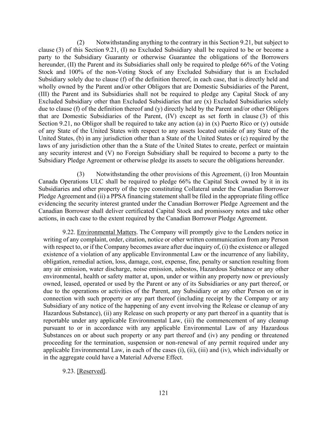 121 (2) Notwithstanding anything to the contrary in this Section 9.21, but subject to clause (3) of this Section 9.21, (I) no Excluded Subsidiary shall be required to be or become a party to the Subsidiary Guaranty or otherwise Guarantee the obligations of the Borrowers hereunder, (II) the Parent and its Subsidiaries shall only be required to pledge 66% of the Voting Stock and 100% of the non-Voting Stock of any Excluded Subsidiary that is an Excluded Subsidiary solely due to clause (f) of the definition thereof, in each case, that is directly held and wholly owned by the Parent and/or other Obligors that are Domestic Subsidiaries of the Parent, (III) the Parent and its Subsidiaries shall not be required to pledge any Capital Stock of any Excluded Subsidiary other than Excluded Subsidiaries that are (x) Excluded Subsidiaries solely due to clause (f) of the definition thereof and (y) directly held by the Parent and/or other Obligors that are Domestic Subsidiaries of the Parent, (IV) except as set forth in clause (3) of this Section 9.21, no Obligor shall be required to take any action (a) in (x) Puerto Rico or (y) outside of any State of the United States with respect to any assets located outside of any State of the United States, (b) in any jurisdiction other than a State of the United States or (c) required by the laws of any jurisdiction other than the a State of the United States to create, perfect or maintain any security interest and (V) no Foreign Subsidiary shall be required to become a party to the Subsidiary Pledge Agreement or otherwise pledge its assets to secure the obligations hereunder. (3) Notwithstanding the other provisions of this Agreement, (i) Iron Mountain Canada Operations ULC shall be required to pledge 66% the Capital Stock owned by it in its Subsidiaries and other property of the type constituting Collateral under the Canadian Borrower Pledge Agreement and (ii) a PPSA financing statement shall be filed in the appropriate filing office evidencing the security interest granted under the Canadian Borrower Pledge Agreement and the Canadian Borrower shall deliver certificated Capital Stock and promissory notes and take other actions, in each case to the extent required by the Canadian Borrower Pledge Agreement. 9.22. Environmental Matters. The Company will promptly give to the Lenders notice in writing of any complaint, order, citation, notice or other written communication from any Person with respect to, or if the Company becomes aware after due inquiry of, (i) the existence or alleged existence of a violation of any applicable Environmental Law or the incurrence of any liability, obligation, remedial action, loss, damage, cost, expense, fine, penalty or sanction resulting from any air emission, water discharge, noise emission, asbestos, Hazardous Substance or any other environmental, health or safety matter at, upon, under or within any property now or previously owned, leased, operated or used by the Parent or any of its Subsidiaries or any part thereof, or due to the operations or activities of the Parent, any Subsidiary or any other Person on or in connection with such property or any part thereof (including receipt by the Company or any Subsidiary of any notice of the happening of any event involving the Release or cleanup of any Hazardous Substance), (ii) any Release on such property or any part thereof in a quantity that is reportable under any applicable Environmental Law, (iii) the commencement of any cleanup pursuant to or in accordance with any applicable Environmental Law of any Hazardous Substances on or about such property or any part thereof and (iv) any pending or threatened proceeding for the termination, suspension or non-renewal of any permit required under any applicable Environmental Law, in each of the cases (i), (ii), (iii) and (iv), which individually or in the aggregate could have a Material Adverse Effect. 9.23. [Reserved].