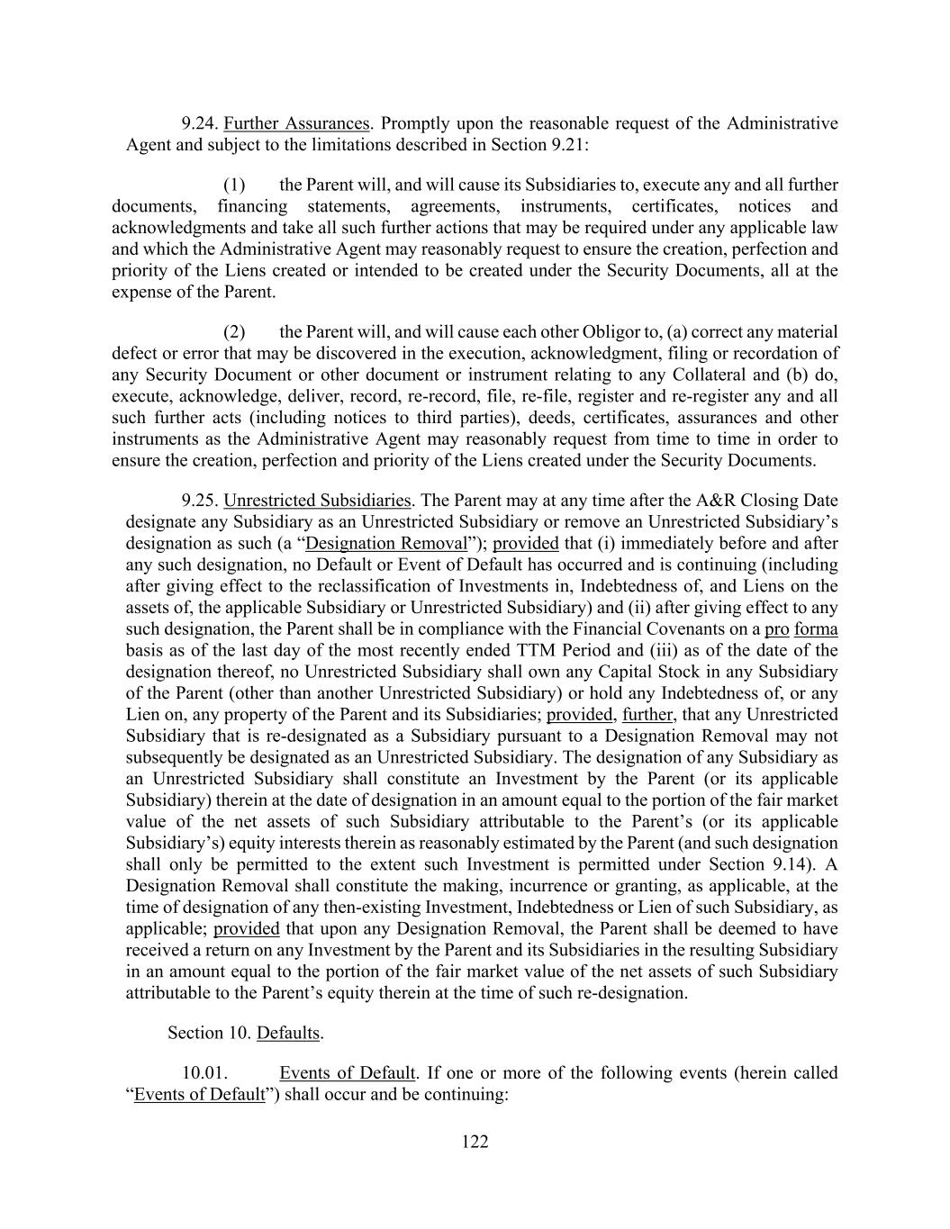 122 9.24. Further Assurances. Promptly upon the reasonable request of the Administrative Agent and subject to the limitations described in Section 9.21: (1) the Parent will, and will cause its Subsidiaries to, execute any and all further documents, financing statements, agreements, instruments, certificates, notices and acknowledgments and take all such further actions that may be required under any applicable law and which the Administrative Agent may reasonably request to ensure the creation, perfection and priority of the Liens created or intended to be created under the Security Documents, all at the expense of the Parent. (2) the Parent will, and will cause each other Obligor to, (a) correct any material defect or error that may be discovered in the execution, acknowledgment, filing or recordation of any Security Document or other document or instrument relating to any Collateral and (b) do, execute, acknowledge, deliver, record, re-record, file, re-file, register and re-register any and all such further acts (including notices to third parties), deeds, certificates, assurances and other instruments as the Administrative Agent may reasonably request from time to time in order to ensure the creation, perfection and priority of the Liens created under the Security Documents. 9.25. Unrestricted Subsidiaries. The Parent may at any time after the A&R Closing Date designate any Subsidiary as an Unrestricted Subsidiary or remove an Unrestricted Subsidiary’s designation as such (a “Designation Removal”); provided that (i) immediately before and after any such designation, no Default or Event of Default has occurred and is continuing (including after giving effect to the reclassification of Investments in, Indebtedness of, and Liens on the assets of, the applicable Subsidiary or Unrestricted Subsidiary) and (ii) after giving effect to any such designation, the Parent shall be in compliance with the Financial Covenants on a pro forma basis as of the last day of the most recently ended TTM Period and (iii) as of the date of the designation thereof, no Unrestricted Subsidiary shall own any Capital Stock in any Subsidiary of the Parent (other than another Unrestricted Subsidiary) or hold any Indebtedness of, or any Lien on, any property of the Parent and its Subsidiaries; provided, further, that any Unrestricted Subsidiary that is re-designated as a Subsidiary pursuant to a Designation Removal may not subsequently be designated as an Unrestricted Subsidiary. The designation of any Subsidiary as an Unrestricted Subsidiary shall constitute an Investment by the Parent (or its applicable Subsidiary) therein at the date of designation in an amount equal to the portion of the fair market value of the net assets of such Subsidiary attributable to the Parent’s (or its applicable Subsidiary’s) equity interests therein as reasonably estimated by the Parent (and such designation shall only be permitted to the extent such Investment is permitted under Section 9.14). A Designation Removal shall constitute the making, incurrence or granting, as applicable, at the time of designation of any then-existing Investment, Indebtedness or Lien of such Subsidiary, as applicable; provided that upon any Designation Removal, the Parent shall be deemed to have received a return on any Investment by the Parent and its Subsidiaries in the resulting Subsidiary in an amount equal to the portion of the fair market value of the net assets of such Subsidiary attributable to the Parent’s equity therein at the time of such re-designation. Section 10. Defaults. 10.01. Events of Default. If one or more of the following events (herein called “Events of Default”) shall occur and be continuing: