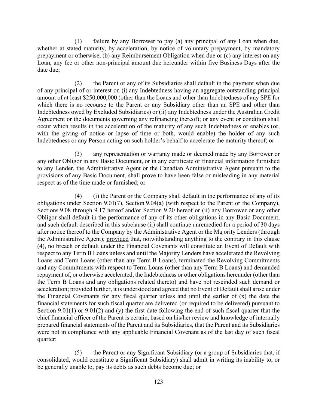 123 (1) failure by any Borrower to pay (a) any principal of any Loan when due, whether at stated maturity, by acceleration, by notice of voluntary prepayment, by mandatory prepayment or otherwise, (b) any Reimbursement Obligation when due or (c) any interest on any Loan, any fee or other non-principal amount due hereunder within five Business Days after the date due; (2) the Parent or any of its Subsidiaries shall default in the payment when due of any principal of or interest on (i) any Indebtedness having an aggregate outstanding principal amount of at least $250,000,000 (other than the Loans and other than Indebtedness of any SPE for which there is no recourse to the Parent or any Subsidiary other than an SPE and other than Indebtedness owed by Excluded Subsidiaries) or (ii) any Indebtedness under the Australian Credit Agreement or the documents governing any refinancing thereof); or any event or condition shall occur which results in the acceleration of the maturity of any such Indebtedness or enables (or, with the giving of notice or lapse of time or both, would enable) the holder of any such Indebtedness or any Person acting on such holder’s behalf to accelerate the maturity thereof; or (3) any representation or warranty made or deemed made by any Borrower or any other Obligor in any Basic Document, or in any certificate or financial information furnished to any Lender, the Administrative Agent or the Canadian Administrative Agent pursuant to the provisions of any Basic Document, shall prove to have been false or misleading in any material respect as of the time made or furnished; or (4) (i) the Parent or the Company shall default in the performance of any of its obligations under Section 9.01(7), Section 9.04(a) (with respect to the Parent or the Company), Sections 9.08 through 9.17 hereof and/or Section 9.20 hereof or (ii) any Borrower or any other Obligor shall default in the performance of any of its other obligations in any Basic Document, and such default described in this subclause (ii) shall continue unremedied for a period of 30 days after notice thereof to the Company by the Administrative Agent or the Majority Lenders (through the Administrative Agent); provided that, notwithstanding anything to the contrary in this clause (4), no breach or default under the Financial Covenants will constitute an Event of Default with respect to any Term B Loans unless and until the Majority Lenders have accelerated the Revolving Loans and Term Loans (other than any Term B Loans), terminated the Revolving Commitments and any Commitments with respect to Term Loans (other than any Term B Loans) and demanded repayment of, or otherwise accelerated, the Indebtedness or other obligations hereunder (other than the Term B Loans and any obligations related thereto) and have not rescinded such demand or acceleration; provided further, it is understood and agreed that no Event of Default shall arise under the Financial Covenants for any fiscal quarter unless and until the earlier of (x) the date the financial statements for such fiscal quarter are delivered (or required to be delivered) pursuant to Section 9.01(1) or 9.01(2) and (y) the first date following the end of such fiscal quarter that the chief financial officer of the Parent is certain, based on his/her review and knowledge of internally prepared financial statements of the Parent and its Subsidiaries, that the Parent and its Subsidiaries were not in compliance with any applicable Financial Covenant as of the last day of such fiscal quarter; (5) the Parent or any Significant Subsidiary (or a group of Subsidiaries that, if consolidated, would constitute a Significant Subsidiary) shall admit in writing its inability to, or be generally unable to, pay its debts as such debts become due; or