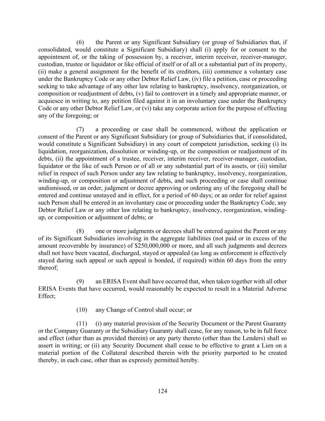 124 (6) the Parent or any Significant Subsidiary (or group of Subsidiaries that, if consolidated, would constitute a Significant Subsidiary) shall (i) apply for or consent to the appointment of, or the taking of possession by, a receiver, interim receiver, receiver-manager, custodian, trustee or liquidator or like official of itself or of all or a substantial part of its property, (ii) make a general assignment for the benefit of its creditors, (iii) commence a voluntary case under the Bankruptcy Code or any other Debtor Relief Law, (iv) file a petition, case or proceeding seeking to take advantage of any other law relating to bankruptcy, insolvency, reorganization, or composition or readjustment of debts, (v) fail to controvert in a timely and appropriate manner, or acquiesce in writing to, any petition filed against it in an involuntary case under the Bankruptcy Code or any other Debtor Relief Law, or (vi) take any corporate action for the purpose of effecting any of the foregoing; or (7) a proceeding or case shall be commenced, without the application or consent of the Parent or any Significant Subsidiary (or group of Subsidiaries that, if consolidated, would constitute a Significant Subsidiary) in any court of competent jurisdiction, seeking (i) its liquidation, reorganization, dissolution or winding-up, or the composition or readjustment of its debts, (ii) the appointment of a trustee, receiver, interim receiver, receiver-manager, custodian, liquidator or the like of such Person or of all or any substantial part of its assets, or (iii) similar relief in respect of such Person under any law relating to bankruptcy, insolvency, reorganization, winding-up, or composition or adjustment of debts, and such proceeding or case shall continue undismissed, or an order, judgment or decree approving or ordering any of the foregoing shall be entered and continue unstayed and in effect, for a period of 60 days; or an order for relief against such Person shall be entered in an involuntary case or proceeding under the Bankruptcy Code, any Debtor Relief Law or any other law relating to bankruptcy, insolvency, reorganization, winding- up, or composition or adjustment of debts; or (8) one or more judgments or decrees shall be entered against the Parent or any of its Significant Subsidiaries involving in the aggregate liabilities (not paid or in excess of the amount recoverable by insurance) of $250,000,000 or more, and all such judgments and decrees shall not have been vacated, discharged, stayed or appealed (as long as enforcement is effectively stayed during such appeal or such appeal is bonded, if required) within 60 days from the entry thereof; (9) an ERISA Event shall have occurred that, when taken together with all other ERISA Events that have occurred, would reasonably be expected to result in a Material Adverse Effect; (10) any Change of Control shall occur; or (11) (i) any material provision of the Security Document or the Parent Guaranty or the Company Guaranty or the Subsidiary Guaranty shall cease, for any reason, to be in full force and effect (other than as provided therein) or any party thereto (other than the Lenders) shall so assert in writing; or (ii) any Security Document shall cease to be effective to grant a Lien on a material portion of the Collateral described therein with the priority purported to be created thereby, in each case, other than as expressly permitted hereby.