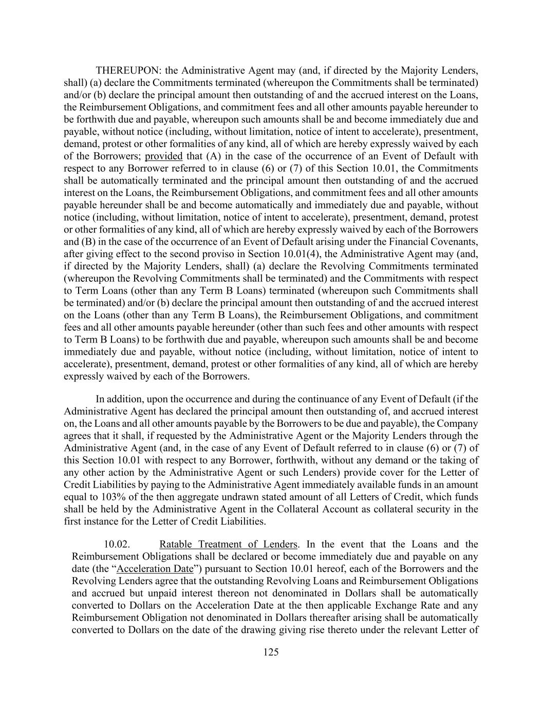 125 THEREUPON: the Administrative Agent may (and, if directed by the Majority Lenders, shall) (a) declare the Commitments terminated (whereupon the Commitments shall be terminated) and/or (b) declare the principal amount then outstanding of and the accrued interest on the Loans, the Reimbursement Obligations, and commitment fees and all other amounts payable hereunder to be forthwith due and payable, whereupon such amounts shall be and become immediately due and payable, without notice (including, without limitation, notice of intent to accelerate), presentment, demand, protest or other formalities of any kind, all of which are hereby expressly waived by each of the Borrowers; provided that (A) in the case of the occurrence of an Event of Default with respect to any Borrower referred to in clause (6) or (7) of this Section 10.01, the Commitments shall be automatically terminated and the principal amount then outstanding of and the accrued interest on the Loans, the Reimbursement Obligations, and commitment fees and all other amounts payable hereunder shall be and become automatically and immediately due and payable, without notice (including, without limitation, notice of intent to accelerate), presentment, demand, protest or other formalities of any kind, all of which are hereby expressly waived by each of the Borrowers and (B) in the case of the occurrence of an Event of Default arising under the Financial Covenants, after giving effect to the second proviso in Section 10.01(4), the Administrative Agent may (and, if directed by the Majority Lenders, shall) (a) declare the Revolving Commitments terminated (whereupon the Revolving Commitments shall be terminated) and the Commitments with respect to Term Loans (other than any Term B Loans) terminated (whereupon such Commitments shall be terminated) and/or (b) declare the principal amount then outstanding of and the accrued interest on the Loans (other than any Term B Loans), the Reimbursement Obligations, and commitment fees and all other amounts payable hereunder (other than such fees and other amounts with respect to Term B Loans) to be forthwith due and payable, whereupon such amounts shall be and become immediately due and payable, without notice (including, without limitation, notice of intent to accelerate), presentment, demand, protest or other formalities of any kind, all of which are hereby expressly waived by each of the Borrowers. In addition, upon the occurrence and during the continuance of any Event of Default (if the Administrative Agent has declared the principal amount then outstanding of, and accrued interest on, the Loans and all other amounts payable by the Borrowers to be due and payable), the Company agrees that it shall, if requested by the Administrative Agent or the Majority Lenders through the Administrative Agent (and, in the case of any Event of Default referred to in clause (6) or (7) of this Section 10.01 with respect to any Borrower, forthwith, without any demand or the taking of any other action by the Administrative Agent or such Lenders) provide cover for the Letter of Credit Liabilities by paying to the Administrative Agent immediately available funds in an amount equal to 103% of the then aggregate undrawn stated amount of all Letters of Credit, which funds shall be held by the Administrative Agent in the Collateral Account as collateral security in the first instance for the Letter of Credit Liabilities. 10.02. Ratable Treatment of Lenders. In the event that the Loans and the Reimbursement Obligations shall be declared or become immediately due and payable on any date (the “Acceleration Date”) pursuant to Section 10.01 hereof, each of the Borrowers and the Revolving Lenders agree that the outstanding Revolving Loans and Reimbursement Obligations and accrued but unpaid interest thereon not denominated in Dollars shall be automatically converted to Dollars on the Acceleration Date at the then applicable Exchange Rate and any Reimbursement Obligation not denominated in Dollars thereafter arising shall be automatically converted to Dollars on the date of the drawing giving rise thereto under the relevant Letter of