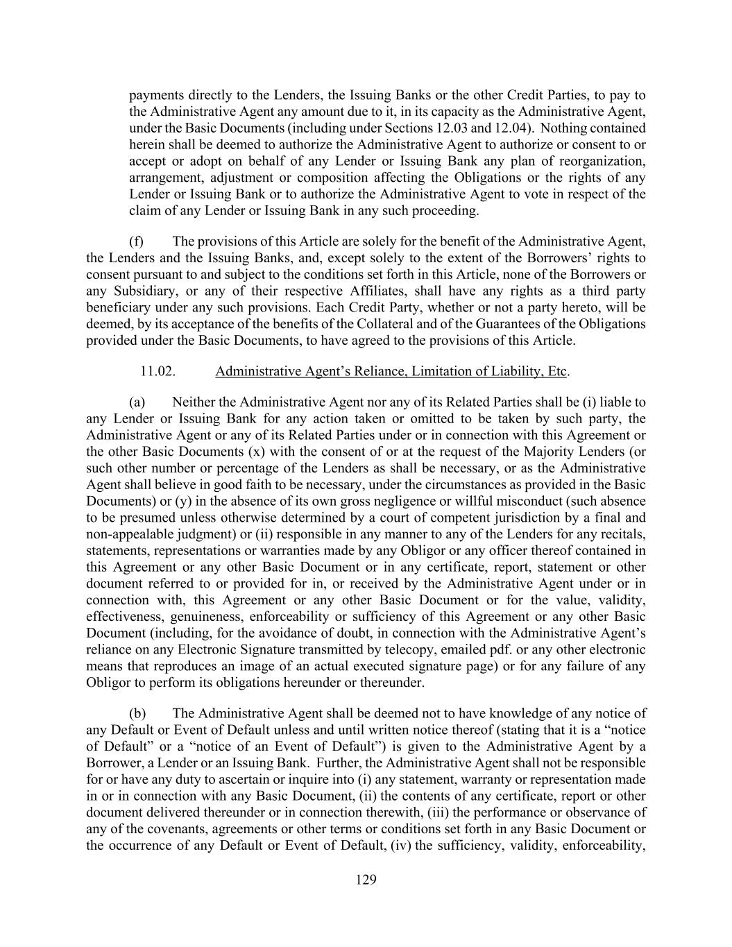 129 payments directly to the Lenders, the Issuing Banks or the other Credit Parties, to pay to the Administrative Agent any amount due to it, in its capacity as the Administrative Agent, under the Basic Documents (including under Sections 12.03 and 12.04). Nothing contained herein shall be deemed to authorize the Administrative Agent to authorize or consent to or accept or adopt on behalf of any Lender or Issuing Bank any plan of reorganization, arrangement, adjustment or composition affecting the Obligations or the rights of any Lender or Issuing Bank or to authorize the Administrative Agent to vote in respect of the claim of any Lender or Issuing Bank in any such proceeding. (f) The provisions of this Article are solely for the benefit of the Administrative Agent, the Lenders and the Issuing Banks, and, except solely to the extent of the Borrowers’ rights to consent pursuant to and subject to the conditions set forth in this Article, none of the Borrowers or any Subsidiary, or any of their respective Affiliates, shall have any rights as a third party beneficiary under any such provisions. Each Credit Party, whether or not a party hereto, will be deemed, by its acceptance of the benefits of the Collateral and of the Guarantees of the Obligations provided under the Basic Documents, to have agreed to the provisions of this Article. 11.02. Administrative Agent’s Reliance, Limitation of Liability, Etc. (a) Neither the Administrative Agent nor any of its Related Parties shall be (i) liable to any Lender or Issuing Bank for any action taken or omitted to be taken by such party, the Administrative Agent or any of its Related Parties under or in connection with this Agreement or the other Basic Documents (x) with the consent of or at the request of the Majority Lenders (or such other number or percentage of the Lenders as shall be necessary, or as the Administrative Agent shall believe in good faith to be necessary, under the circumstances as provided in the Basic Documents) or (y) in the absence of its own gross negligence or willful misconduct (such absence to be presumed unless otherwise determined by a court of competent jurisdiction by a final and non-appealable judgment) or (ii) responsible in any manner to any of the Lenders for any recitals, statements, representations or warranties made by any Obligor or any officer thereof contained in this Agreement or any other Basic Document or in any certificate, report, statement or other document referred to or provided for in, or received by the Administrative Agent under or in connection with, this Agreement or any other Basic Document or for the value, validity, effectiveness, genuineness, enforceability or sufficiency of this Agreement or any other Basic Document (including, for the avoidance of doubt, in connection with the Administrative Agent’s reliance on any Electronic Signature transmitted by telecopy, emailed pdf. or any other electronic means that reproduces an image of an actual executed signature page) or for any failure of any Obligor to perform its obligations hereunder or thereunder. (b) The Administrative Agent shall be deemed not to have knowledge of any notice of any Default or Event of Default unless and until written notice thereof (stating that it is a “notice of Default” or a “notice of an Event of Default”) is given to the Administrative Agent by a Borrower, a Lender or an Issuing Bank. Further, the Administrative Agent shall not be responsible for or have any duty to ascertain or inquire into (i) any statement, warranty or representation made in or in connection with any Basic Document, (ii) the contents of any certificate, report or other document delivered thereunder or in connection therewith, (iii) the performance or observance of any of the covenants, agreements or other terms or conditions set forth in any Basic Document or the occurrence of any Default or Event of Default, (iv) the sufficiency, validity, enforceability,