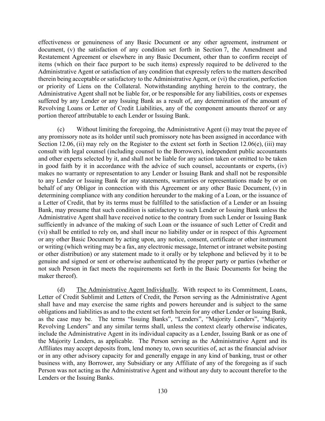 130 effectiveness or genuineness of any Basic Document or any other agreement, instrument or document, (v) the satisfaction of any condition set forth in Section 7, the Amendment and Restatement Agreement or elsewhere in any Basic Document, other than to confirm receipt of items (which on their face purport to be such items) expressly required to be delivered to the Administrative Agent or satisfaction of any condition that expressly refers to the matters described therein being acceptable or satisfactory to the Administrative Agent, or (vi) the creation, perfection or priority of Liens on the Collateral. Notwithstanding anything herein to the contrary, the Administrative Agent shall not be liable for, or be responsible for any liabilities, costs or expenses suffered by any Lender or any Issuing Bank as a result of, any determination of the amount of Revolving Loans or Letter of Credit Liabilities, any of the component amounts thereof or any portion thereof attributable to each Lender or Issuing Bank. (c) Without limiting the foregoing, the Administrative Agent (i) may treat the payee of any promissory note as its holder until such promissory note has been assigned in accordance with Section 12.06, (ii) may rely on the Register to the extent set forth in Section 12.06(e), (iii) may consult with legal counsel (including counsel to the Borrowers), independent public accountants and other experts selected by it, and shall not be liable for any action taken or omitted to be taken in good faith by it in accordance with the advice of such counsel, accountants or experts, (iv) makes no warranty or representation to any Lender or Issuing Bank and shall not be responsible to any Lender or Issuing Bank for any statements, warranties or representations made by or on behalf of any Obligor in connection with this Agreement or any other Basic Document, (v) in determining compliance with any condition hereunder to the making of a Loan, or the issuance of a Letter of Credit, that by its terms must be fulfilled to the satisfaction of a Lender or an Issuing Bank, may presume that such condition is satisfactory to such Lender or Issuing Bank unless the Administrative Agent shall have received notice to the contrary from such Lender or Issuing Bank sufficiently in advance of the making of such Loan or the issuance of such Letter of Credit and (vi) shall be entitled to rely on, and shall incur no liability under or in respect of this Agreement or any other Basic Document by acting upon, any notice, consent, certificate or other instrument or writing (which writing may be a fax, any electronic message, Internet or intranet website posting or other distribution) or any statement made to it orally or by telephone and believed by it to be genuine and signed or sent or otherwise authenticated by the proper party or parties (whether or not such Person in fact meets the requirements set forth in the Basic Documents for being the maker thereof). (d) The Administrative Agent Individually. With respect to its Commitment, Loans, Letter of Credit Sublimit and Letters of Credit, the Person serving as the Administrative Agent shall have and may exercise the same rights and powers hereunder and is subject to the same obligations and liabilities as and to the extent set forth herein for any other Lender or Issuing Bank, as the case may be. The terms “Issuing Banks”, “Lenders”, “Majority Lenders”, “Majority Revolving Lenders” and any similar terms shall, unless the context clearly otherwise indicates, include the Administrative Agent in its individual capacity as a Lender, Issuing Bank or as one of the Majority Lenders, as applicable. The Person serving as the Administrative Agent and its Affiliates may accept deposits from, lend money to, own securities of, act as the financial advisor or in any other advisory capacity for and generally engage in any kind of banking, trust or other business with, any Borrower, any Subsidiary or any Affiliate of any of the foregoing as if such Person was not acting as the Administrative Agent and without any duty to account therefor to the Lenders or the Issuing Banks.
