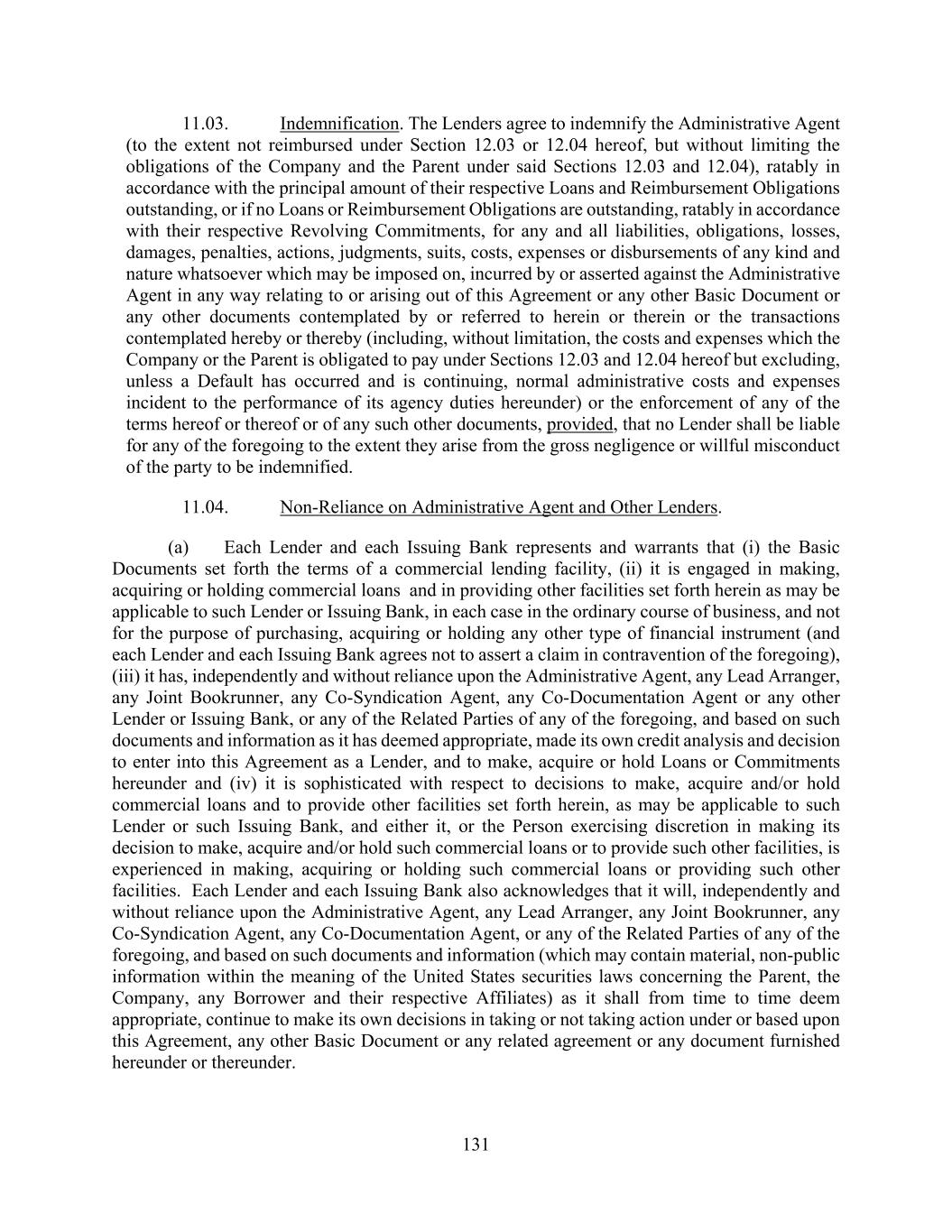131 11.03. Indemnification. The Lenders agree to indemnify the Administrative Agent (to the extent not reimbursed under Section 12.03 or 12.04 hereof, but without limiting the obligations of the Company and the Parent under said Sections 12.03 and 12.04), ratably in accordance with the principal amount of their respective Loans and Reimbursement Obligations outstanding, or if no Loans or Reimbursement Obligations are outstanding, ratably in accordance with their respective Revolving Commitments, for any and all liabilities, obligations, losses, damages, penalties, actions, judgments, suits, costs, expenses or disbursements of any kind and nature whatsoever which may be imposed on, incurred by or asserted against the Administrative Agent in any way relating to or arising out of this Agreement or any other Basic Document or any other documents contemplated by or referred to herein or therein or the transactions contemplated hereby or thereby (including, without limitation, the costs and expenses which the Company or the Parent is obligated to pay under Sections 12.03 and 12.04 hereof but excluding, unless a Default has occurred and is continuing, normal administrative costs and expenses incident to the performance of its agency duties hereunder) or the enforcement of any of the terms hereof or thereof or of any such other documents, provided, that no Lender shall be liable for any of the foregoing to the extent they arise from the gross negligence or willful misconduct of the party to be indemnified. 11.04. Non-Reliance on Administrative Agent and Other Lenders. (a) Each Lender and each Issuing Bank represents and warrants that (i) the Basic Documents set forth the terms of a commercial lending facility, (ii) it is engaged in making, acquiring or holding commercial loans and in providing other facilities set forth herein as may be applicable to such Lender or Issuing Bank, in each case in the ordinary course of business, and not for the purpose of purchasing, acquiring or holding any other type of financial instrument (and each Lender and each Issuing Bank agrees not to assert a claim in contravention of the foregoing), (iii) it has, independently and without reliance upon the Administrative Agent, any Lead Arranger, any Joint Bookrunner, any Co-Syndication Agent, any Co-Documentation Agent or any other Lender or Issuing Bank, or any of the Related Parties of any of the foregoing, and based on such documents and information as it has deemed appropriate, made its own credit analysis and decision to enter into this Agreement as a Lender, and to make, acquire or hold Loans or Commitments hereunder and (iv) it is sophisticated with respect to decisions to make, acquire and/or hold commercial loans and to provide other facilities set forth herein, as may be applicable to such Lender or such Issuing Bank, and either it, or the Person exercising discretion in making its decision to make, acquire and/or hold such commercial loans or to provide such other facilities, is experienced in making, acquiring or holding such commercial loans or providing such other facilities. Each Lender and each Issuing Bank also acknowledges that it will, independently and without reliance upon the Administrative Agent, any Lead Arranger, any Joint Bookrunner, any Co-Syndication Agent, any Co-Documentation Agent, or any of the Related Parties of any of the foregoing, and based on such documents and information (which may contain material, non-public information within the meaning of the United States securities laws concerning the Parent, the Company, any Borrower and their respective Affiliates) as it shall from time to time deem appropriate, continue to make its own decisions in taking or not taking action under or based upon this Agreement, any other Basic Document or any related agreement or any document furnished hereunder or thereunder.