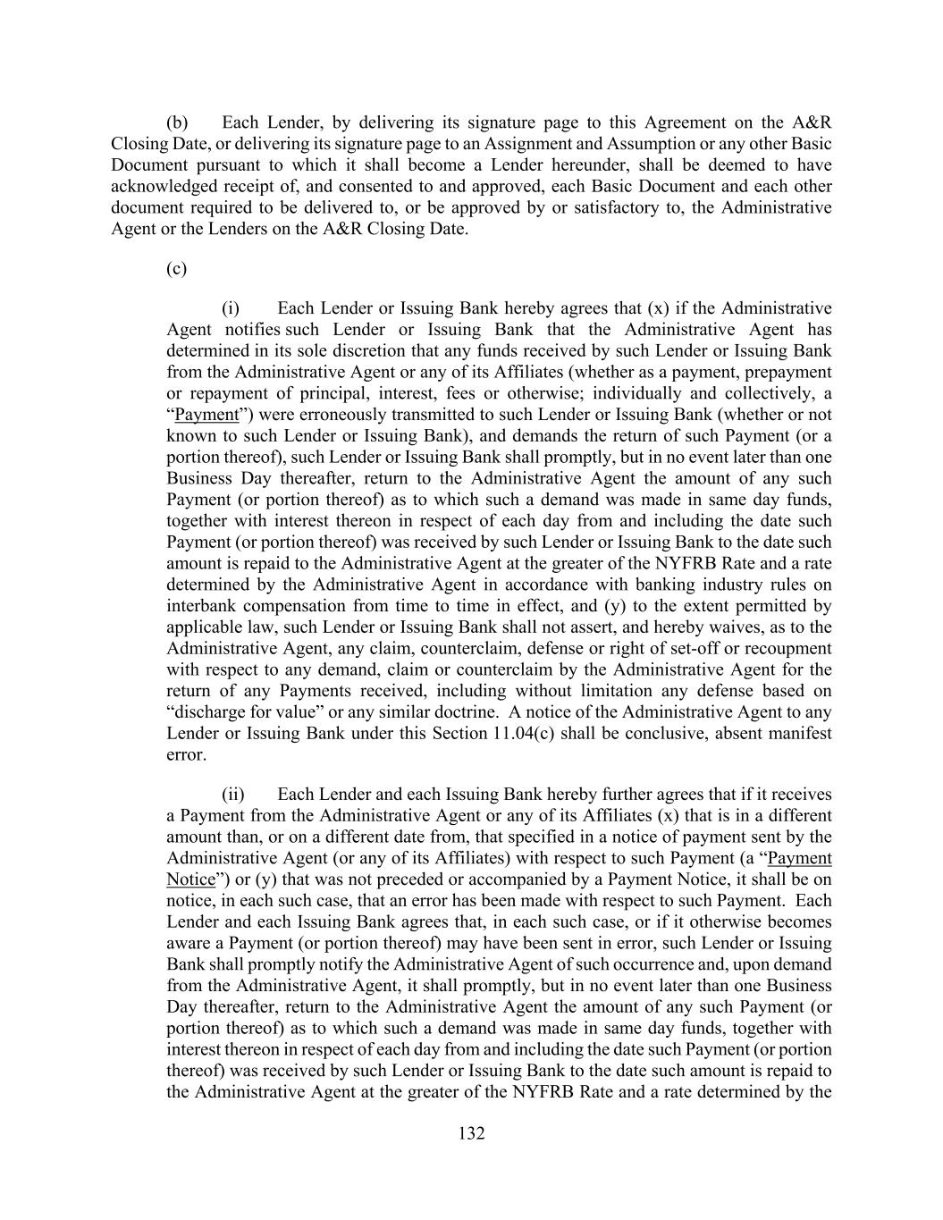 132 (b) Each Lender, by delivering its signature page to this Agreement on the A&R Closing Date, or delivering its signature page to an Assignment and Assumption or any other Basic Document pursuant to which it shall become a Lender hereunder, shall be deemed to have acknowledged receipt of, and consented to and approved, each Basic Document and each other document required to be delivered to, or be approved by or satisfactory to, the Administrative Agent or the Lenders on the A&R Closing Date. (c) (i) Each Lender or Issuing Bank hereby agrees that (x) if the Administrative Agent notifies such Lender or Issuing Bank that the Administrative Agent has determined in its sole discretion that any funds received by such Lender or Issuing Bank from the Administrative Agent or any of its Affiliates (whether as a payment, prepayment or repayment of principal, interest, fees or otherwise; individually and collectively, a “Payment”) were erroneously transmitted to such Lender or Issuing Bank (whether or not known to such Lender or Issuing Bank), and demands the return of such Payment (or a portion thereof), such Lender or Issuing Bank shall promptly, but in no event later than one Business Day thereafter, return to the Administrative Agent the amount of any such Payment (or portion thereof) as to which such a demand was made in same day funds, together with interest thereon in respect of each day from and including the date such Payment (or portion thereof) was received by such Lender or Issuing Bank to the date such amount is repaid to the Administrative Agent at the greater of the NYFRB Rate and a rate determined by the Administrative Agent in accordance with banking industry rules on interbank compensation from time to time in effect, and (y) to the extent permitted by applicable law, such Lender or Issuing Bank shall not assert, and hereby waives, as to the Administrative Agent, any claim, counterclaim, defense or right of set-off or recoupment with respect to any demand, claim or counterclaim by the Administrative Agent for the return of any Payments received, including without limitation any defense based on “discharge for value” or any similar doctrine. A notice of the Administrative Agent to any Lender or Issuing Bank under this Section 11.04(c) shall be conclusive, absent manifest error. (ii) Each Lender and each Issuing Bank hereby further agrees that if it receives a Payment from the Administrative Agent or any of its Affiliates (x) that is in a different amount than, or on a different date from, that specified in a notice of payment sent by the Administrative Agent (or any of its Affiliates) with respect to such Payment (a “Payment Notice”) or (y) that was not preceded or accompanied by a Payment Notice, it shall be on notice, in each such case, that an error has been made with respect to such Payment. Each Lender and each Issuing Bank agrees that, in each such case, or if it otherwise becomes aware a Payment (or portion thereof) may have been sent in error, such Lender or Issuing Bank shall promptly notify the Administrative Agent of such occurrence and, upon demand from the Administrative Agent, it shall promptly, but in no event later than one Business Day thereafter, return to the Administrative Agent the amount of any such Payment (or portion thereof) as to which such a demand was made in same day funds, together with interest thereon in respect of each day from and including the date such Payment (or portion thereof) was received by such Lender or Issuing Bank to the date such amount is repaid to the Administrative Agent at the greater of the NYFRB Rate and a rate determined by the