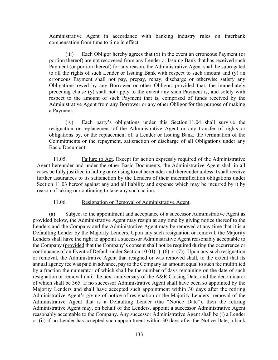 133 Administrative Agent in accordance with banking industry rules on interbank compensation from time to time in effect. (iii) Each Obligor hereby agrees that (x) in the event an erroneous Payment (or portion thereof) are not recovered from any Lender or Issuing Bank that has received such Payment (or portion thereof) for any reason, the Administrative Agent shall be subrogated to all the rights of such Lender or Issuing Bank with respect to such amount and (y) an erroneous Payment shall not pay, prepay, repay, discharge or otherwise satisfy any Obligations owed by any Borrower or other Obligor; provided that, the immediately preceding clause (y) shall not apply to the extent any such Payment is, and solely with respect to the amount of such Payment that is, comprised of funds received by the Administrative Agent from any Borrower or any other Obligor for the purpose of making a Payment. (iv) Each party’s obligations under this Section 11.04 shall survive the resignation or replacement of the Administrative Agent or any transfer of rights or obligations by, or the replacement of, a Lender or Issuing Bank, the termination of the Commitments or the repayment, satisfaction or discharge of all Obligations under any Basic Document. 11.05. Failure to Act. Except for action expressly required of the Administrative Agent hereunder and under the other Basic Documents, the Administrative Agent shall in all cases be fully justified in failing or refusing to act hereunder and thereunder unless it shall receive further assurances to its satisfaction by the Lenders of their indemnification obligations under Section 11.03 hereof against any and all liability and expense which may be incurred by it by reason of taking or continuing to take any such action. 11.06. Resignation or Removal of Administrative Agent. (a) Subject to the appointment and acceptance of a successor Administrative Agent as provided below, the Administrative Agent may resign at any time by giving notice thereof to the Lenders and the Company and the Administrative Agent may be removed at any time that it is a Defaulting Lender by the Majority Lenders. Upon any such resignation or removal, the Majority Lenders shall have the right to appoint a successor Administrative Agent reasonably acceptable to the Company (provided that the Company’s consent shall not be required during the occurrence or continuance of an Event of Default under Section 10.01(1), (6) or (7)). Upon any such resignation or removal, the Administrative Agent that resigned or was removed shall, to the extent that its annual agency fee was paid in advance, pay to the Company an amount equal to such fee multiplied by a fraction the numerator of which shall be the number of days remaining on the date of such resignation or removal until the next anniversary of the A&R Closing Date, and the denominator of which shall be 365. If no successor Administrative Agent shall have been so appointed by the Majority Lenders and shall have accepted such appointment within 30 days after the retiring Administrative Agent’s giving of notice of resignation or the Majority Lenders’ removal of the Administrative Agent that is a Defaulting Lender (the “Notice Date”), then the retiring Administrative Agent may, on behalf of the Lenders, appoint a successor Administrative Agent reasonably acceptable to the Company. Any successor Administrative Agent shall be (i) a Lender or (ii) if no Lender has accepted such appointment within 30 days after the Notice Date, a bank